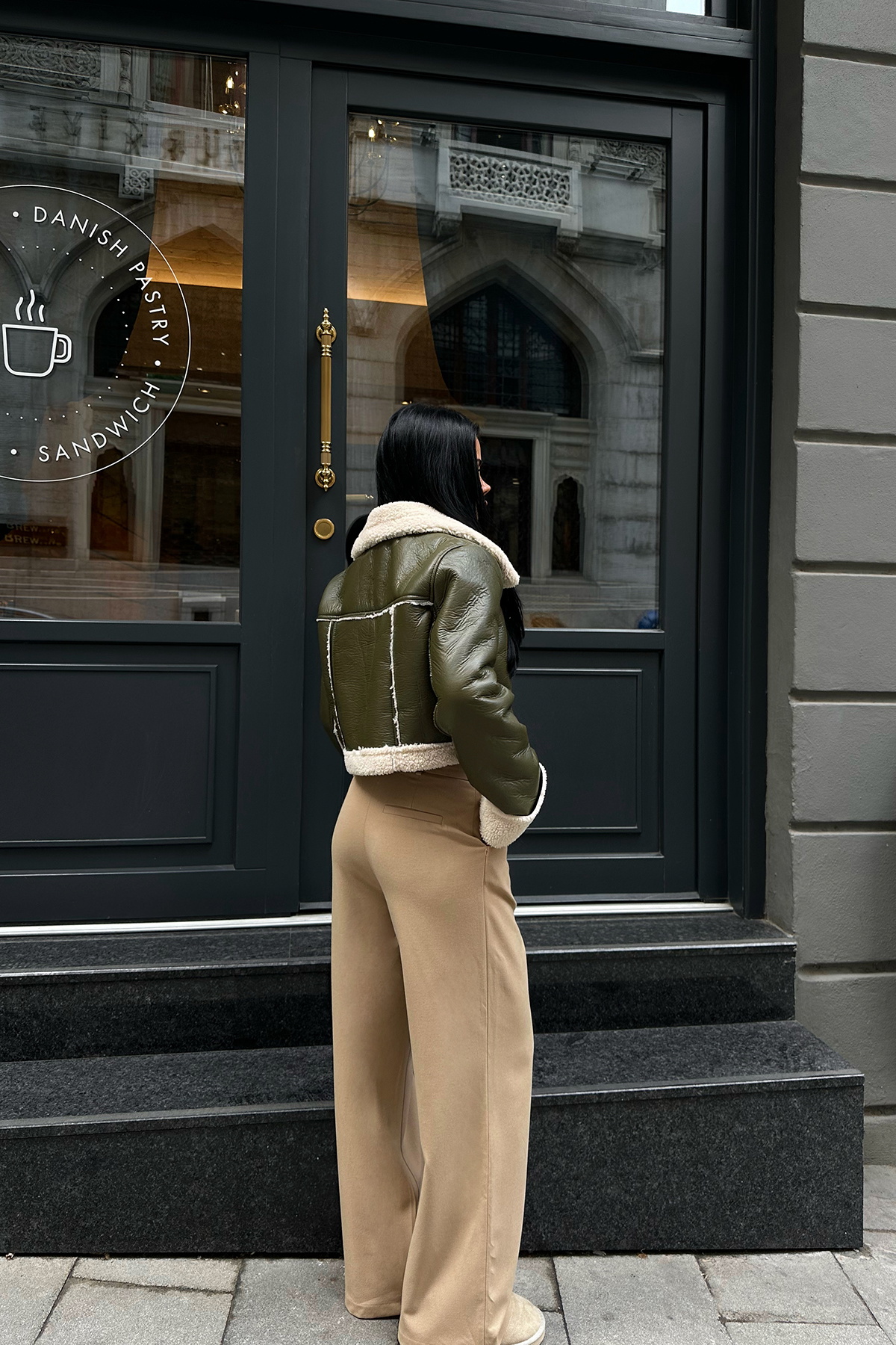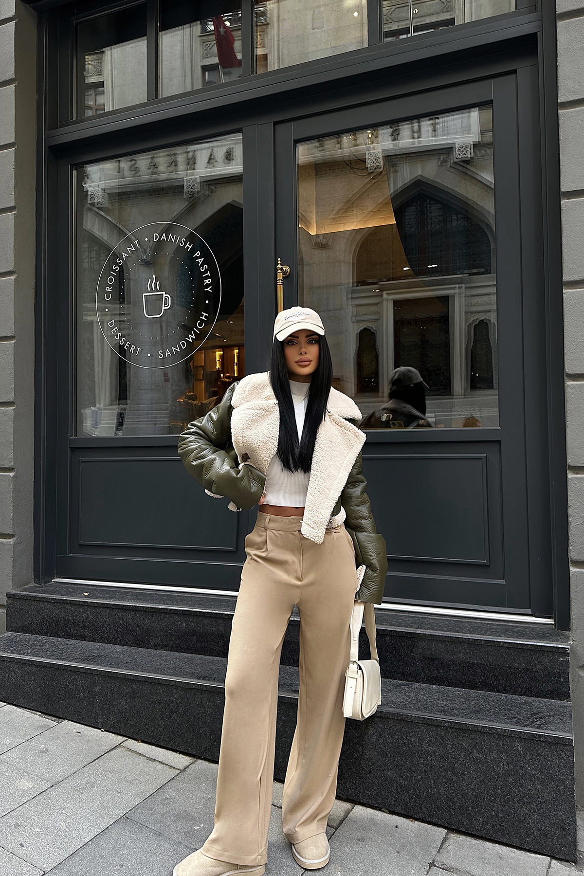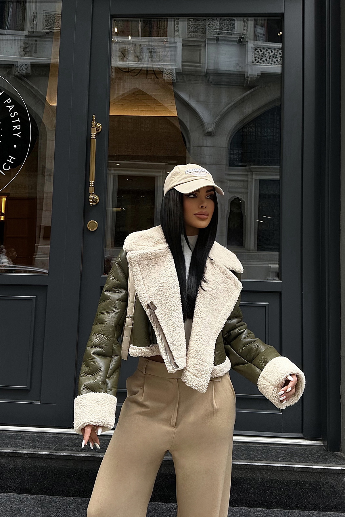 Haki Deri Yün Detay Biker Ceket – Modern ve Karizmatik