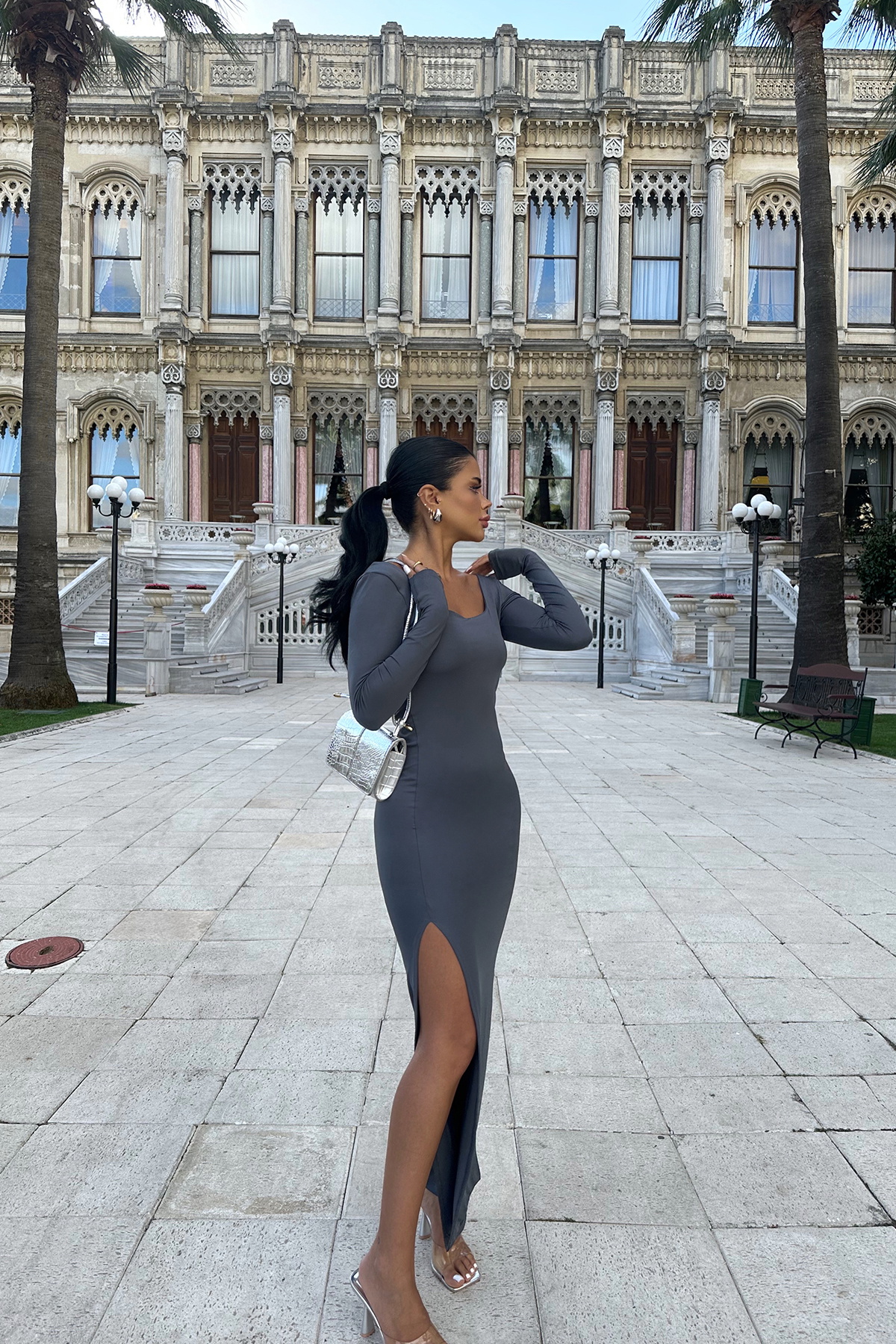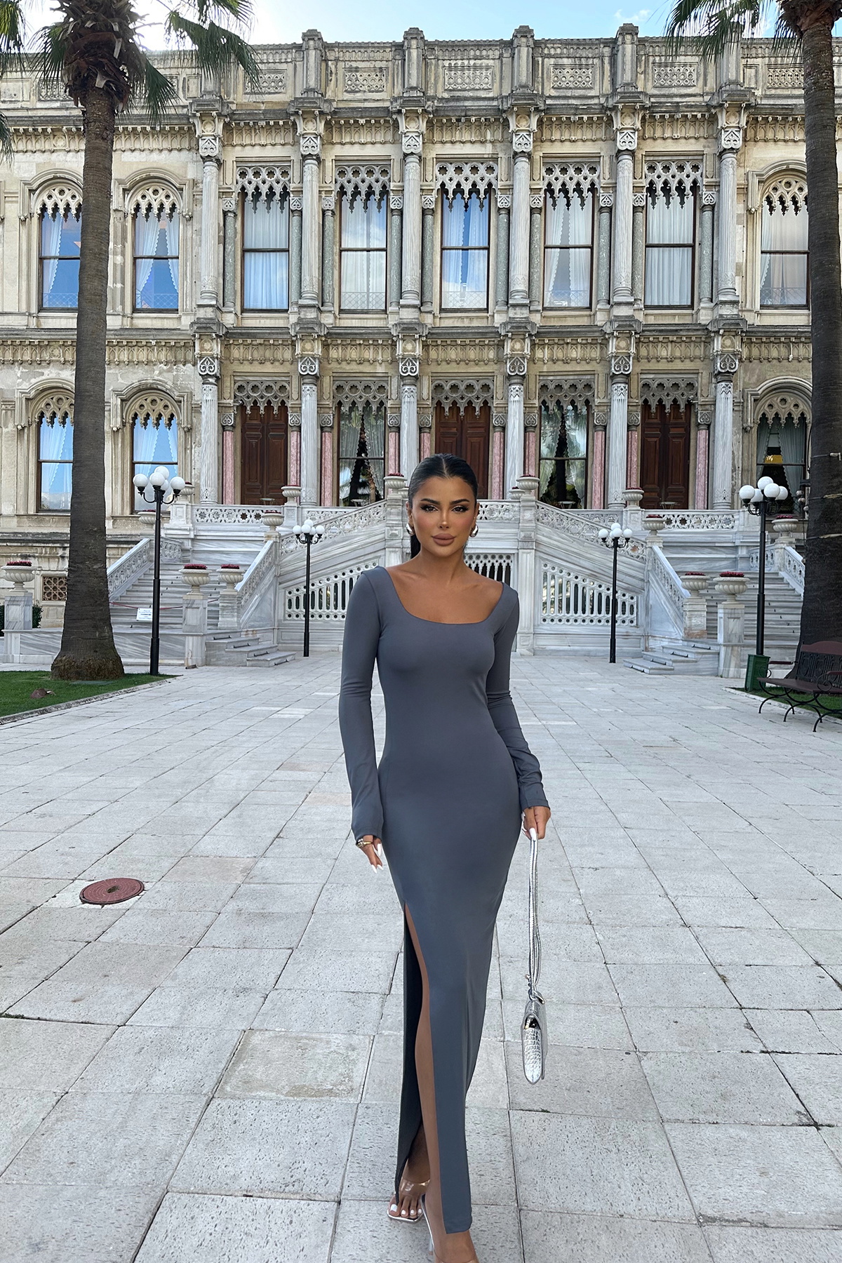 İndigo Kare Yaka Yırtmaçlı Uzun Elbise ATE8484