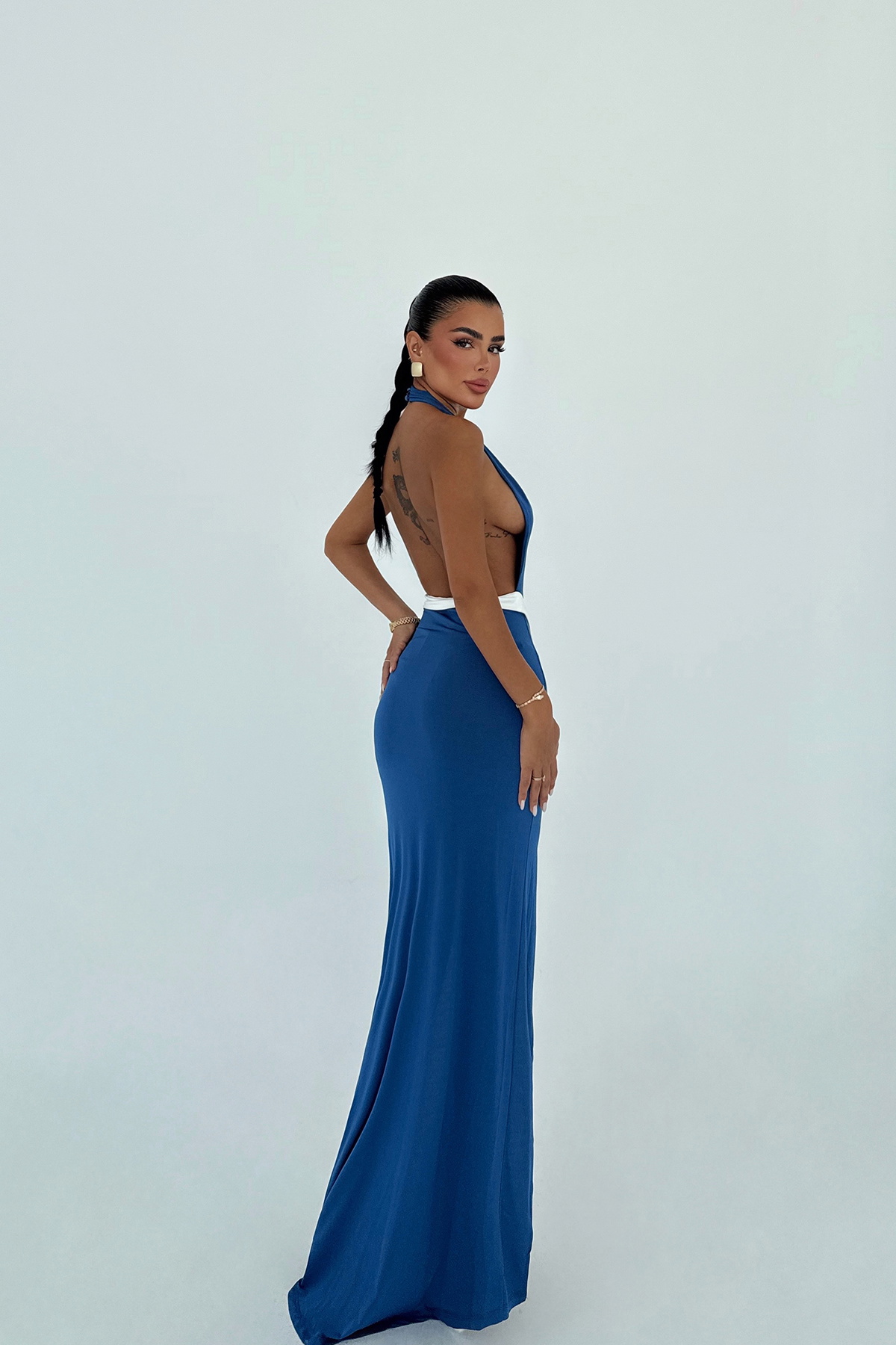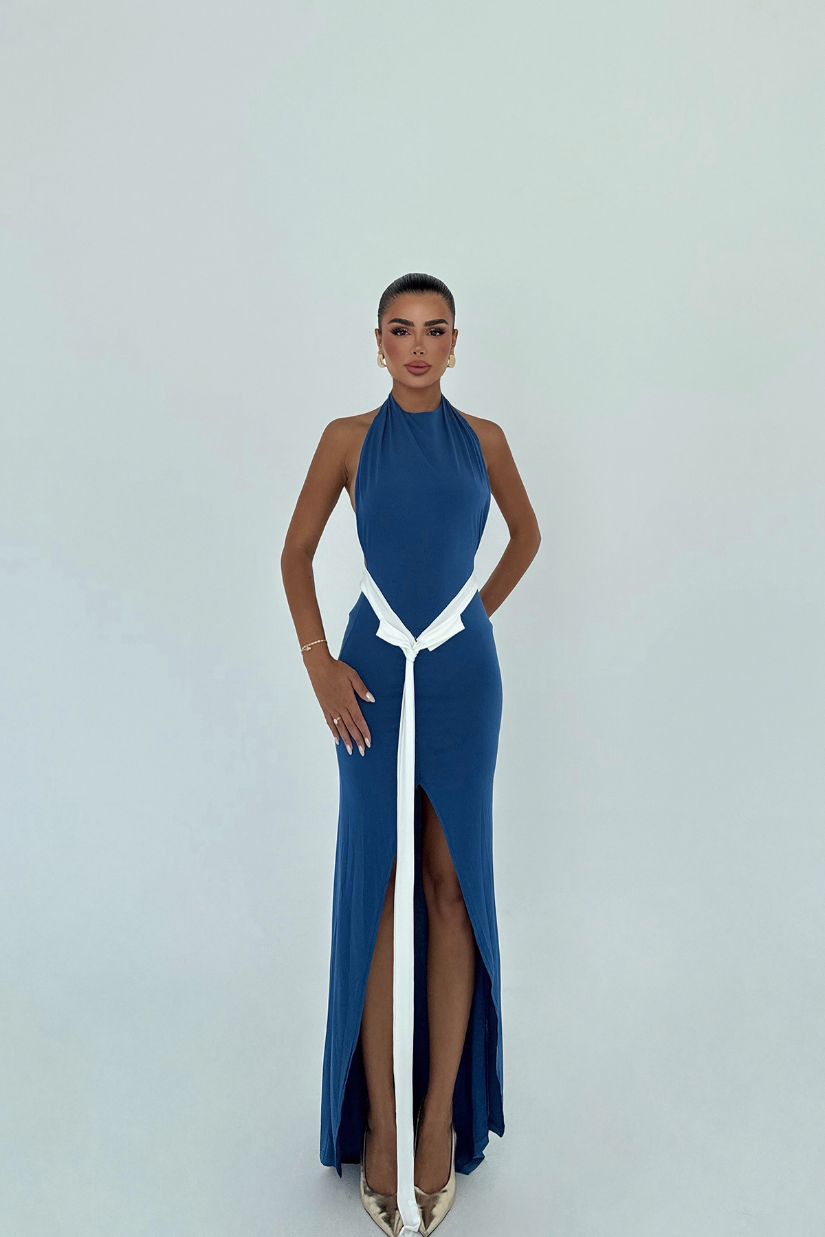 İndigo Giselle Fiyonk Detaylı Yırtmaçlı Elbise