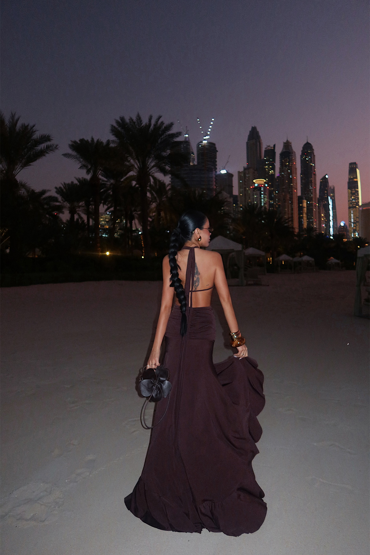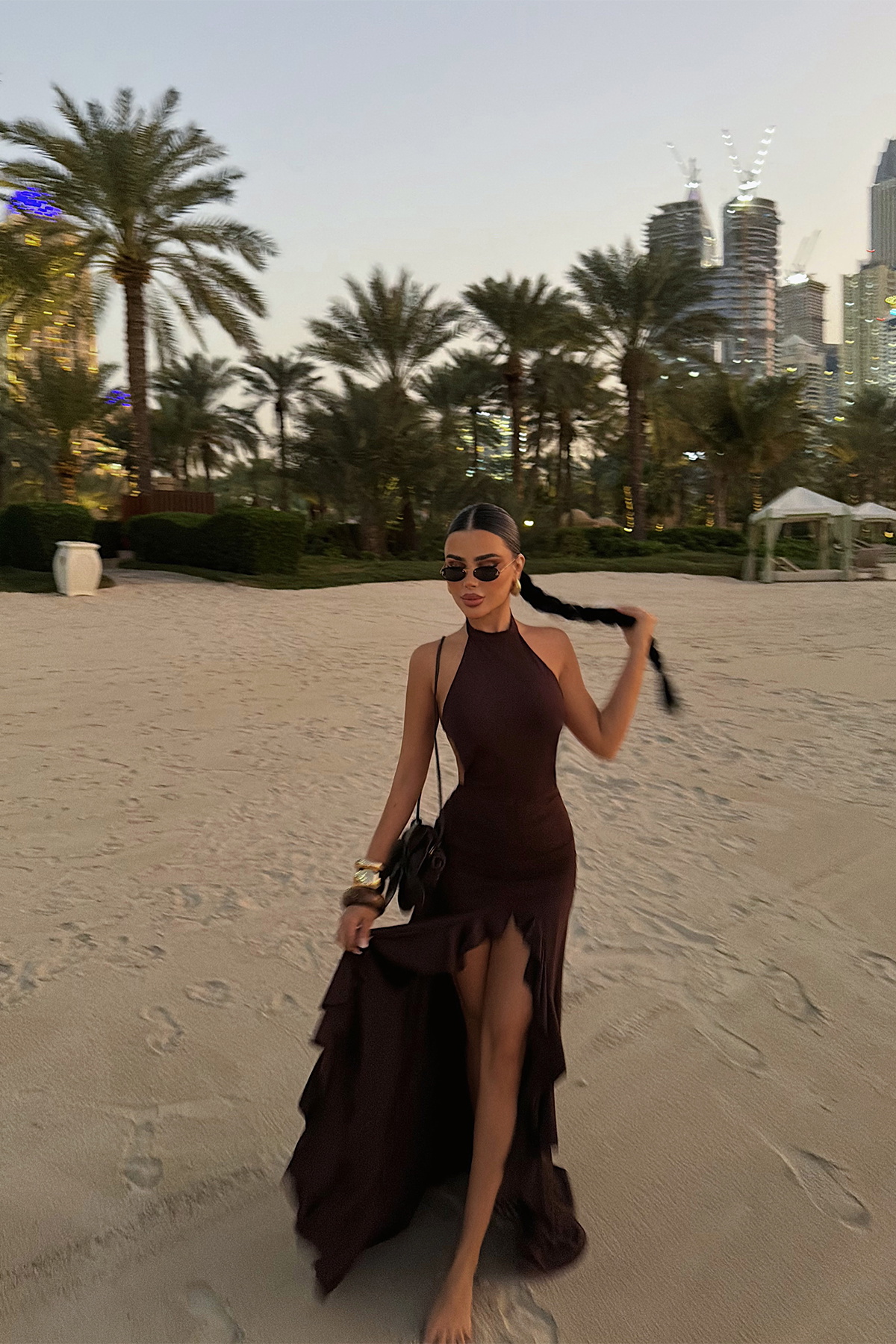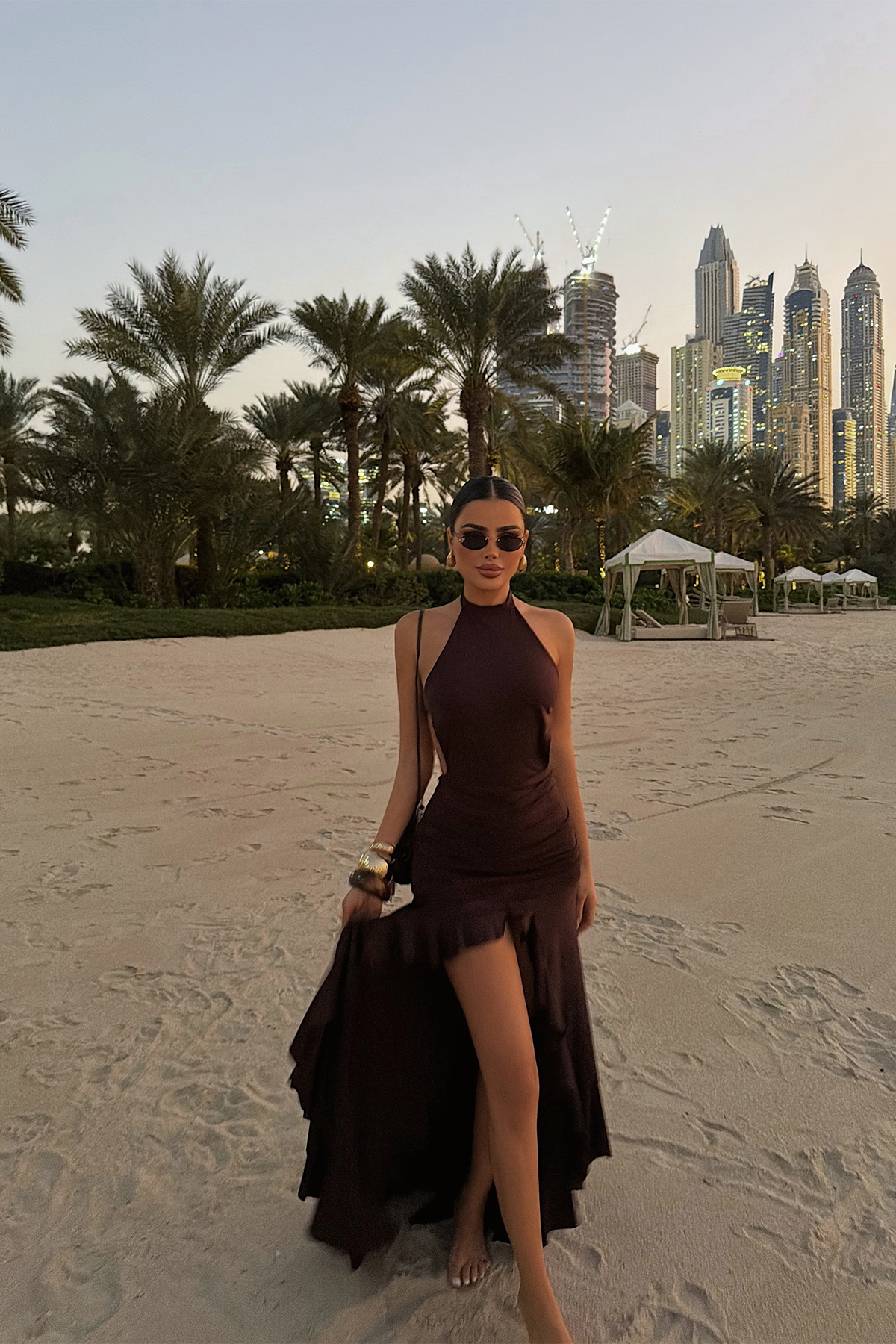 Modern halter yaka tasarımı ve vücuda oturan formuyla öne çıkan bu uzun elbise, feminen duruşu güçlü bir şıklıkla buluşturur. Belden aşağı doğru akışkan şekilde inen etek formu, yürüyüş sırasında doğal bir hareket sağlarken; yırtmaç detayı elbiseye zarif ve iddialı bir hava katar.