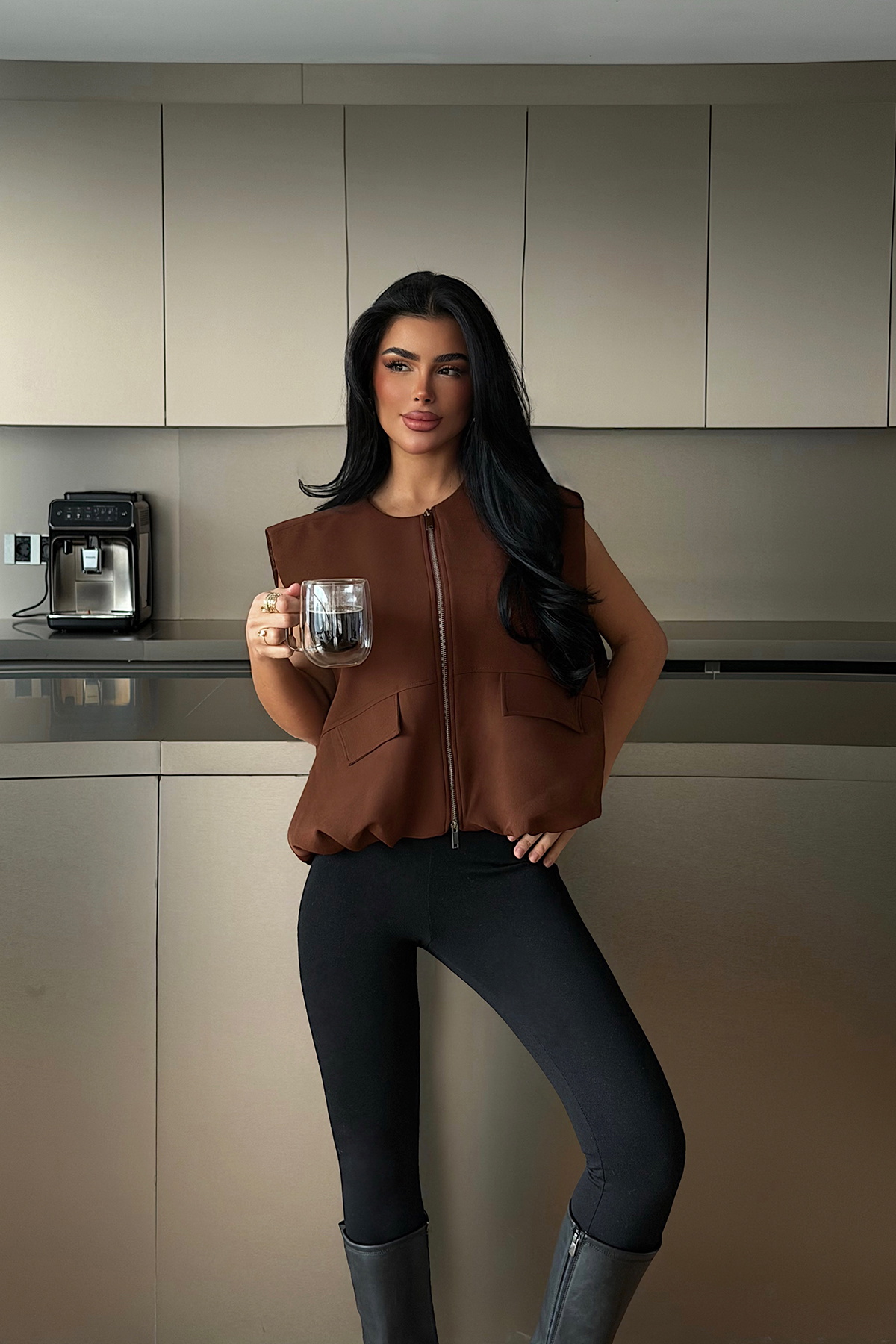 Fermuarlı tasarımı ve tok duruşuyla öne çıkan yelek, sade ve modern bir siluet sunar. Rahat kesimi sayesinde günlük kombinlerden şehir stiline kadar çok yönlü kullanım sağlarken, katmanlı kombinler için pratik ve stil sahibi bir parçadır