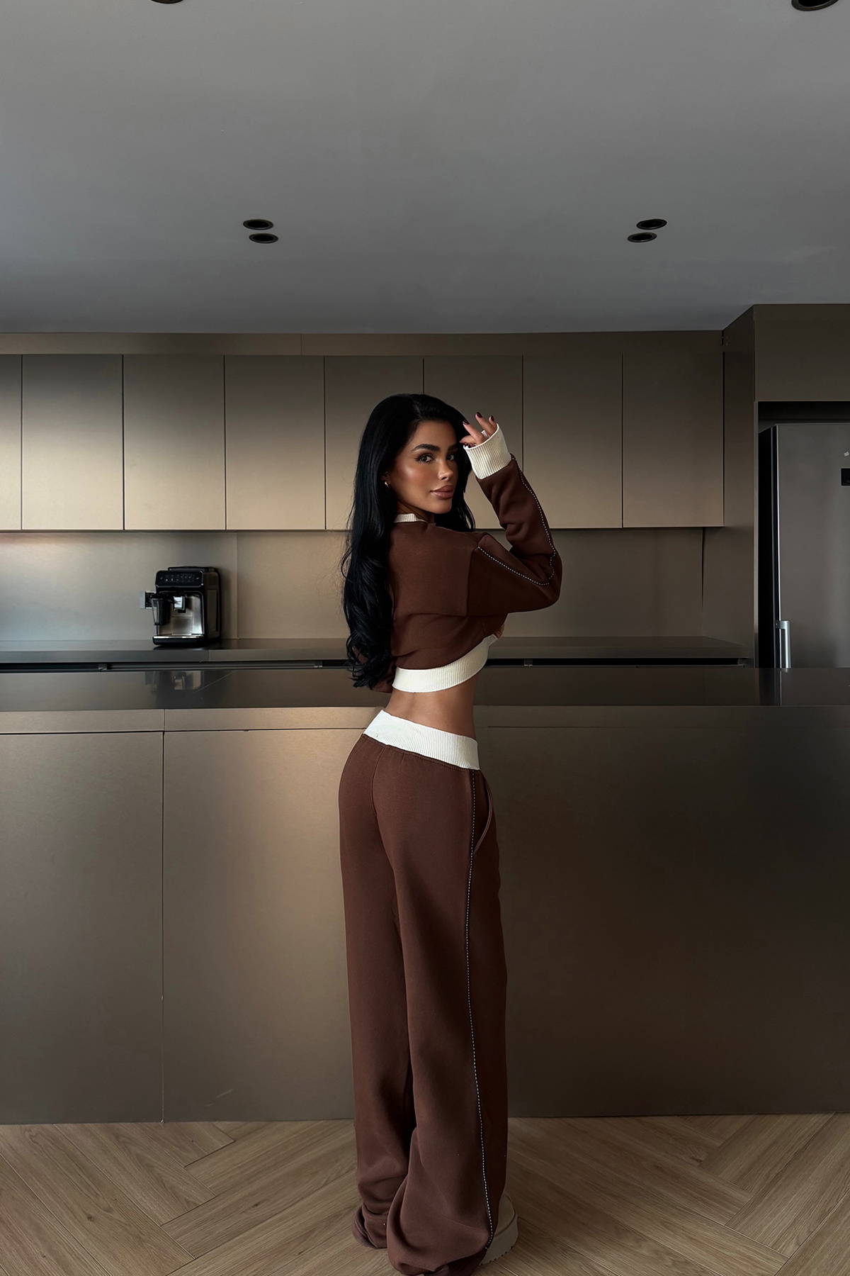 Zeminde sıcak bir kahverengi tonuyla tasarlanmış olan bu takım, çift renk detaylarıyla stilinize dikkat çekici bir vurgu katıyor. Üst parçası sade ve temiz çizgilere sahip; alt parçası ise kontrast renk bloklarıyla dinamik bir görünüm sunuyor.