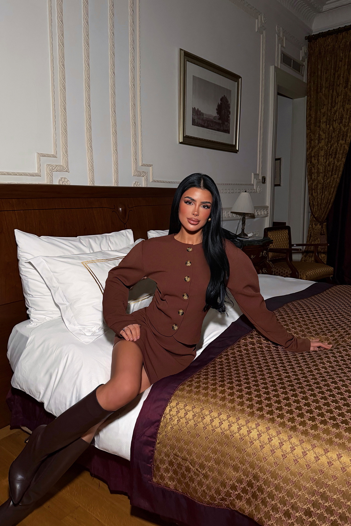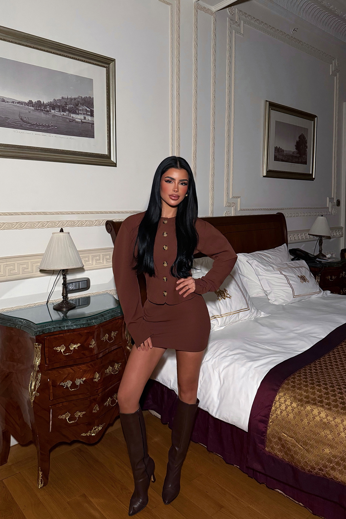 Ceket ve mini etekten oluşan bu takım, vücudu saran formu ile feminen bir siluet sunar. Ön yüzeydeki düğme detayları tasarıma şık bir vurgu katarken, tok dokulu kumaşı sayesinde formunu koruyan düzgün bir duruş sağlar.