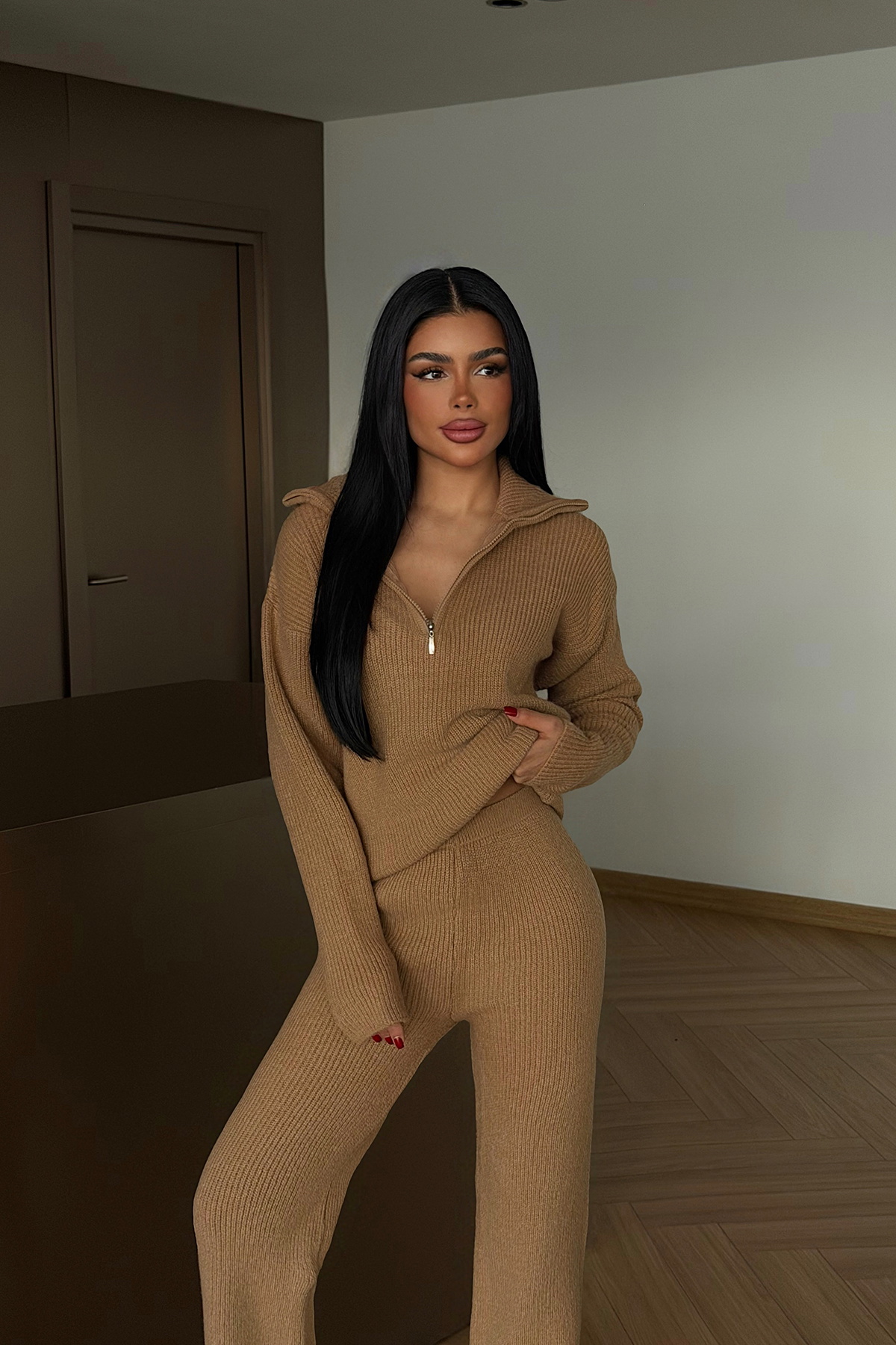 Bu modern takım, kahverengi renginin zarif duruşu ve fermuar detaylarıyla hem gündelik stilinize sportif bir dokunuş katıyor hem de konforu ön planda tutuyor. Gün içinde rahatça hareket etmek isteyenler için ideal bir seçim.