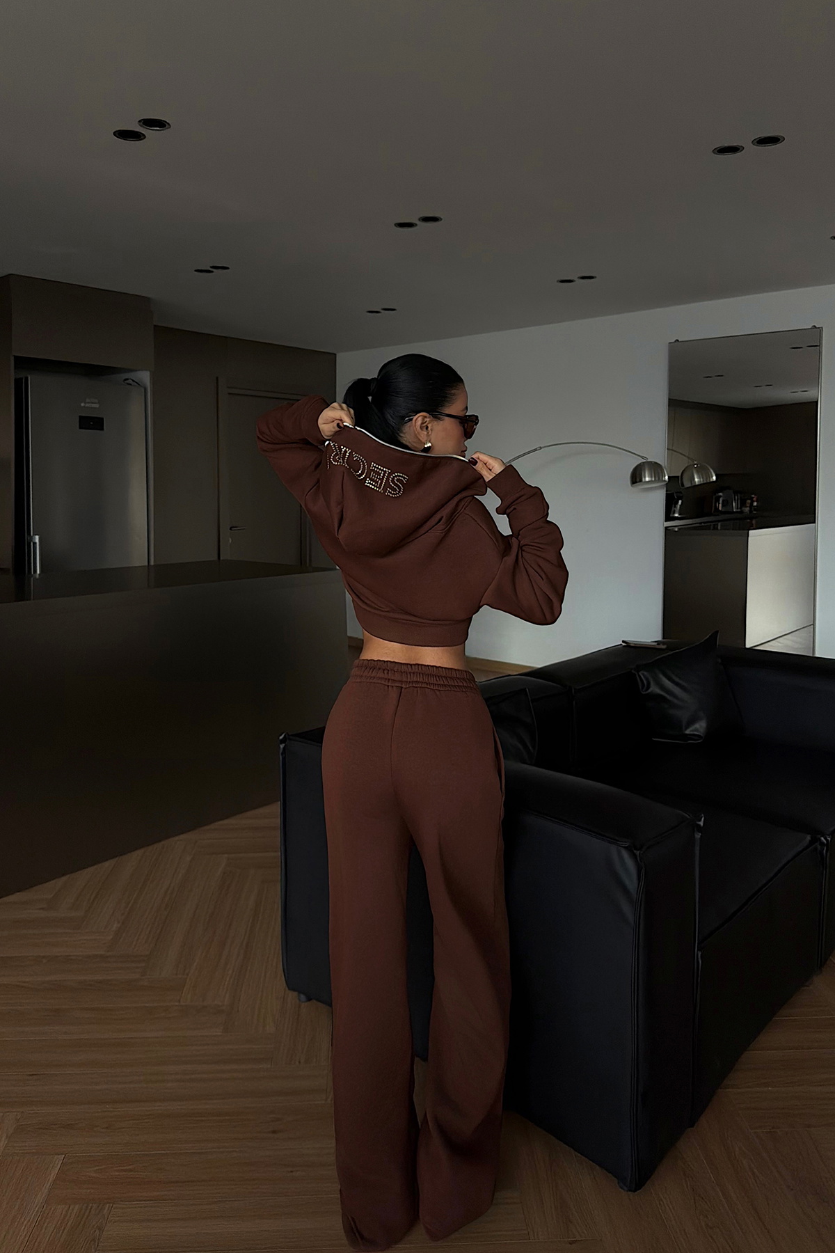 Zengin kahverengi tonuyla tasarlanmış bu eşofman takımı, önde yer alan fermuar detayı sayesinde modern ve fonksiyonel bir hava sunar. Üst parça rahat ve uyumlu bir kesimde, alt parça ise düz paçalı yapısıyla gündüzden geceye konfor sağlar.