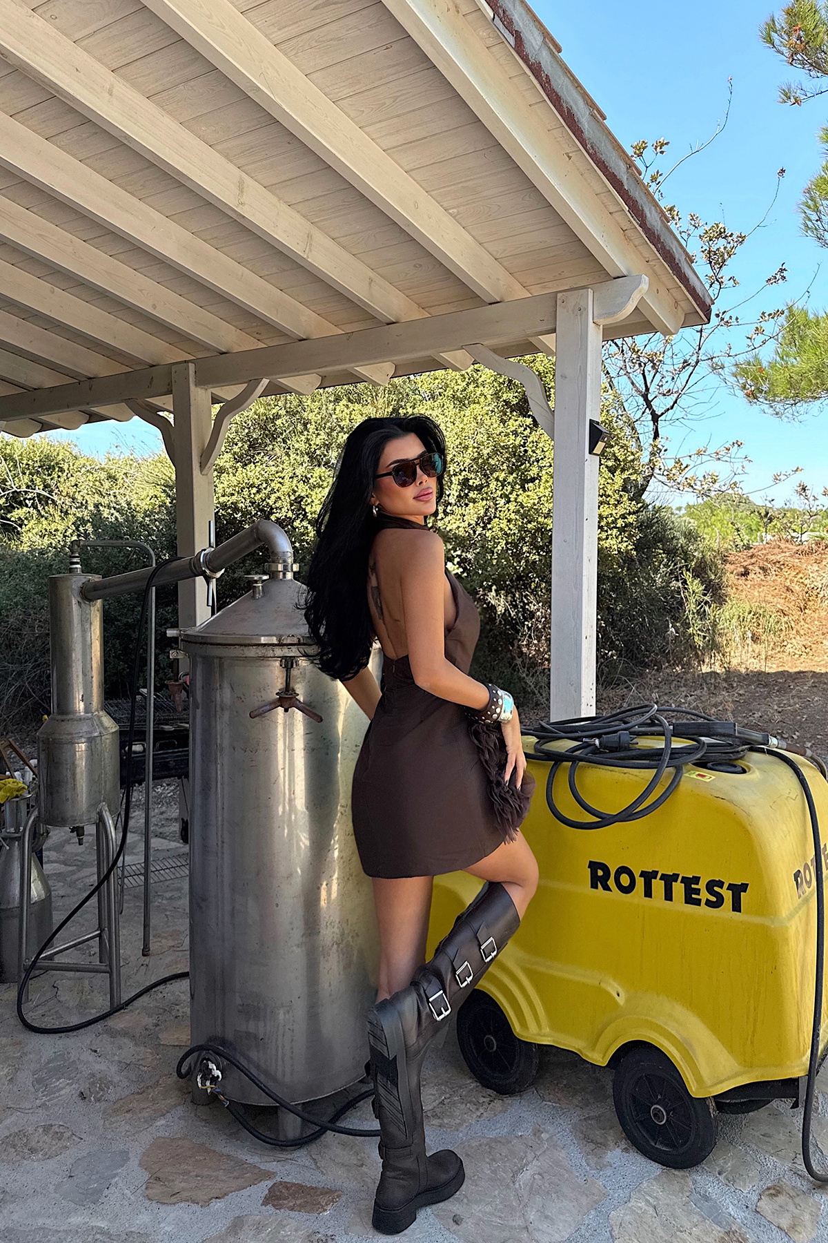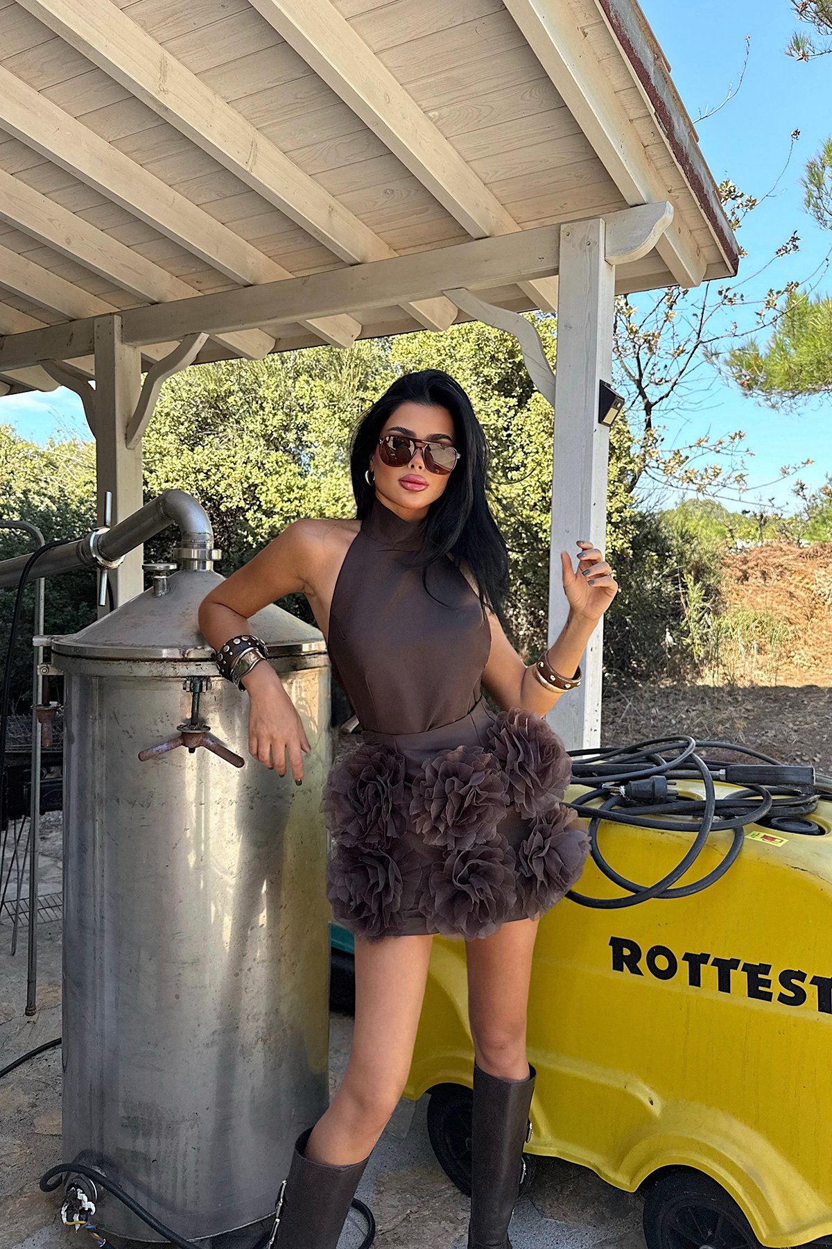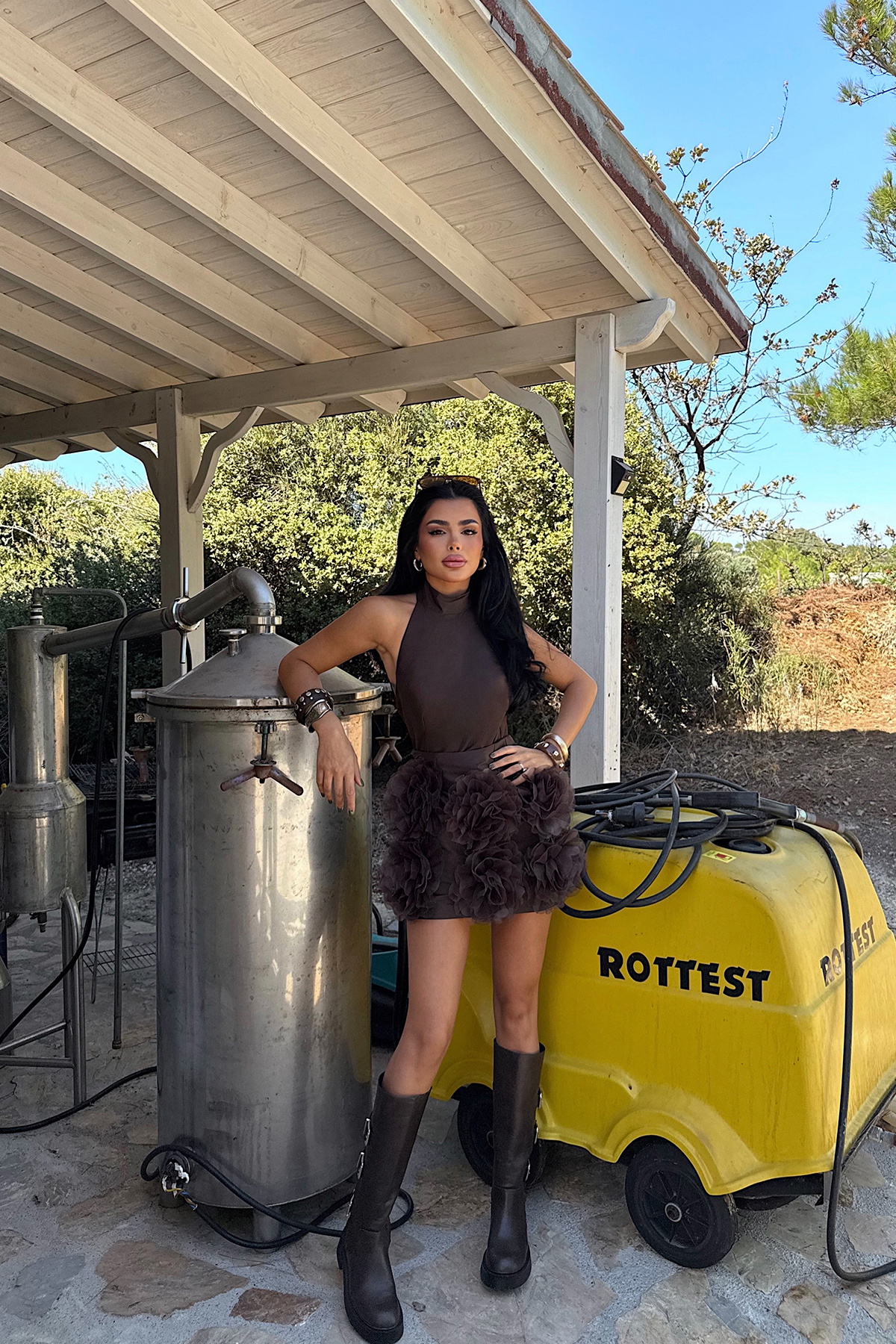 Toprak tonlarının sıcaklığını etek ucundaki gül detayıyla romantik bir şekilde buluşturan kahverengi Freyya mini elbise, zarif ve özgün bir stil sunar. Günlük şıklıkta doğal bir zarafet arayanlar için ideal olduğu gibi, özel buluşmalarda da feminen bir görünüm kazandırır.