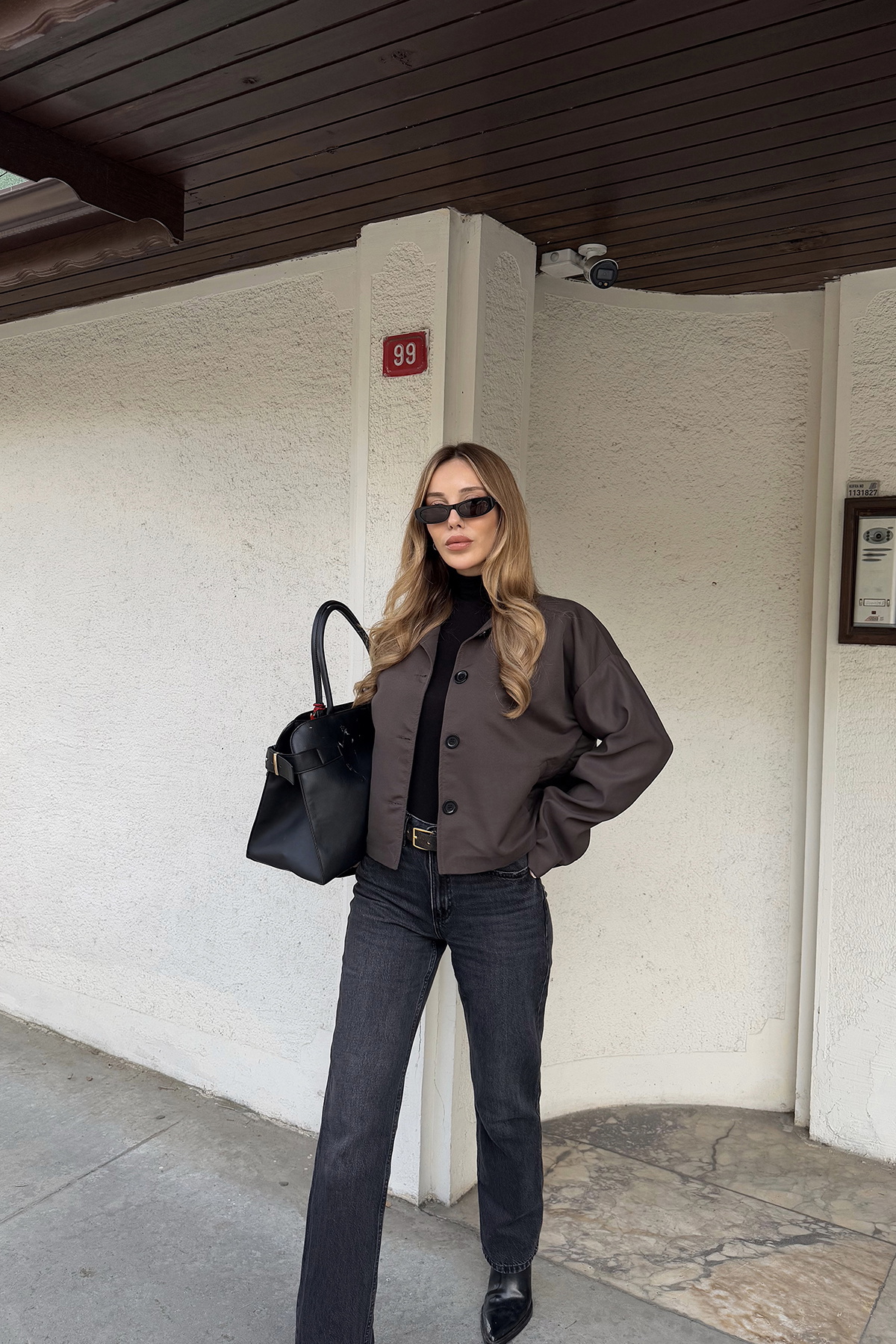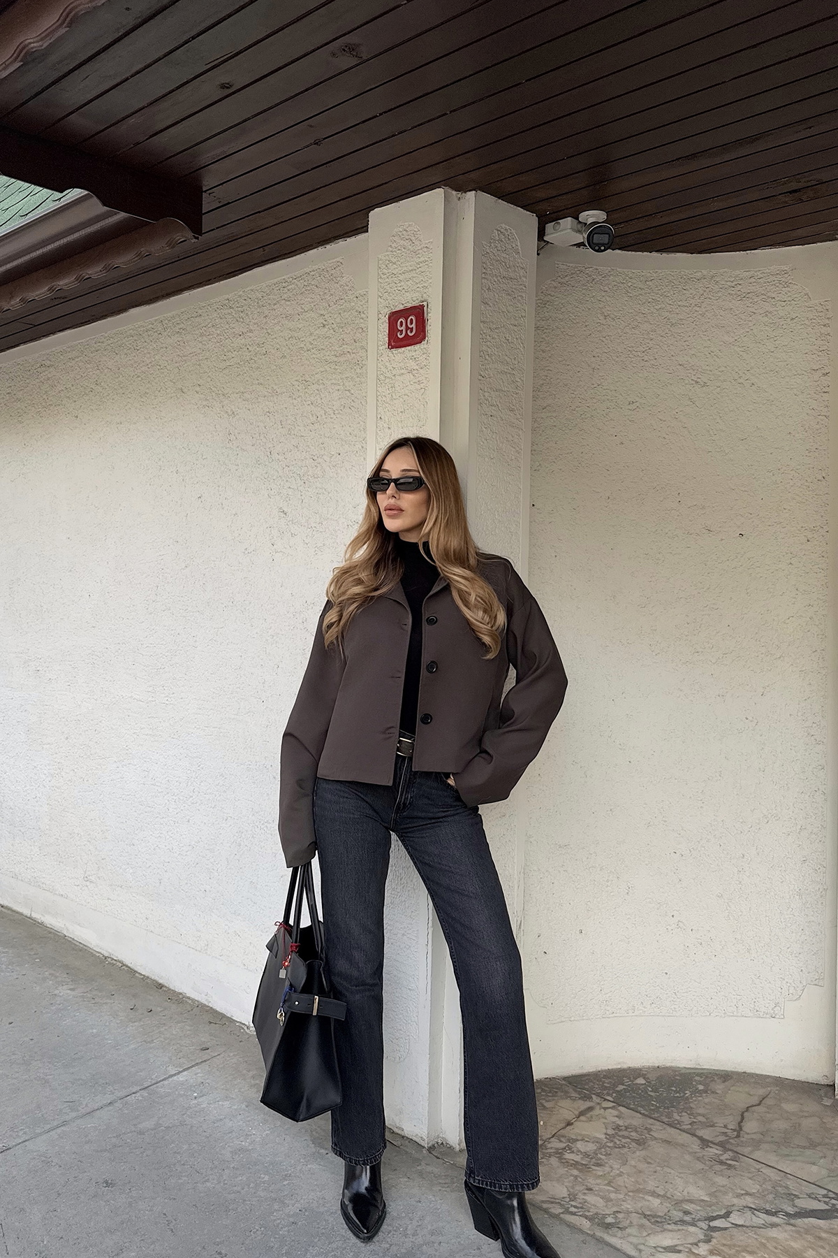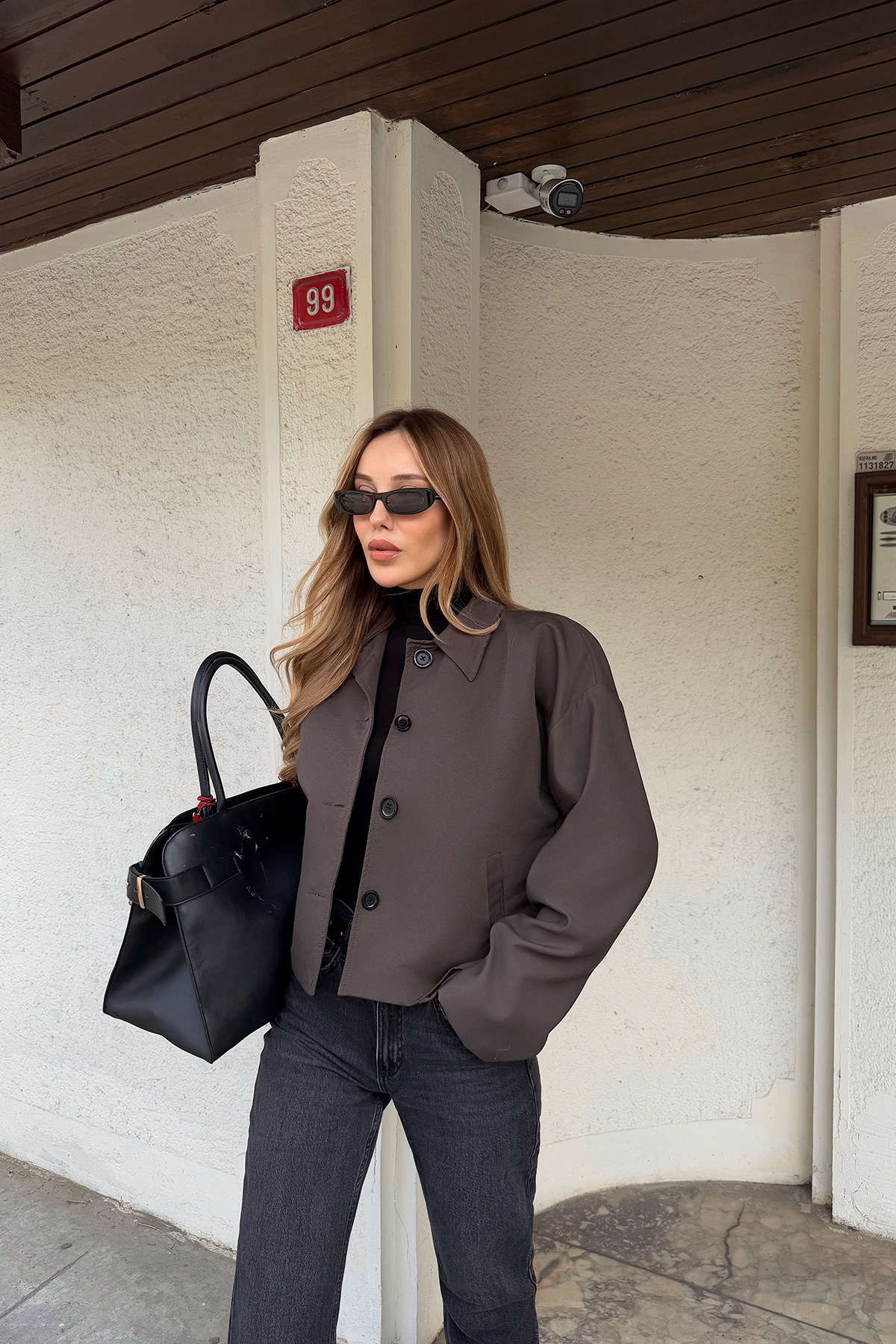 Düğmeli tasarımı ve kısa kesimiyle öne çıkan ceket, tok dokulu yapısı sayesinde modern ve net bir siluet sunar. Geniş yaka formu ve rahat kalıbı şehir stilinde hem günlük hem de şık kombinlerle kolayca uyum sağlar.