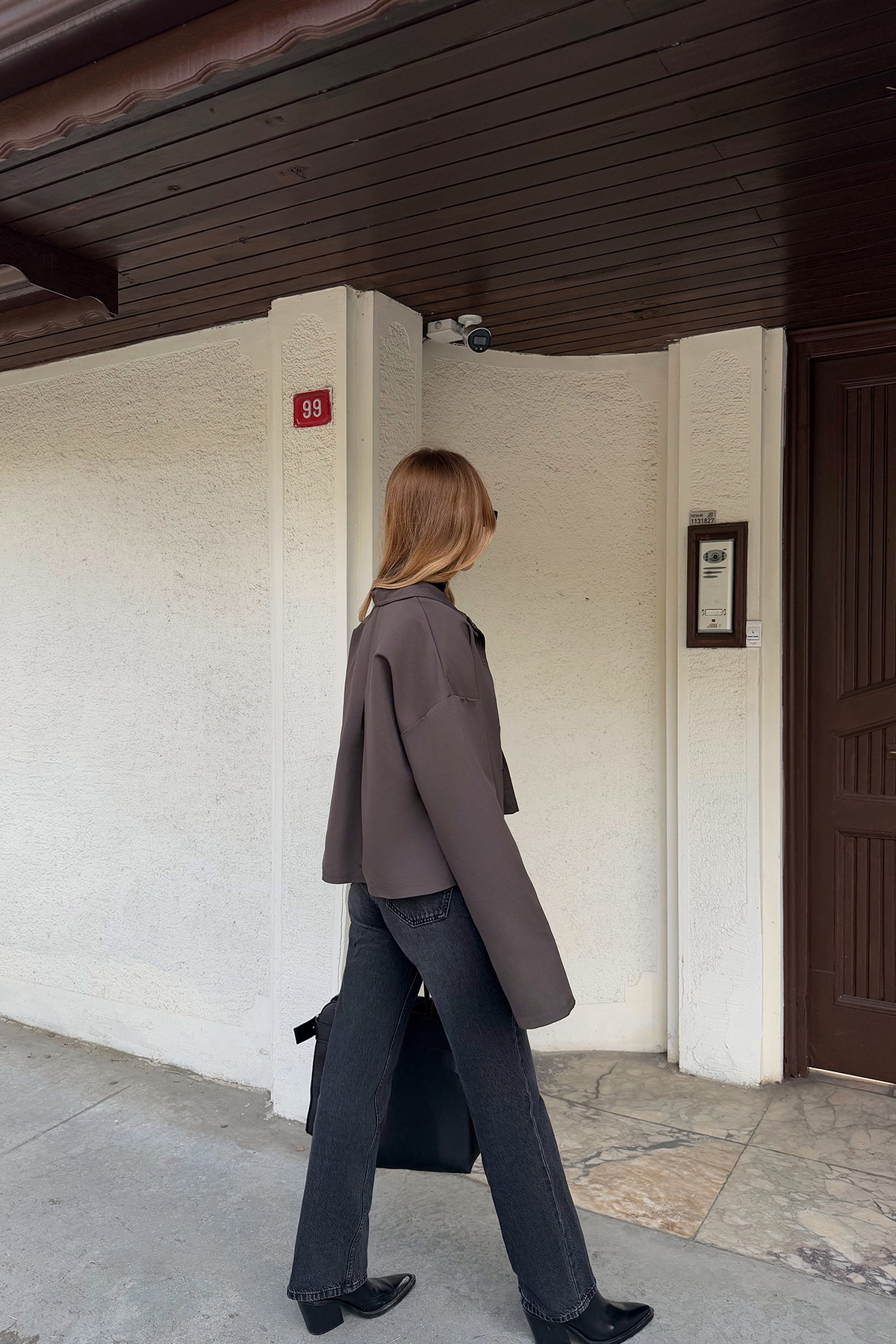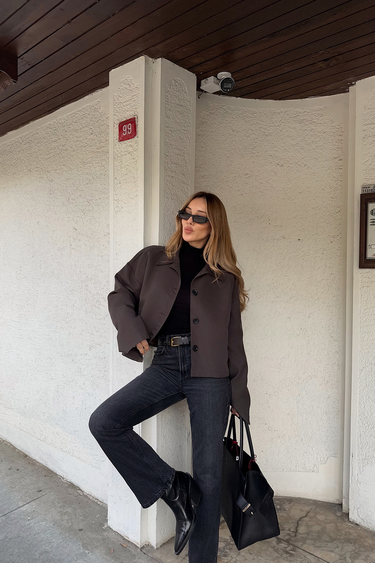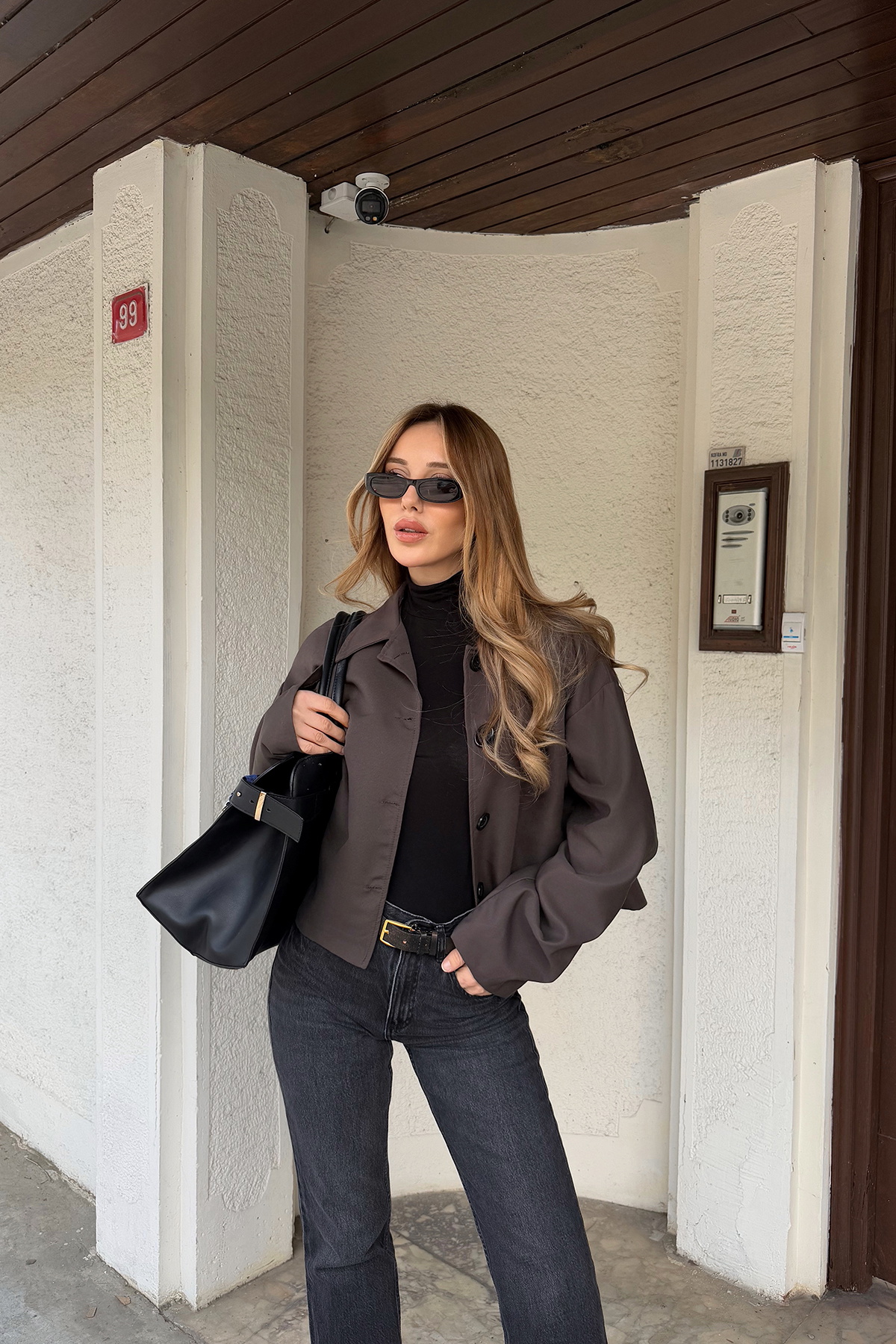 Düğmeli tasarımı ve kısa kesimiyle öne çıkan ceket, tok dokulu yapısı sayesinde modern ve net bir siluet sunar. Geniş yaka formu ve rahat kalıbı şehir stilinde hem günlük hem de şık kombinlerle kolayca uyum sağlar.