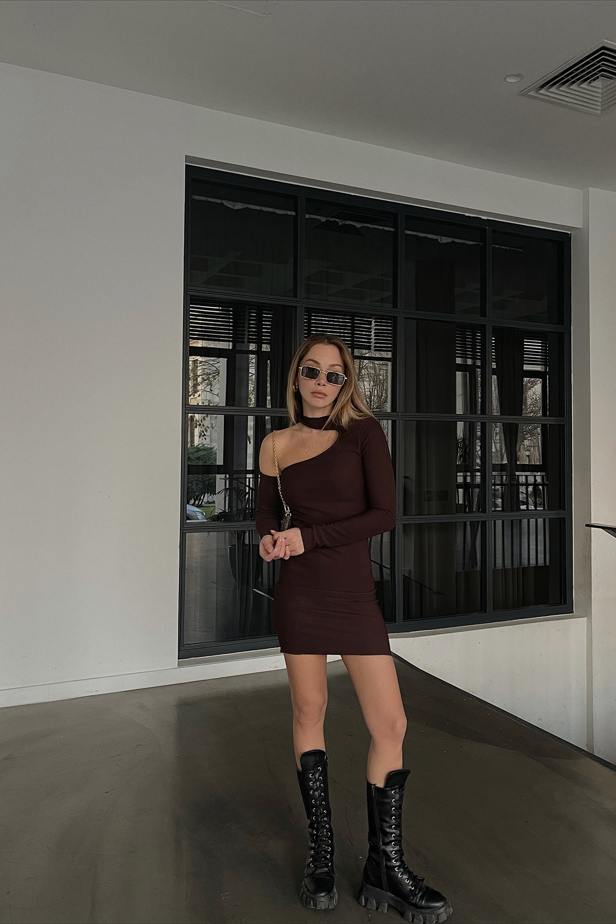 Kahverengi Pencere Detay Fitilli Mini Elbise
