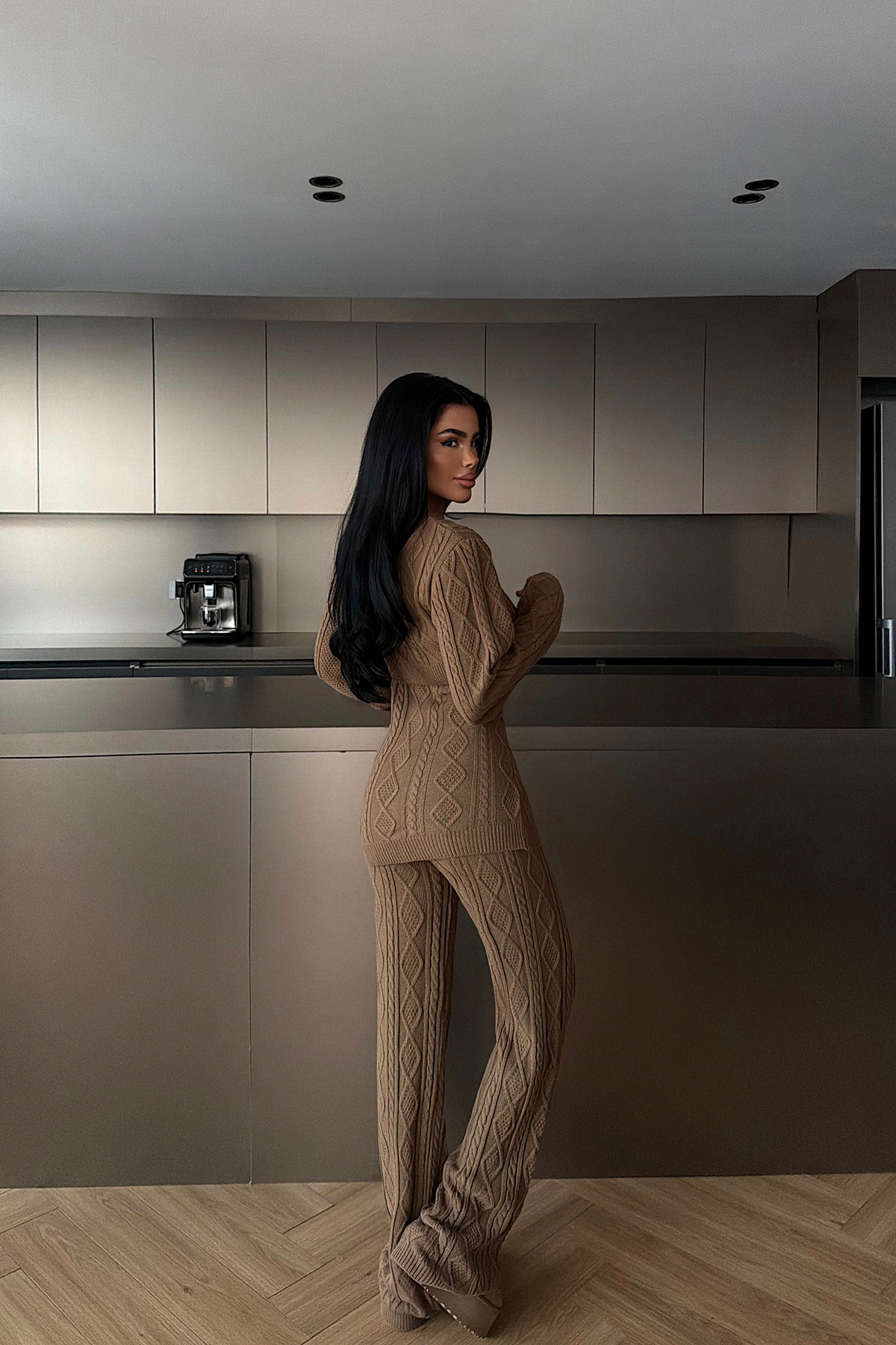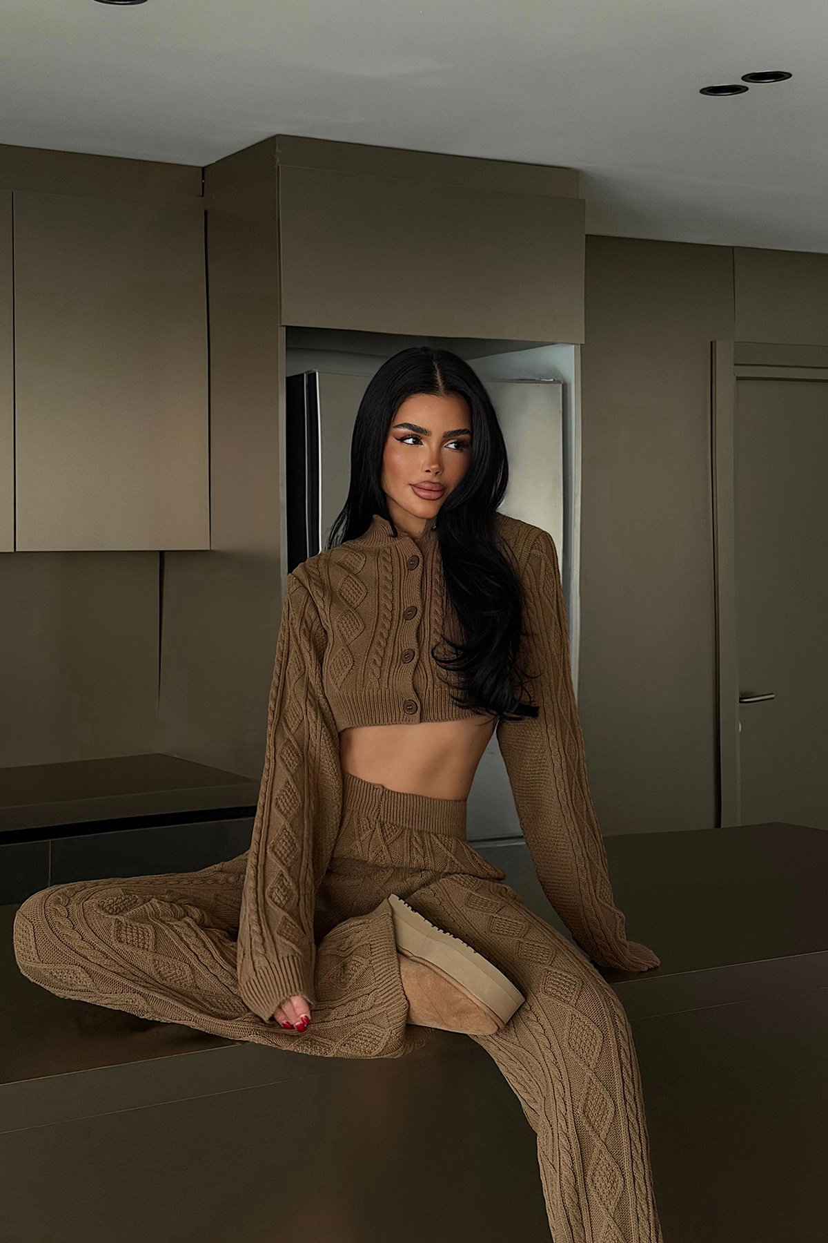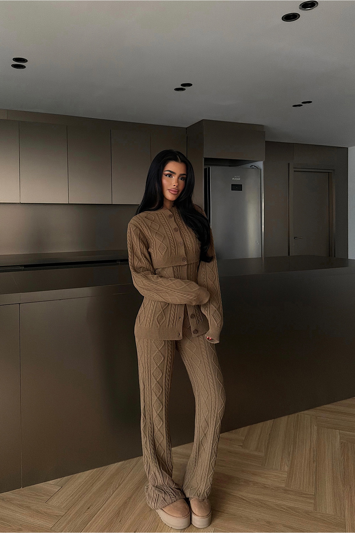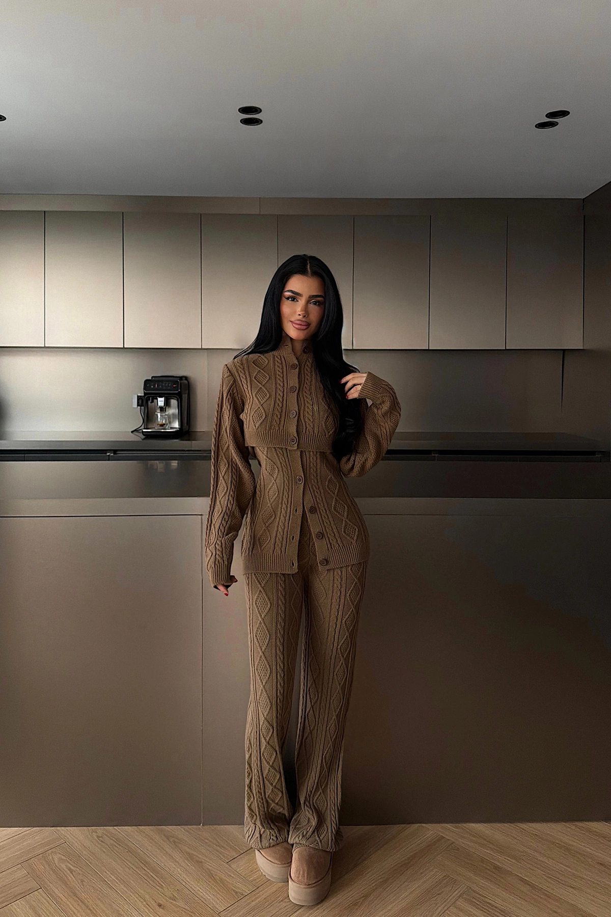 Üst parça, önden düğme kapamalı yapısı, tasarımı dengelerken, uzun kollu formu triko dokuyu ön plana çıkarır. Bel kısmındaki parça hafif oturan yapısıyla silueti toparlayan bir görünüm sunar. Pantolon ise düz paça kesimi ve örgü dokusuyla üst parça ile uyumlu bir bütünlük oluşturur.