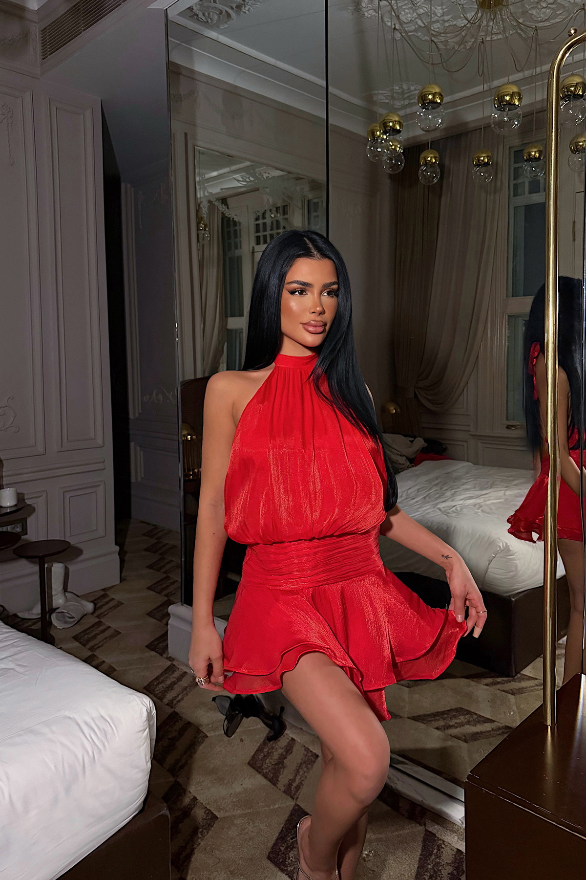 Boyundan bağlamalı yaka formu ve ışıltılı dokusuyla öne çıkan mini elbise, volanlı etek detayıyla hareketli ve feminen bir siluet sunar. Bel kısmındaki oturan form vücut hatlarını dengelerken, özel davetler ve gece kombinleri için şık ve iddialı bir görünüm sağlar.