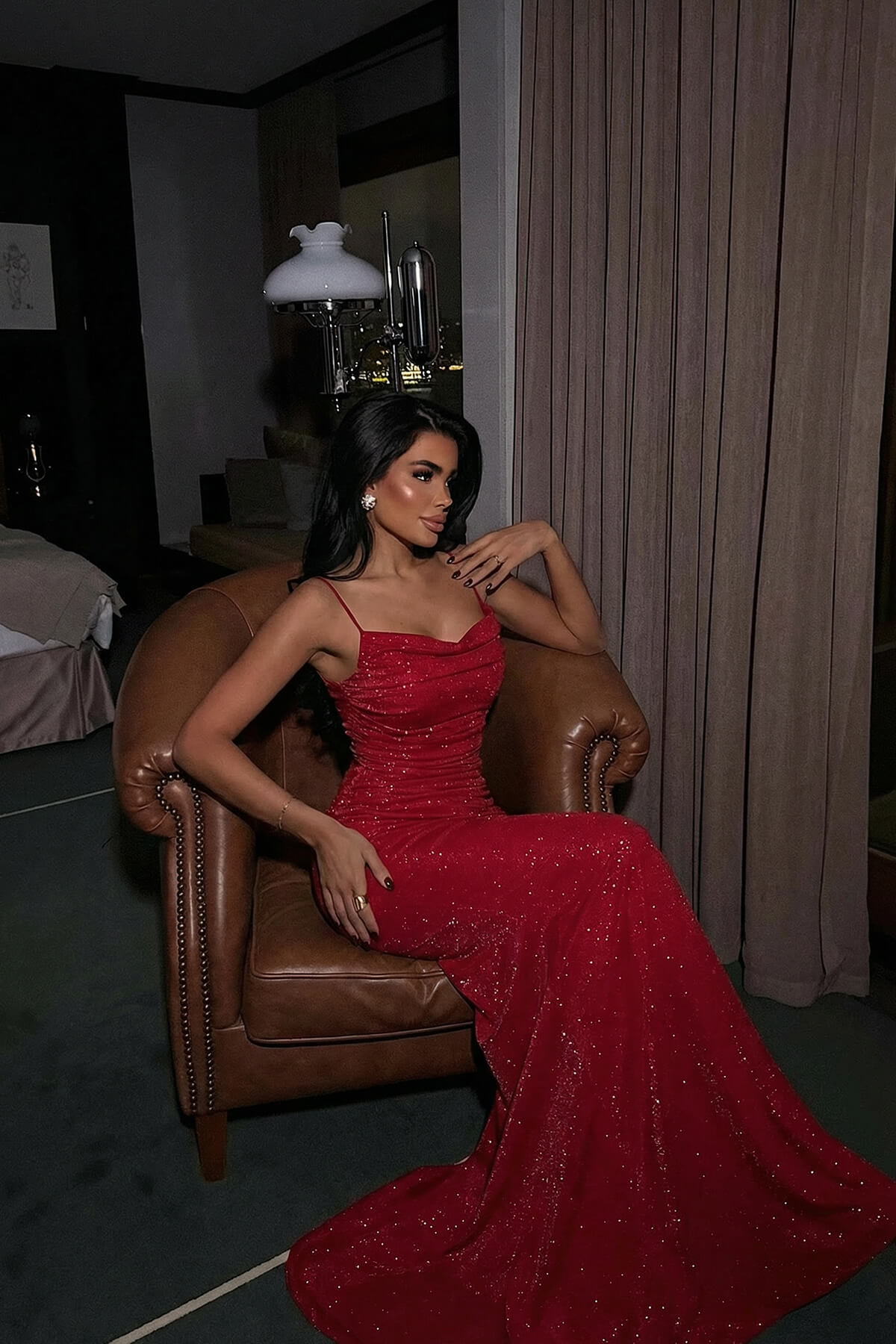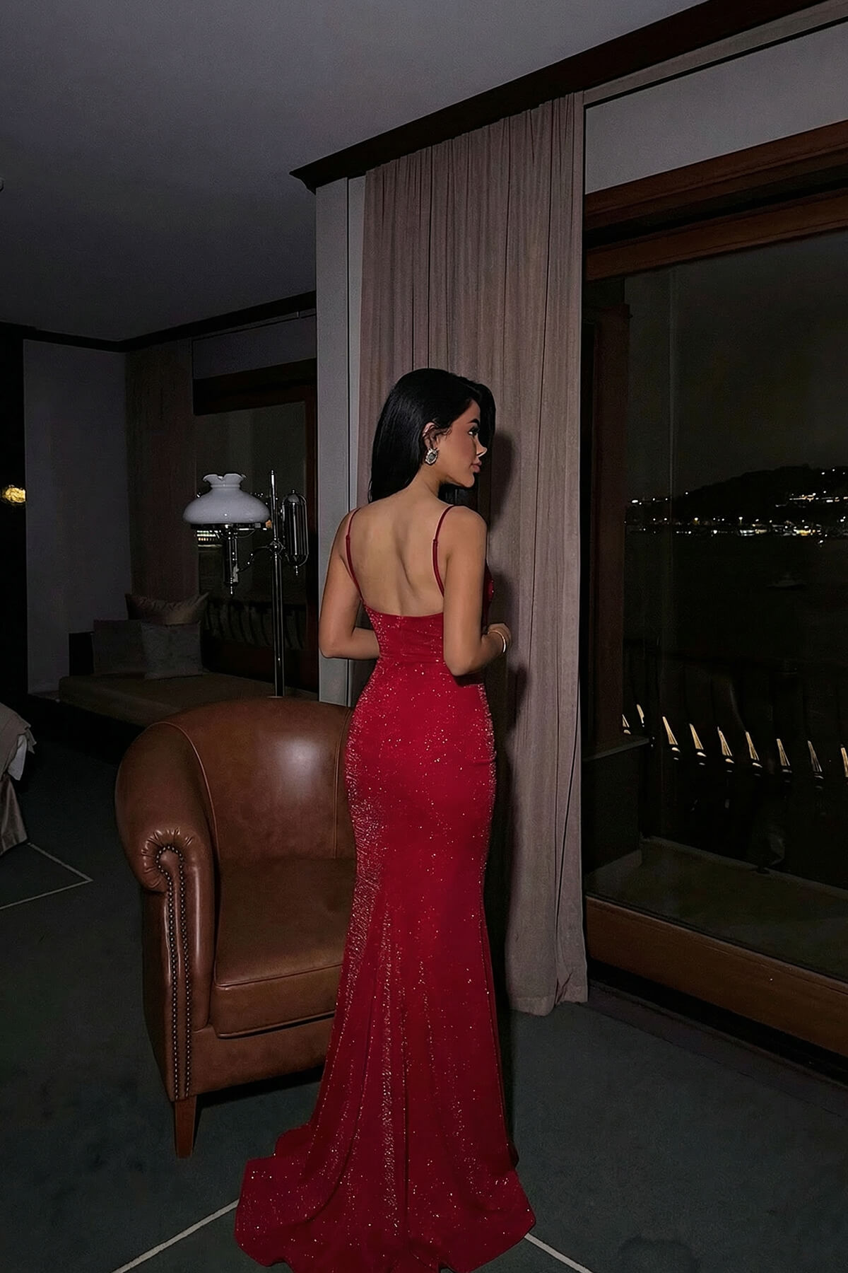 Askılı kesimi ve vücuda oturan formuyla zarif bir siluet sunan uzun abiye elbise, simli dokusuyla ışıltılı ve şık bir görünüm kazandırır. Üst kısmın sade ve feminen duruşu, etek bölümündeki akıcı form ile dengelenerek özel davetler ve gece organizasyonları için etkileyici bir stil oluşturur.