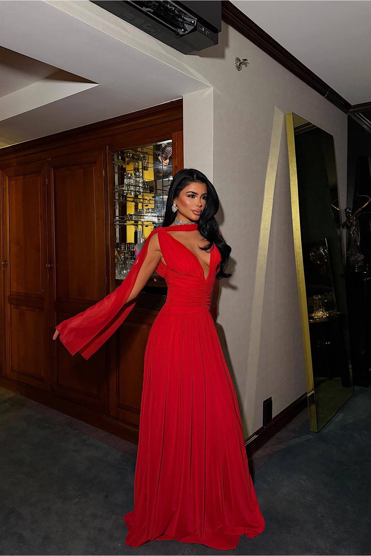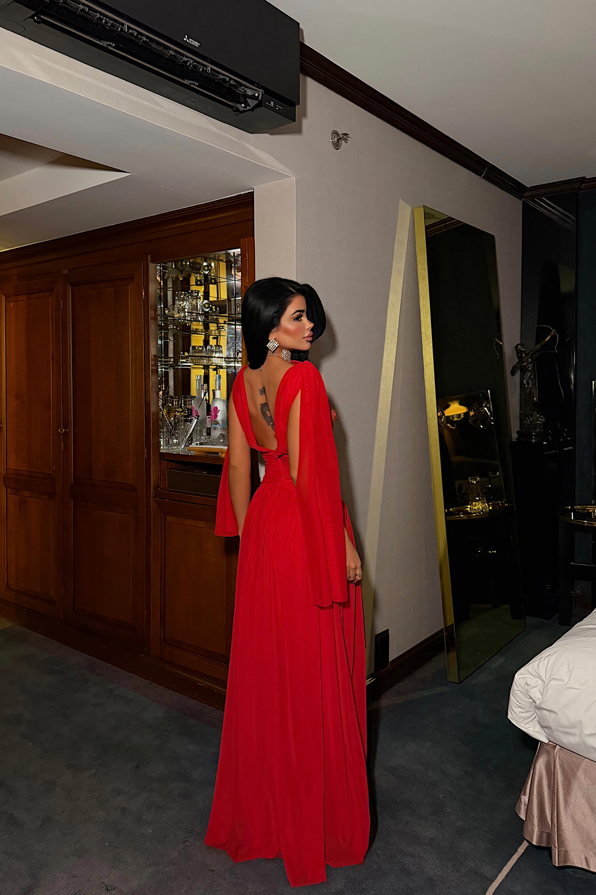 Kırmızı tonuyla feminen ve zarif bir görünüm sunar. Elbise, büzgü detaylarıyla vücut hatlarını nazikçe vurgular. Kumaşı yumuşak, akışkan ve dökümlü bu sayede elbise, hem zarif duruşu hem de rahat hareket imkânı sağlar.