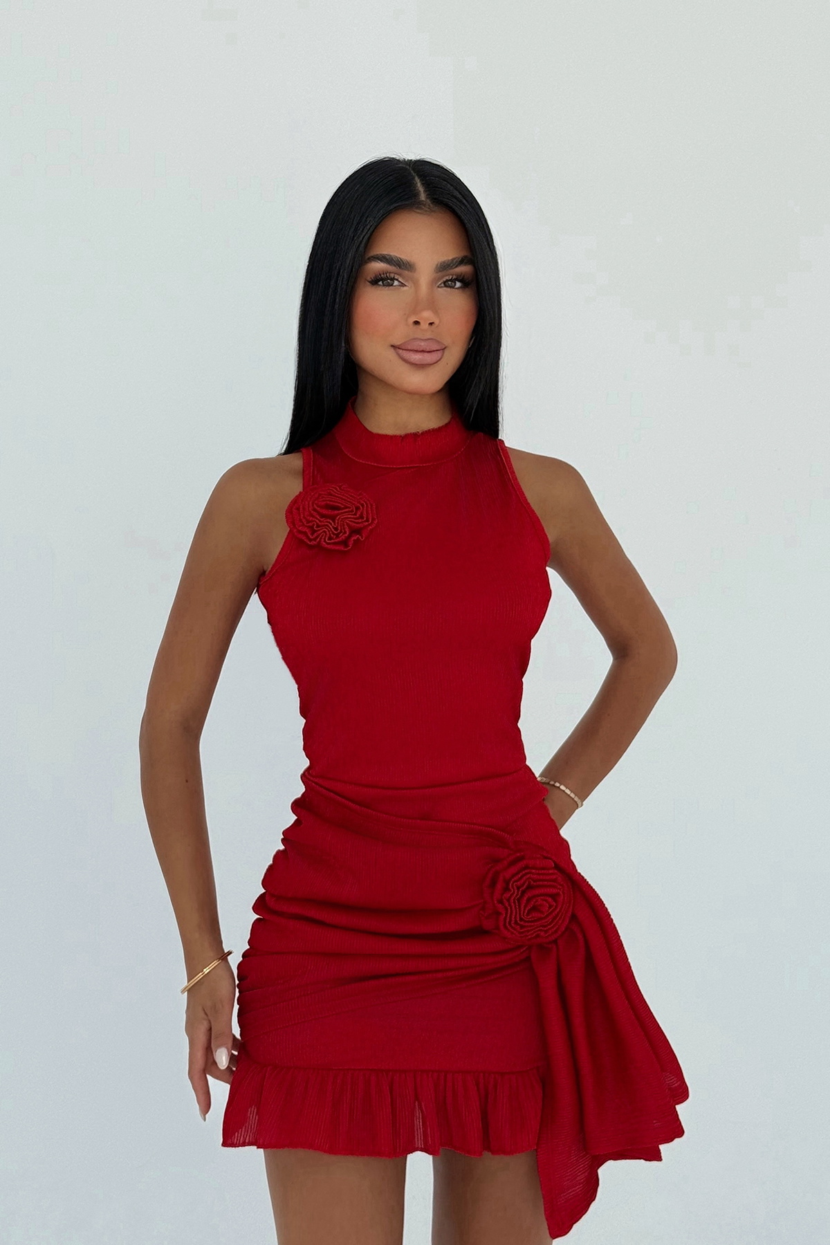 Kırmızı Cantarios Mini Gül Detaylı Elbise