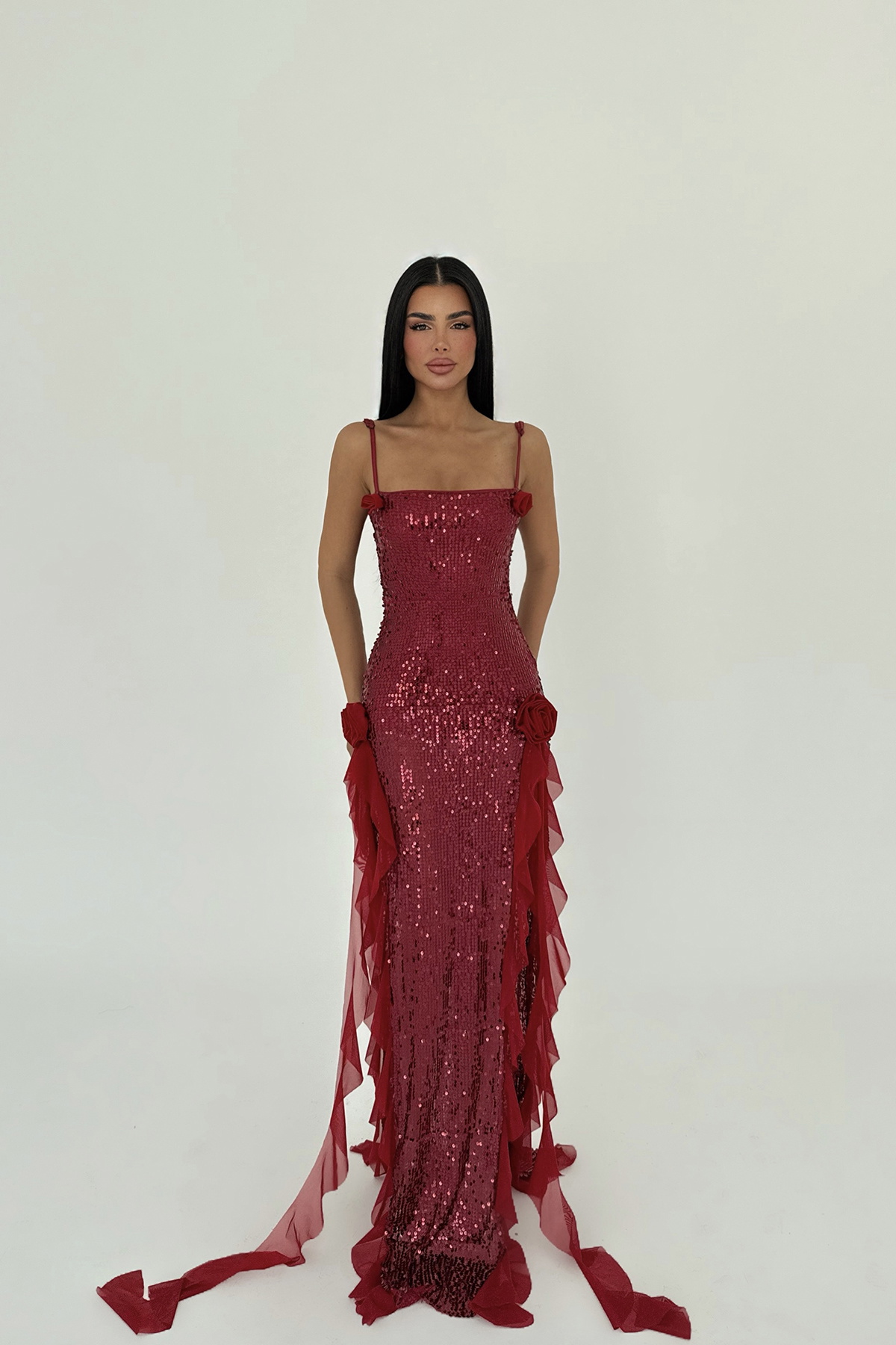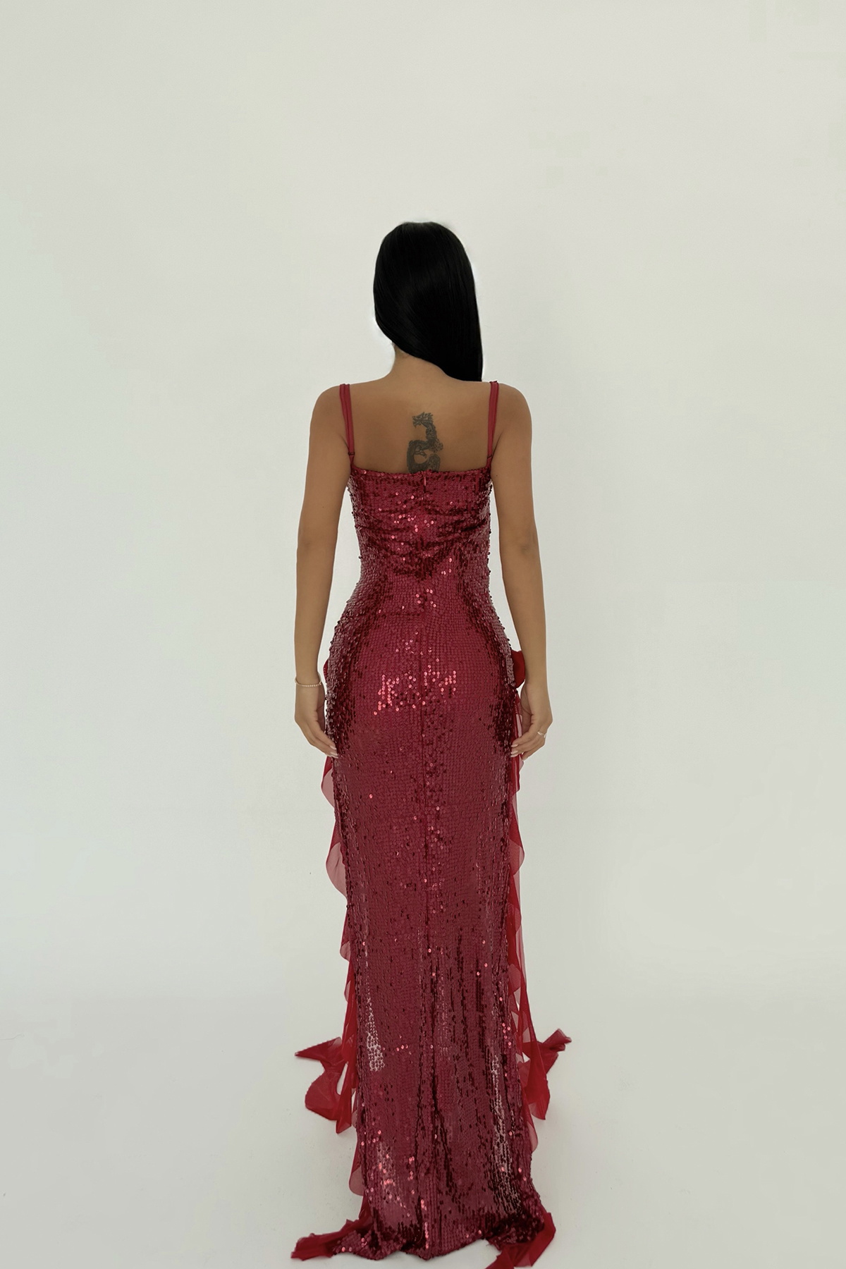 Kırmızı Paxton Payetli Uzun Yırtmaçlı Elbise