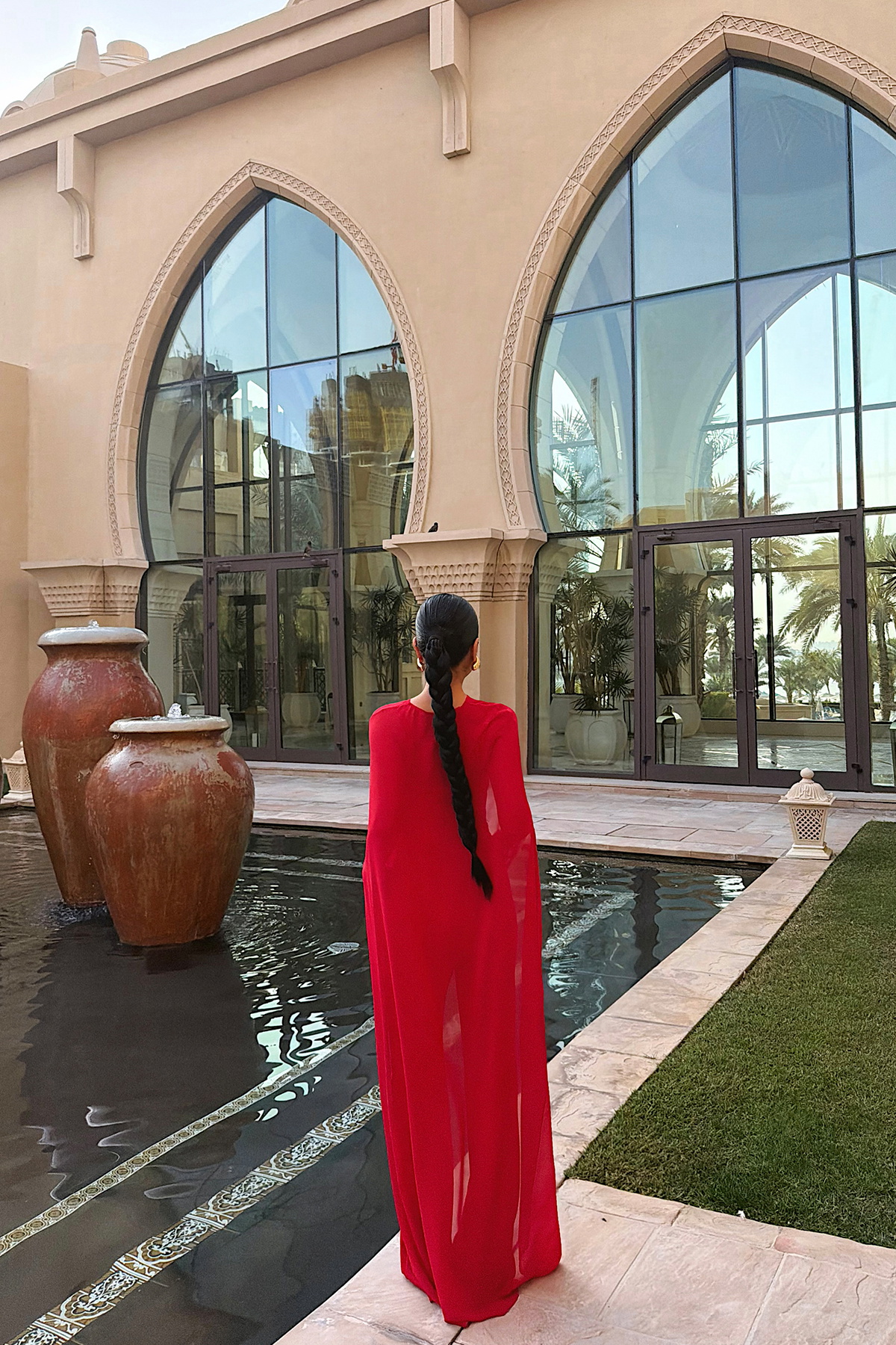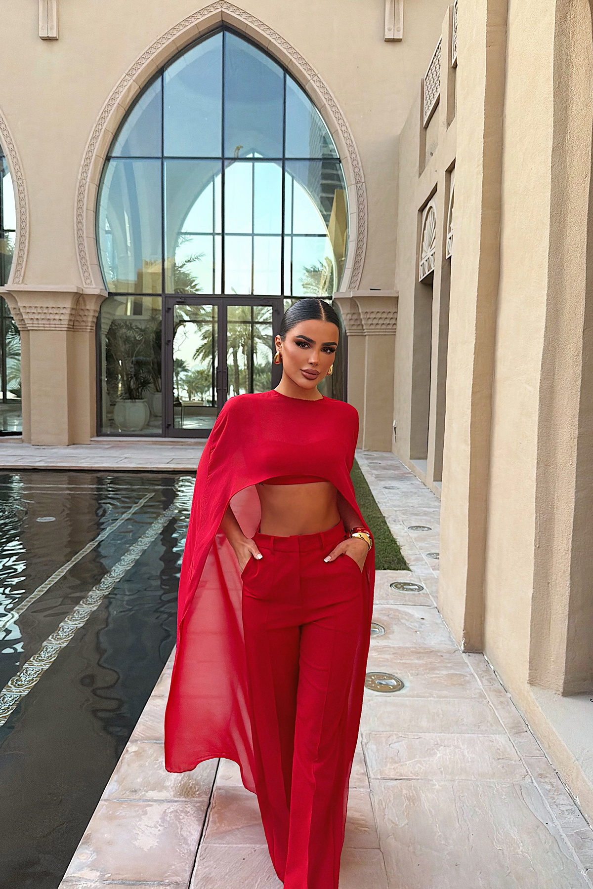 Omuzlardan dökülen pelerin formu tasarıma hareket kazandırırken, yürüdükçe akışkan bir etki yaratır.