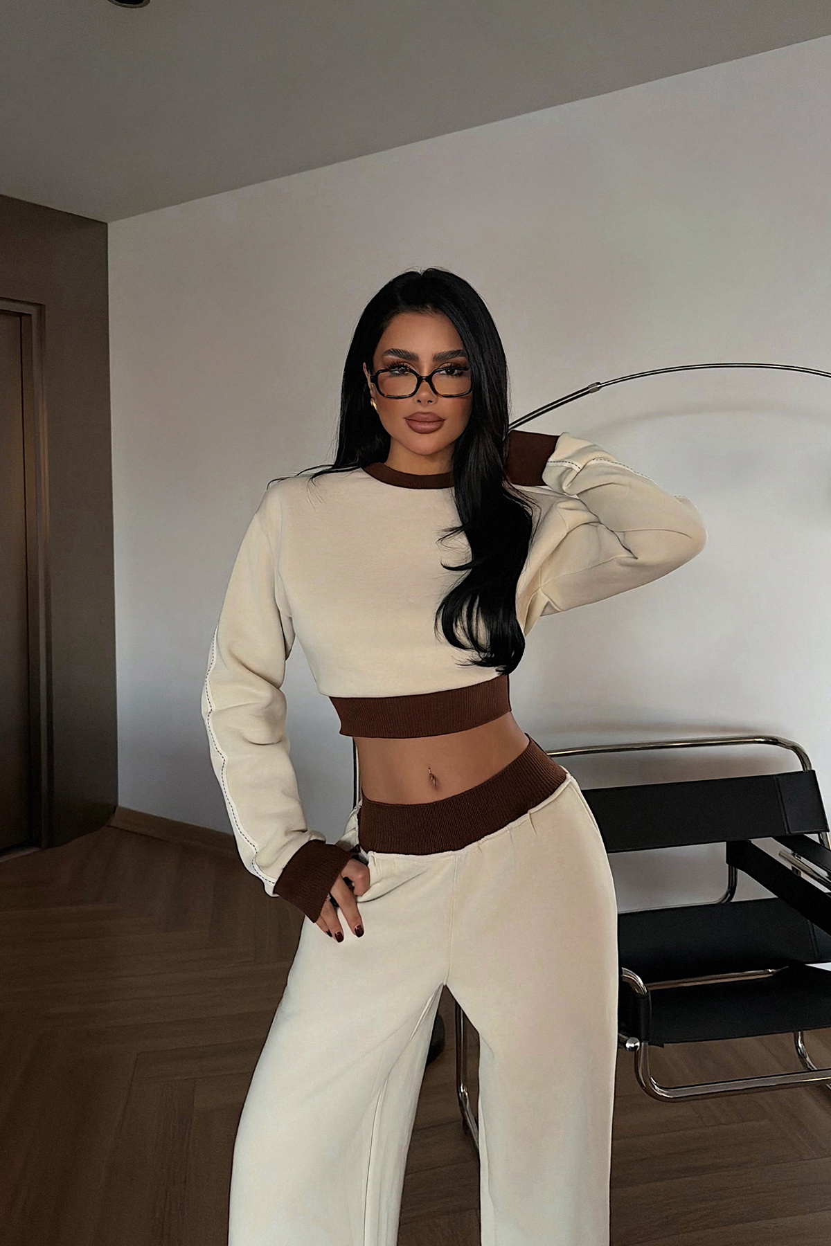 Açık krem tonu ve kontrast çift-renk detaylarıyla bu takım, sade ama dikkat çekici bir şıklık sunuyor. Üst kısmının klasik kesimi alt kısmın modern çizgileriyle birleşirken, yumuşak dokulu kumaşı gün boyu konfor sağlıyor. Günlük stilinizde ya da hafif şık kombinlerde kolayca tercih edilebilir.