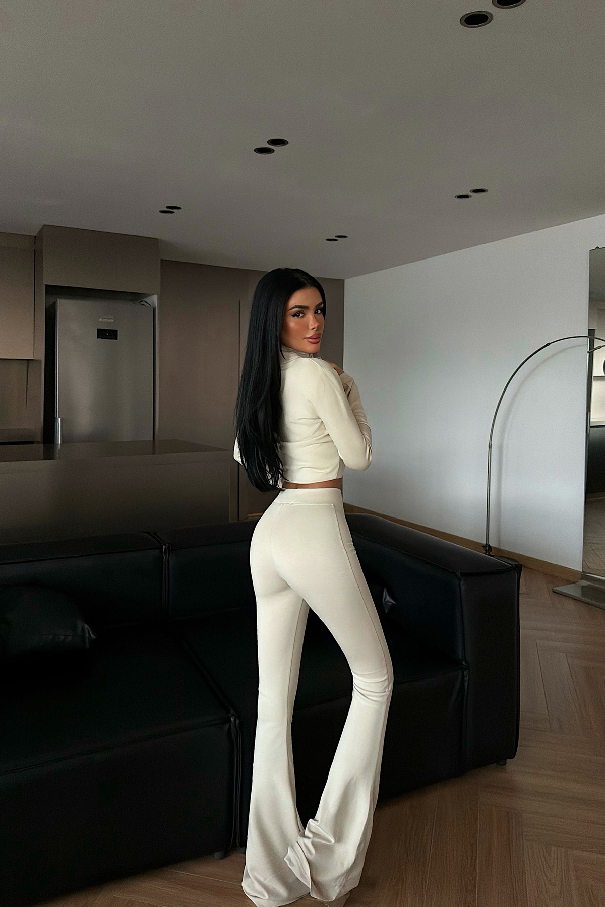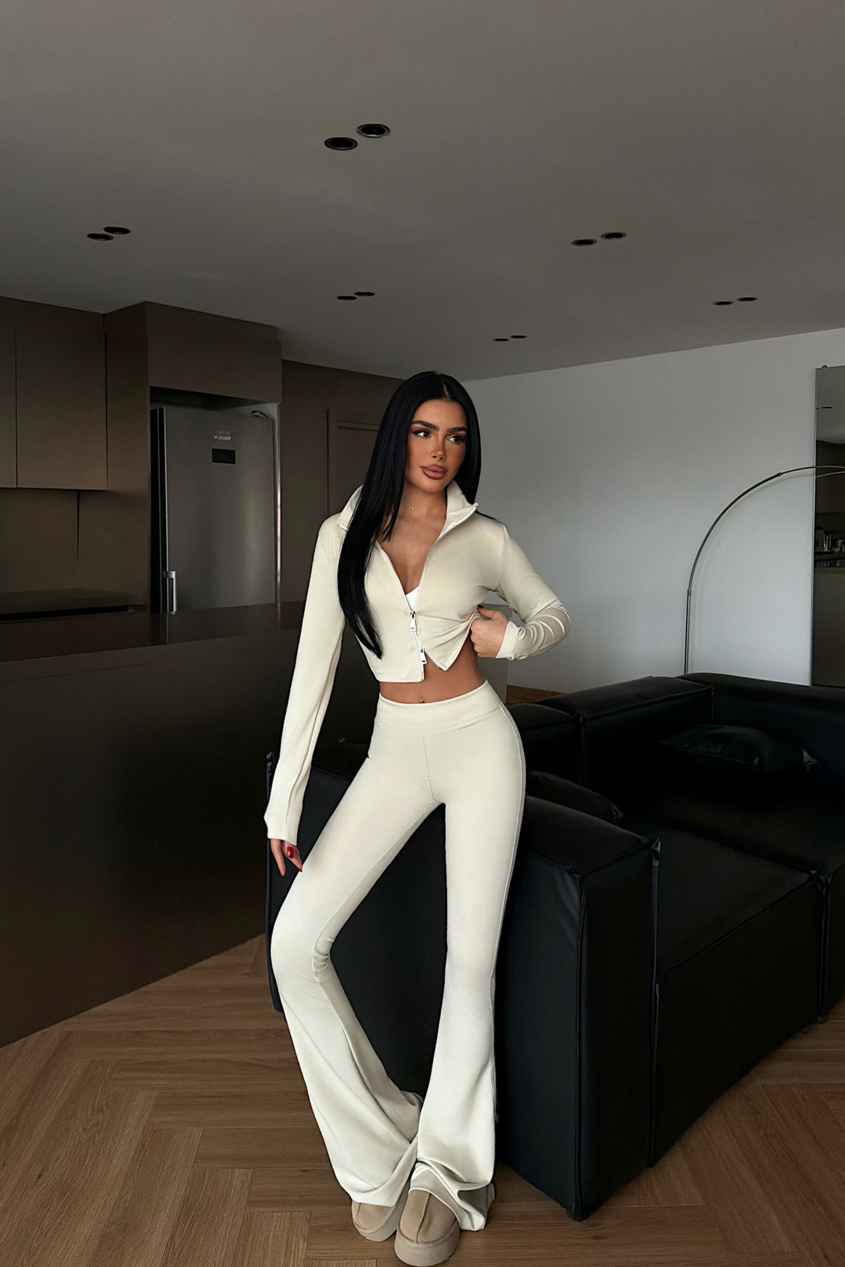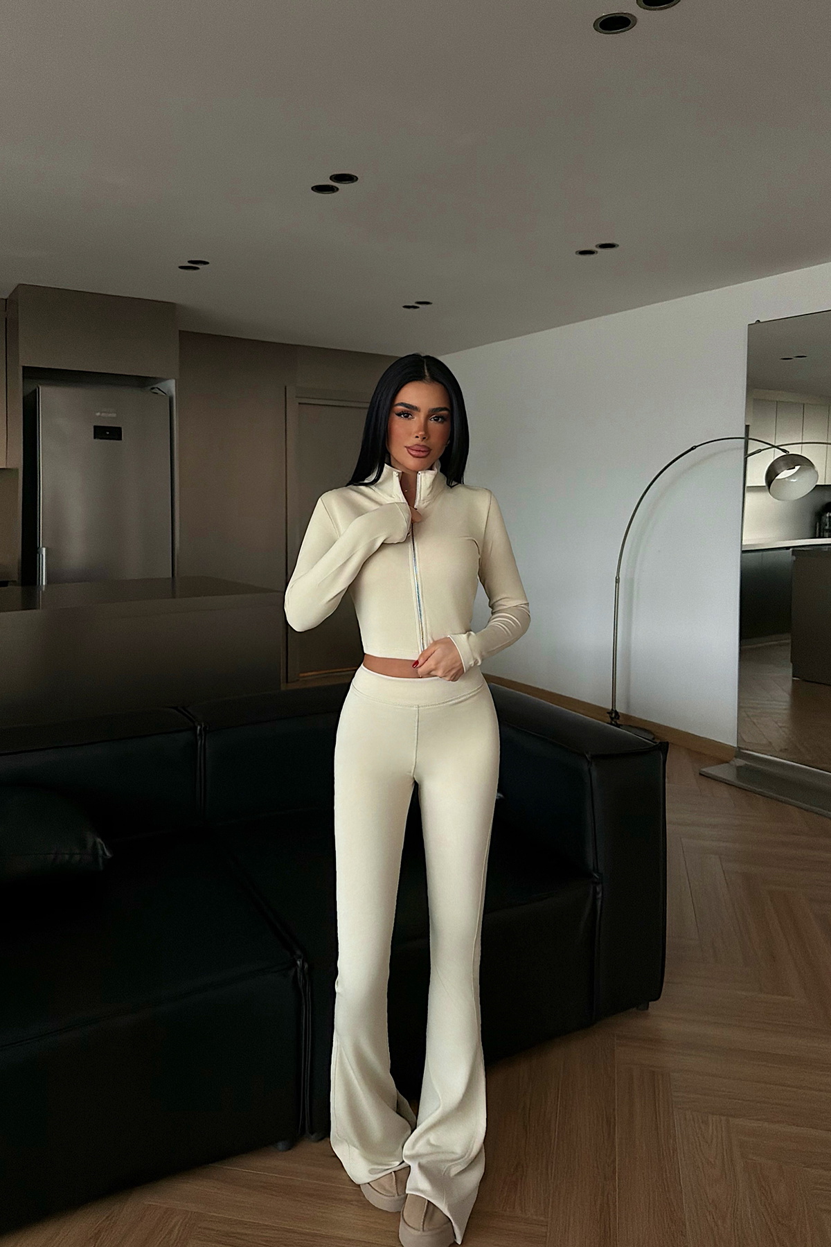 Canlı krem rengiyle öne çıkan bu takım; üst kısmında yer alan ön fermuar detayı sayesinde modern ve dinamik bir görünüm sunar. Alt pantolonu düz paça formunda ve bel kısmı esnek lastikli bu sayede gün boyu rahat kullanım sağlar.