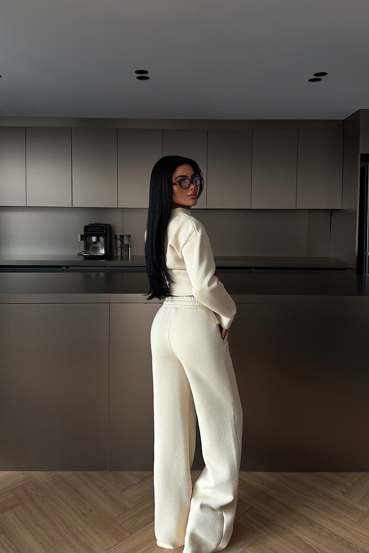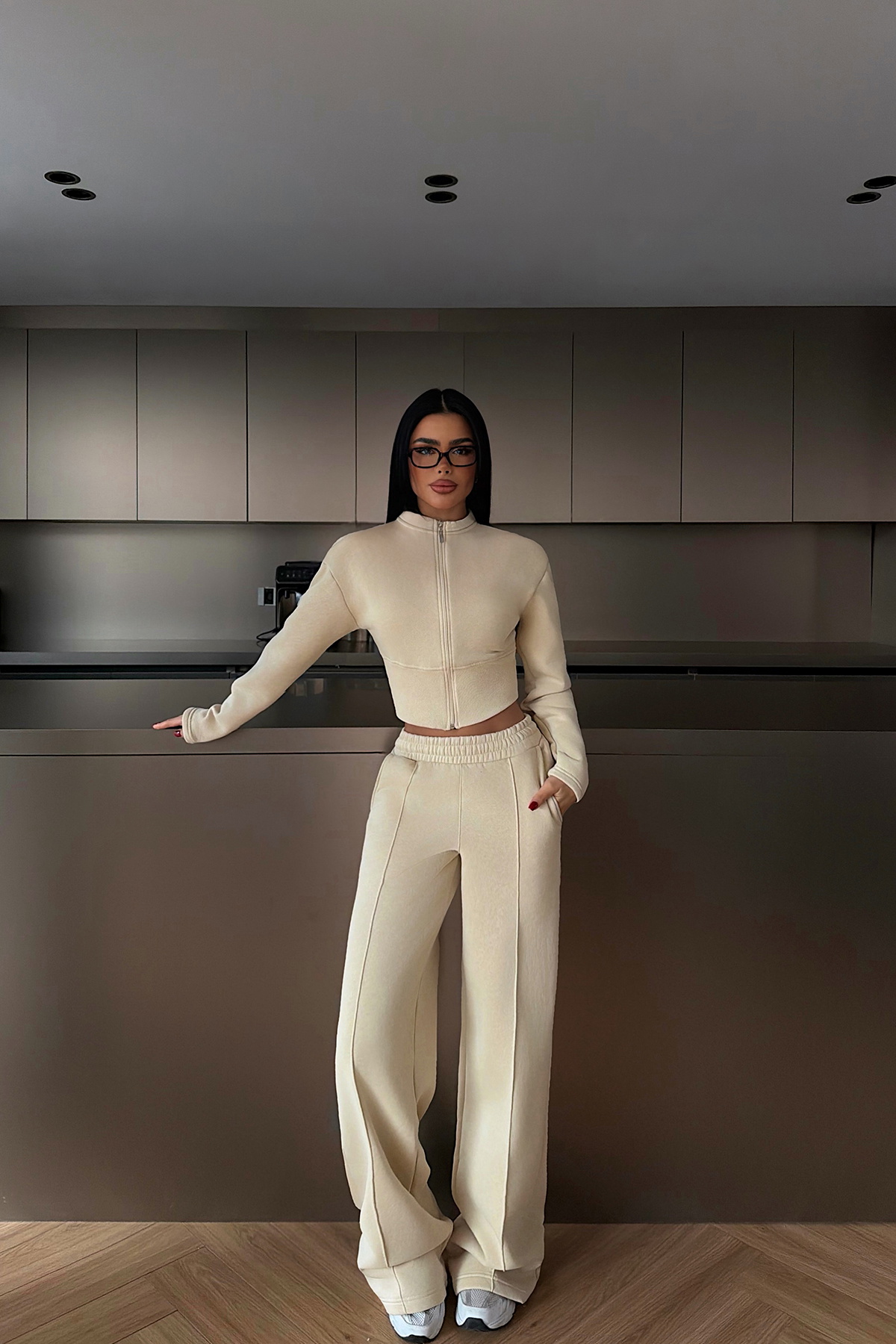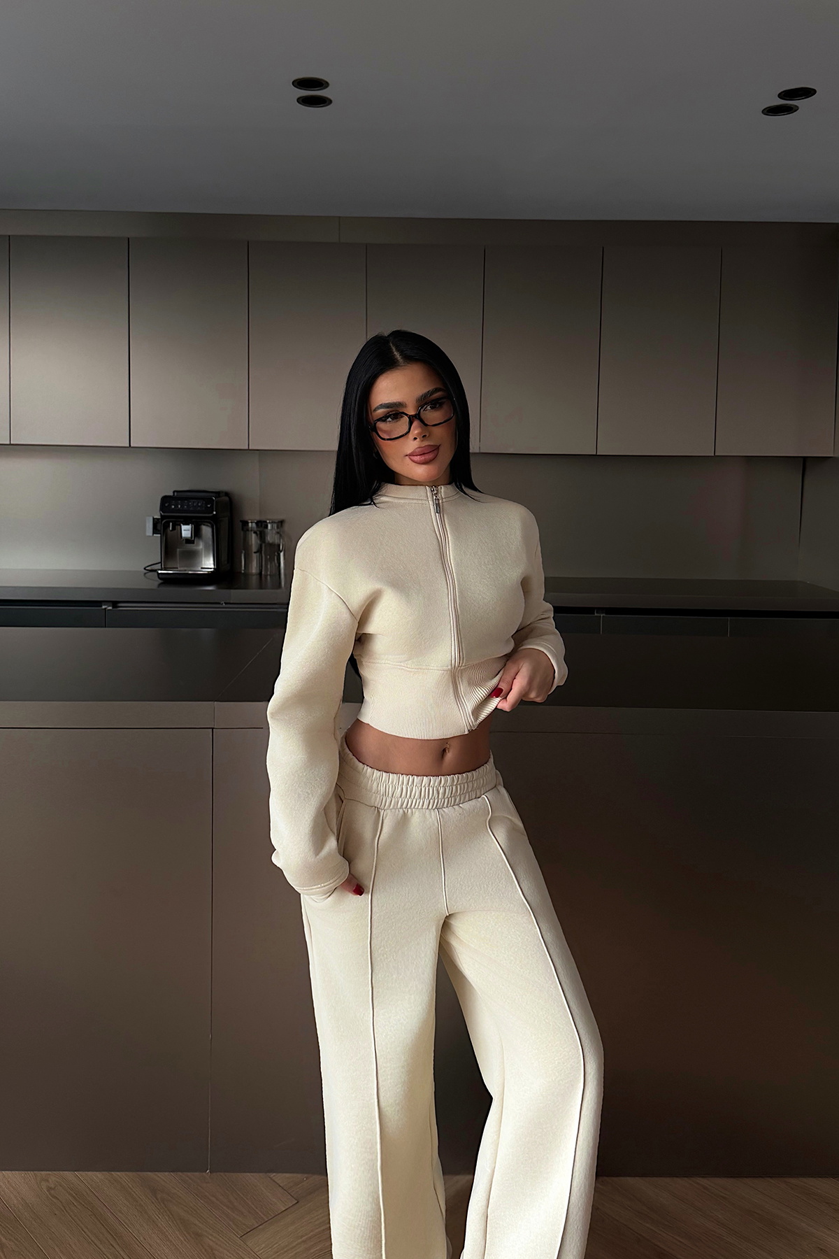 Sade ve şık krem rengiyle dikkat çeken bu fermuarlı eşofman takımı, modern bir tarz ve rahatlık sunuyor. Üst kısmındaki fermuar detayı kullanım kolaylığı sağlarken, yumuşak kumaşı sayesinde gün boyu konforlu bir his sunar.