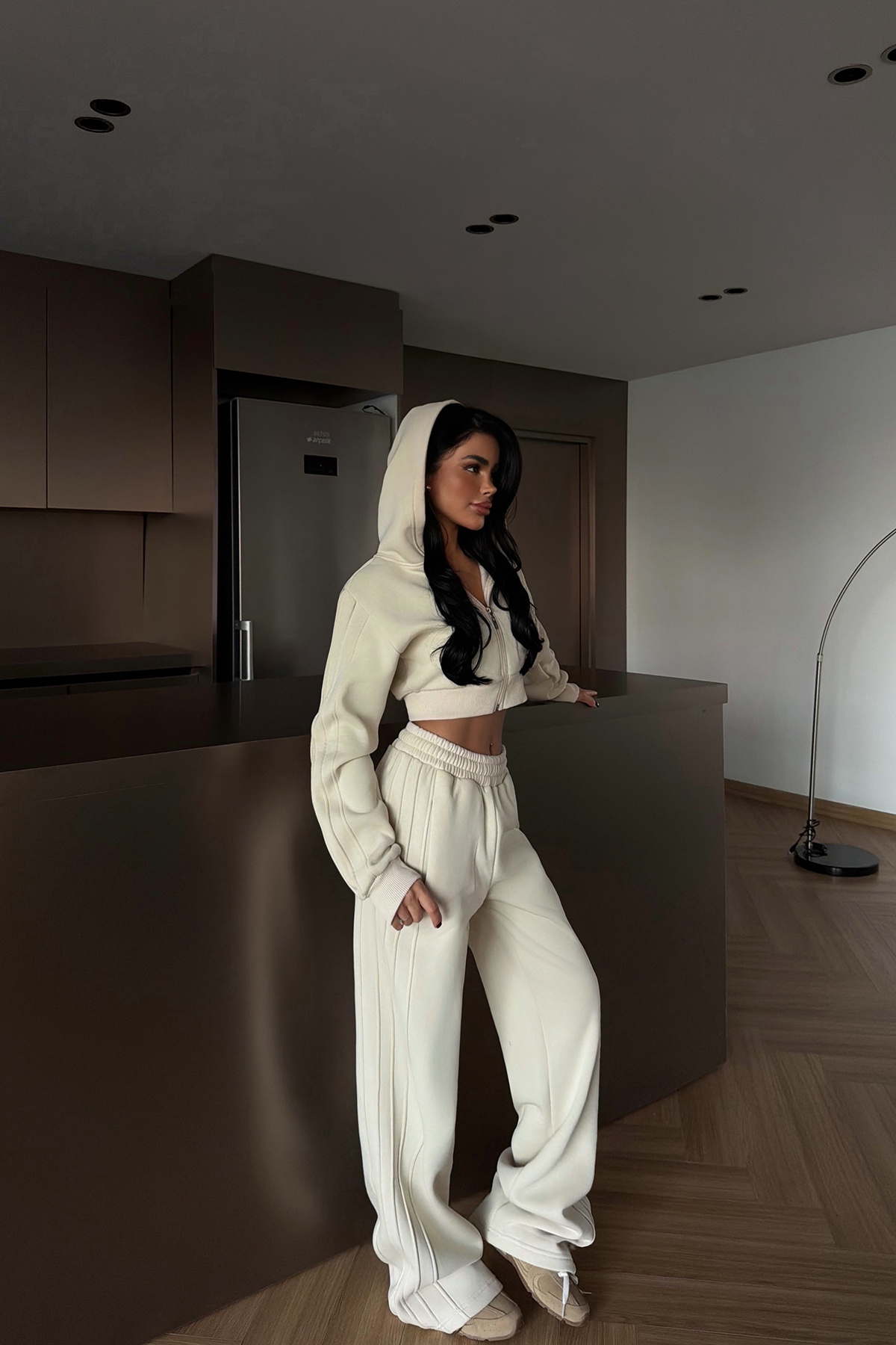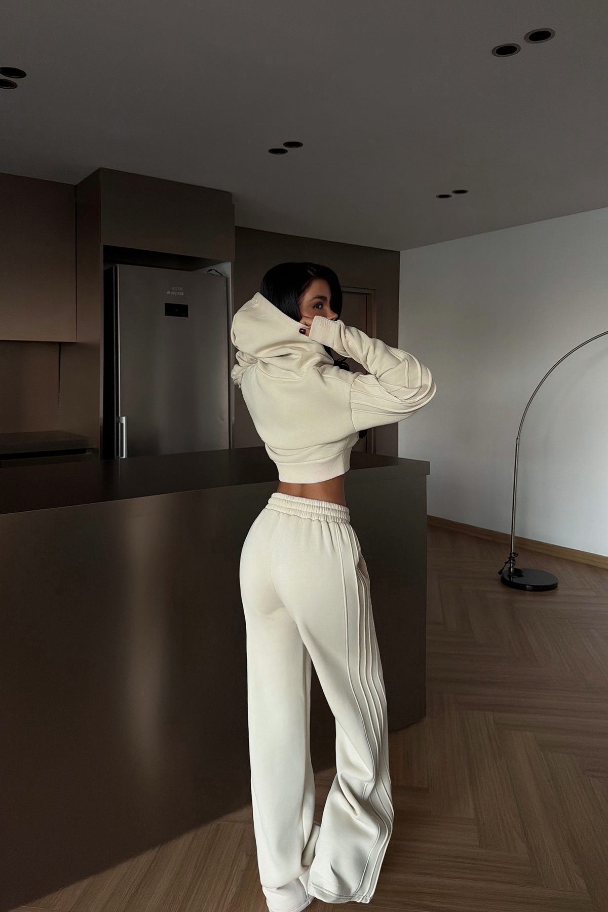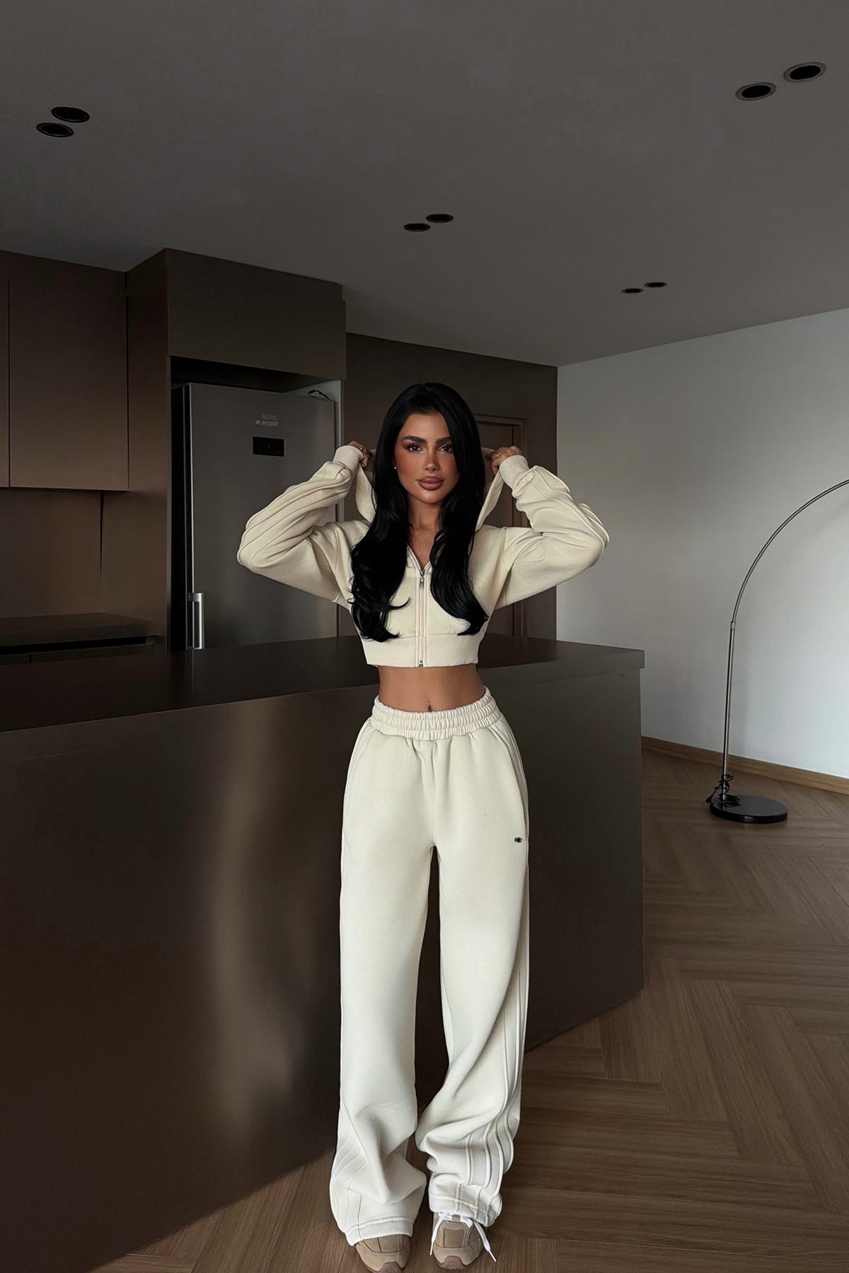 Krem tonundaki bu eşofman takımı, ön fermuar detaylı üst parçası ve rahat kesimli altıyla şık ve fonksiyonel bir tercih sunuyor. Yumuşak kumaşı gün boyu konfor sağlar; düz renk formu sayesinde minimal aksesuarlarla kolayca kombinlenebilir. Tok, nötr rengiyle şehir stiline uyum sağlarken sportifliği korur.