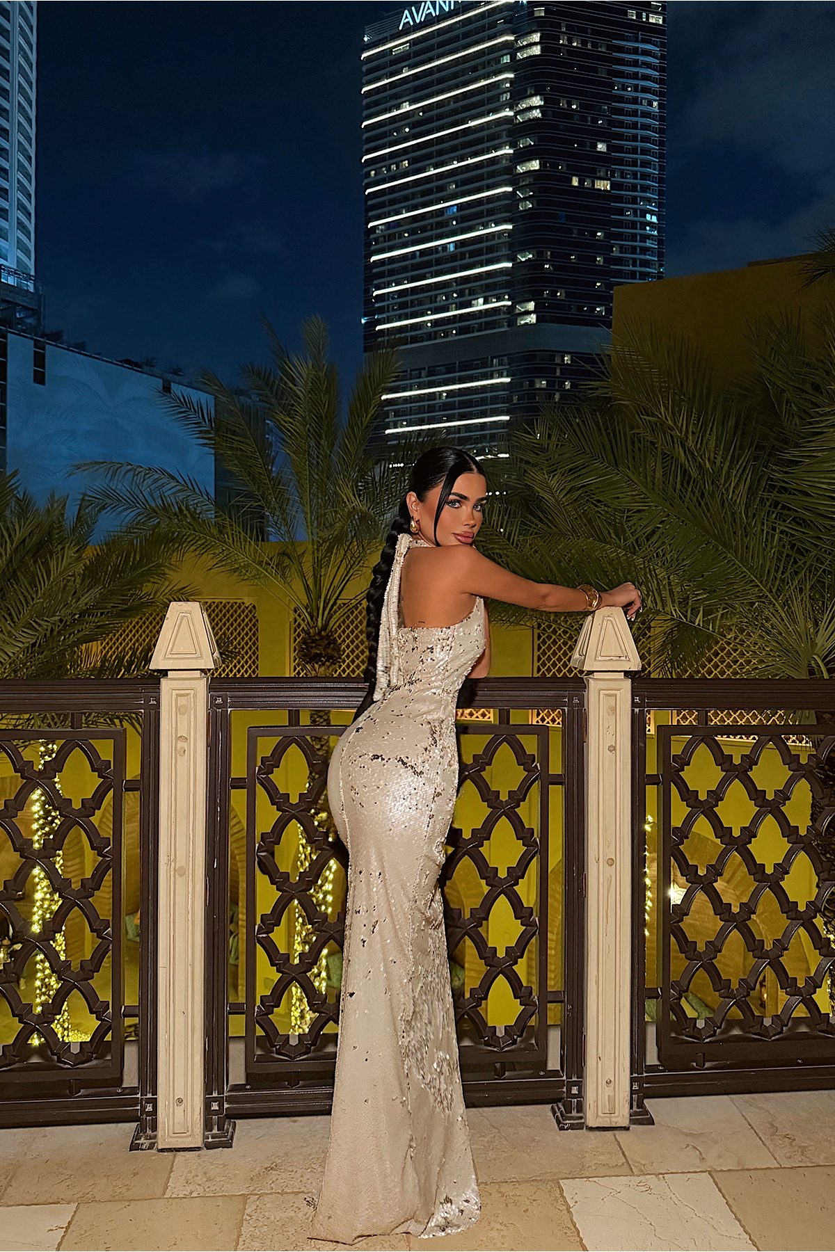 Pul payet işlemeleriyle tasarlanan bu uzun abiye elbise, gece şıklığını sofistike bir duruşla tamamlar. Derin V yaka formu feminen silueti vurgularken, vücuda oturan kalıbı boyu daha uzun ve dengeli gösteren bir görünüm sunar. Elbise boyunca yer alan pul payet detayları ışıkla birlikte zarif bir ışıltı oluşturur.