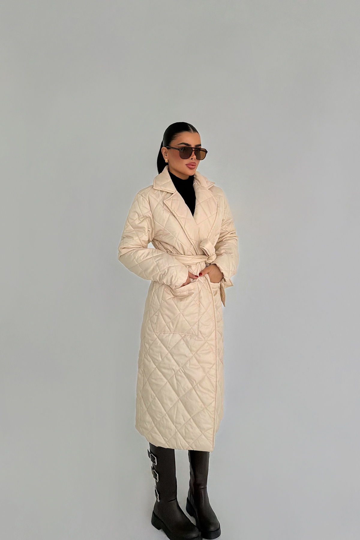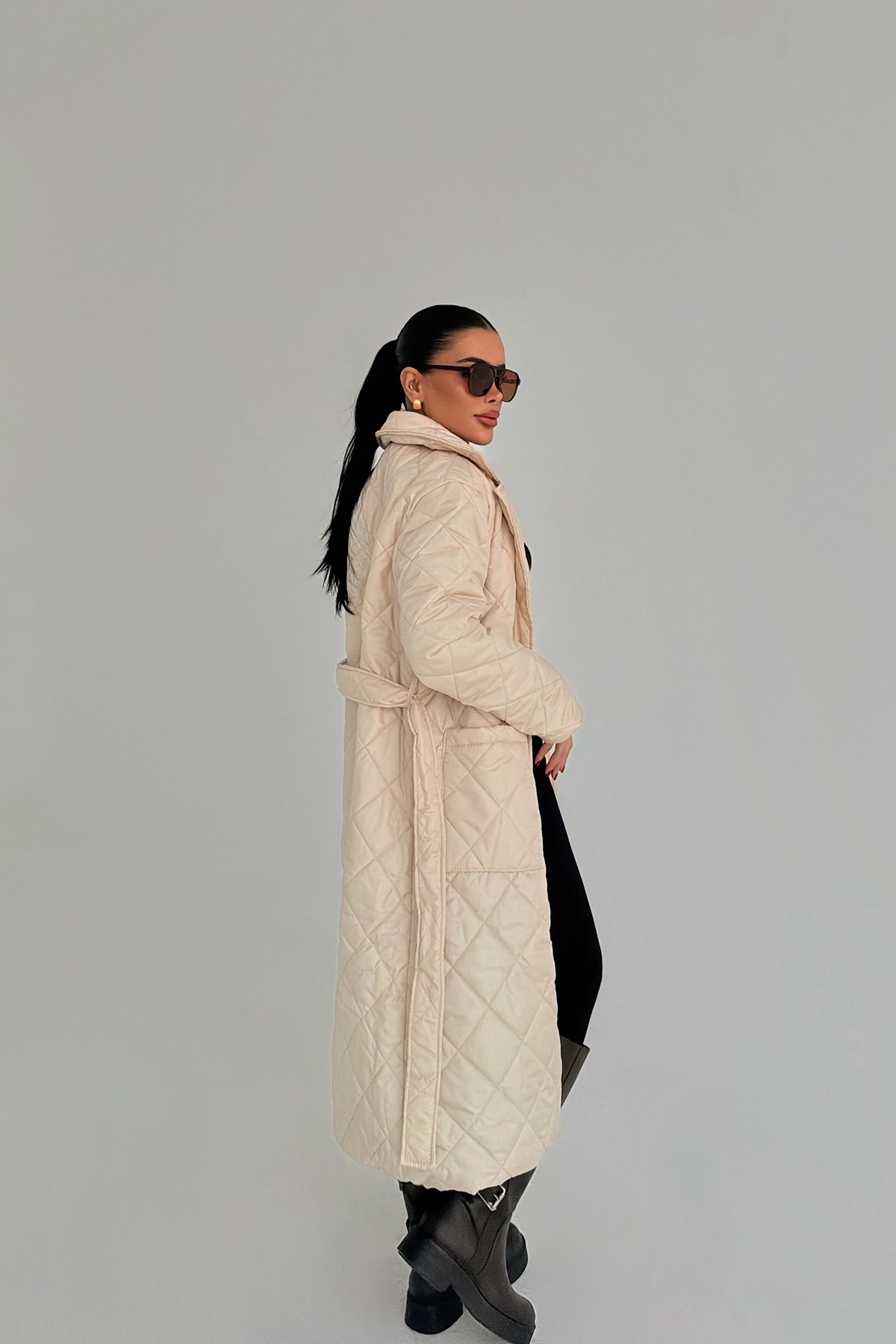 Bu krem kapitone mont, şık ve fonksiyonel bir dış giyim parçasıdır. Kapitone dikişli tasarımı sayesinde hem yalıtımı yüksek hem de hafif bir yapı sunar.