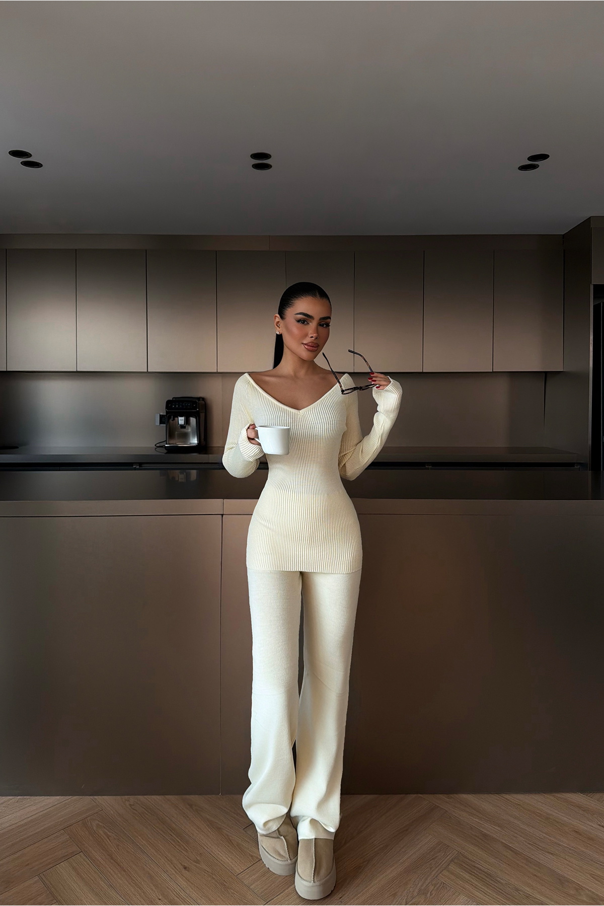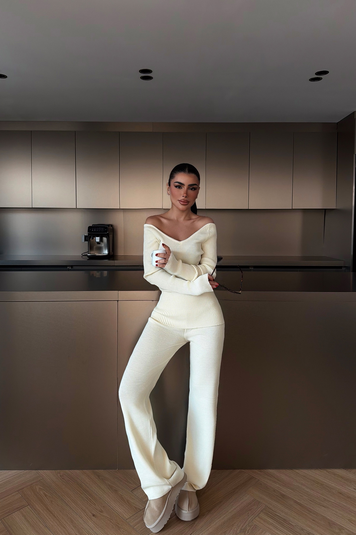 Takım, omuz kısmındaki açık detay ile klasik triko görünümünü modern bir stile dönüştürür. Üst parça düzgün kalıplı ve triko dokulu; alt kısmı ise rahat kesim ve sade form ile kombini tamamlar. Takımın dikişleri temiz, kalıbı dengeli ve vücuda uyumu dengelidir.
