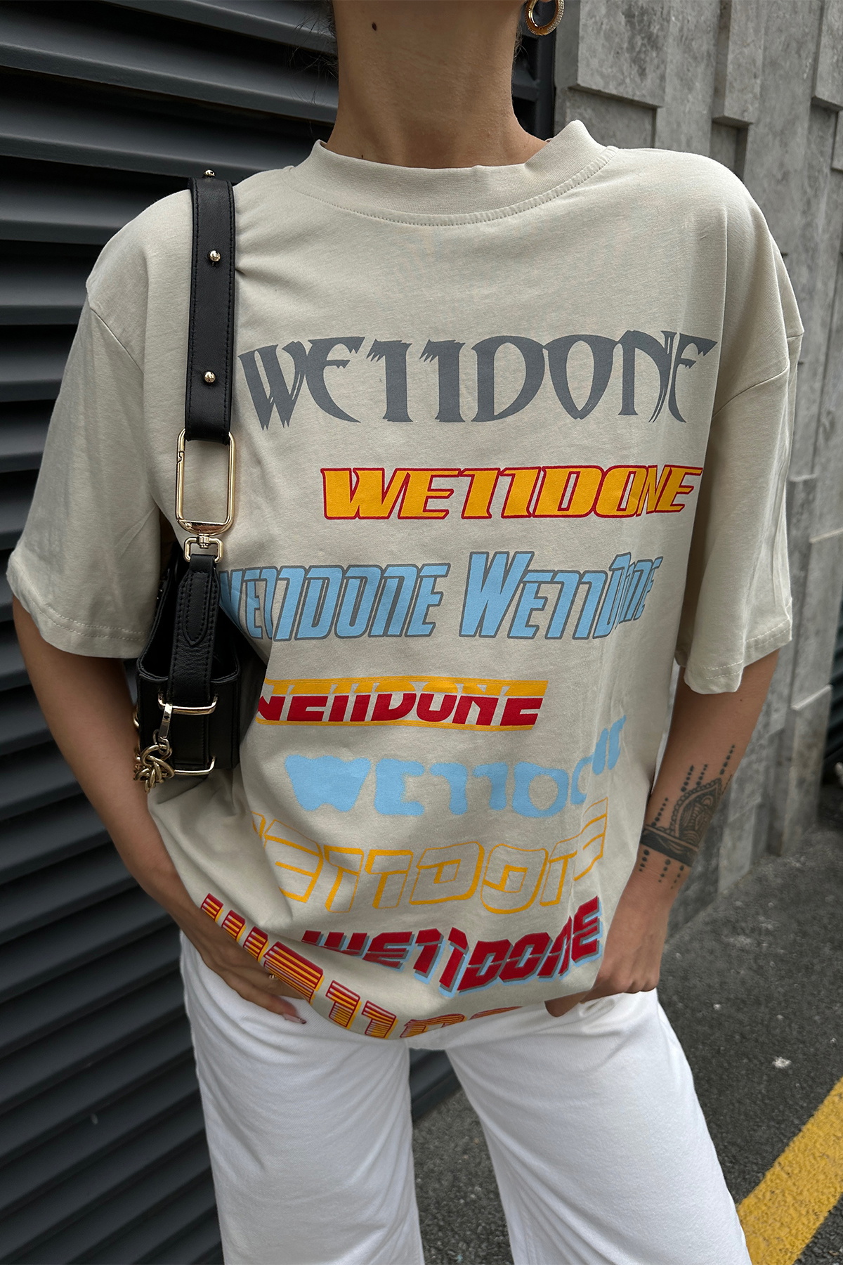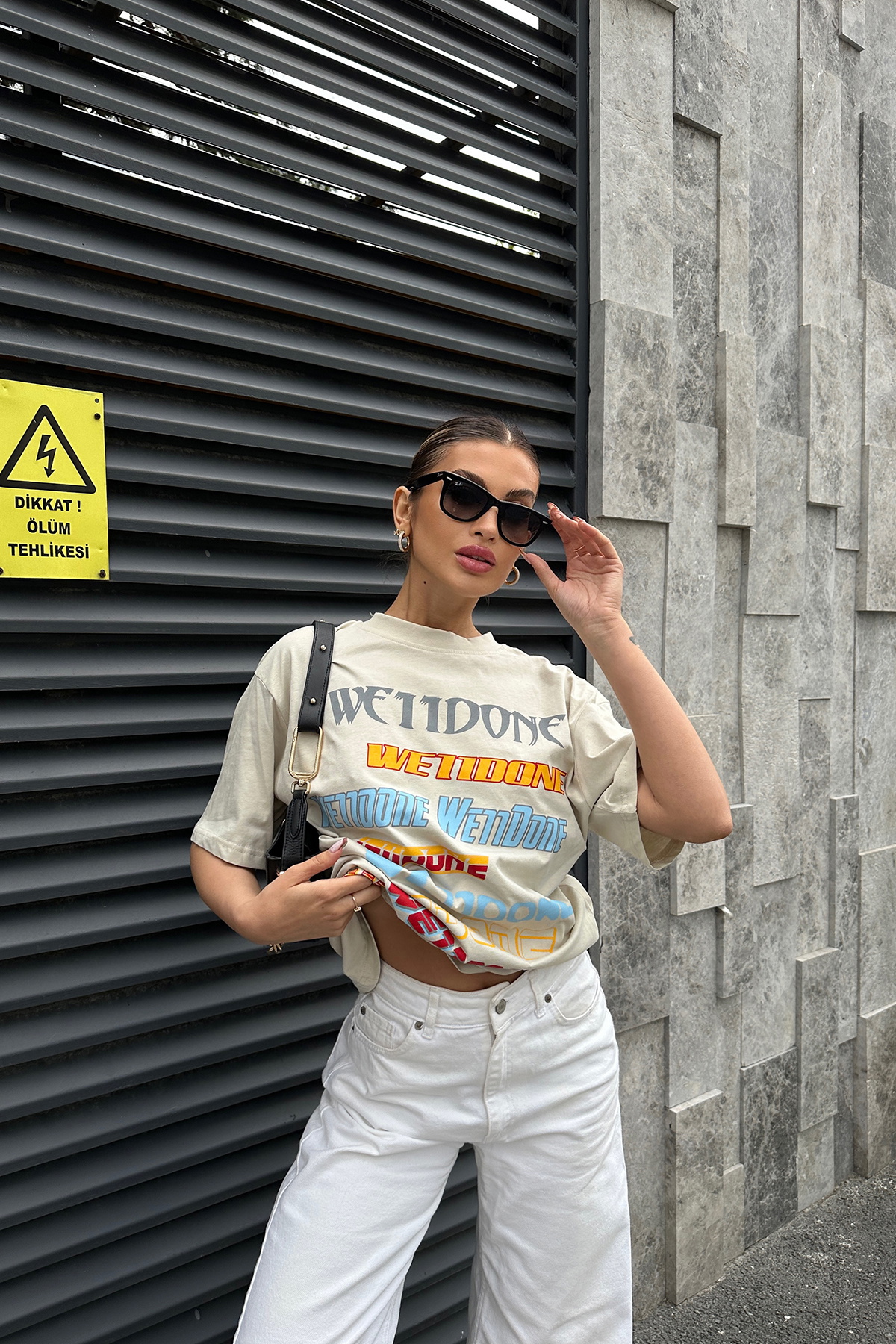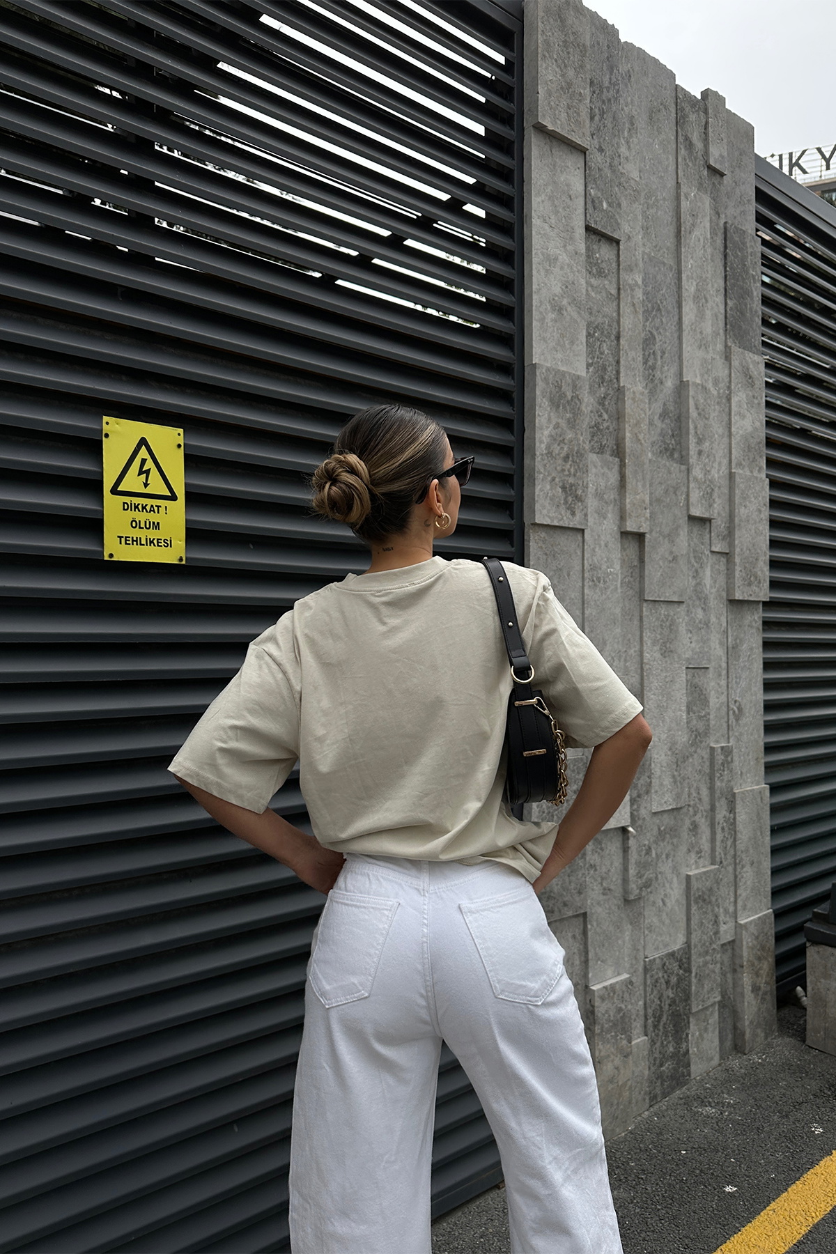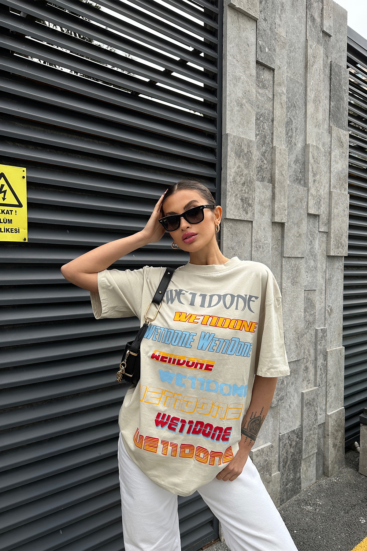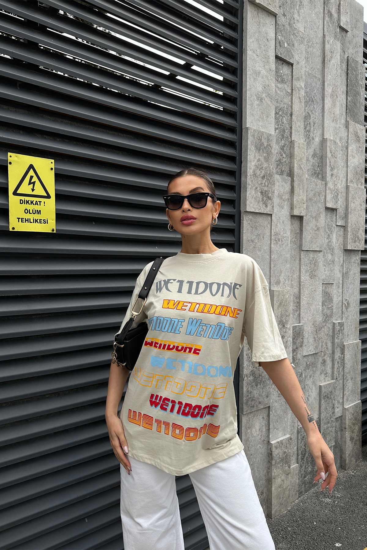 Krem Önü Yazılı Oversize Tişört