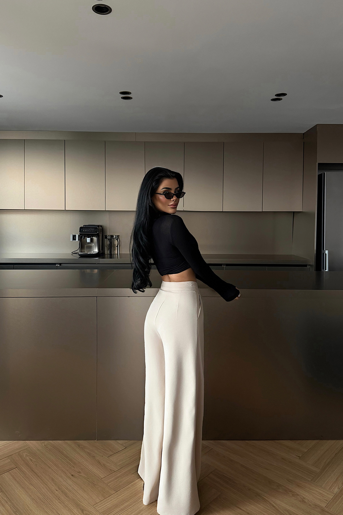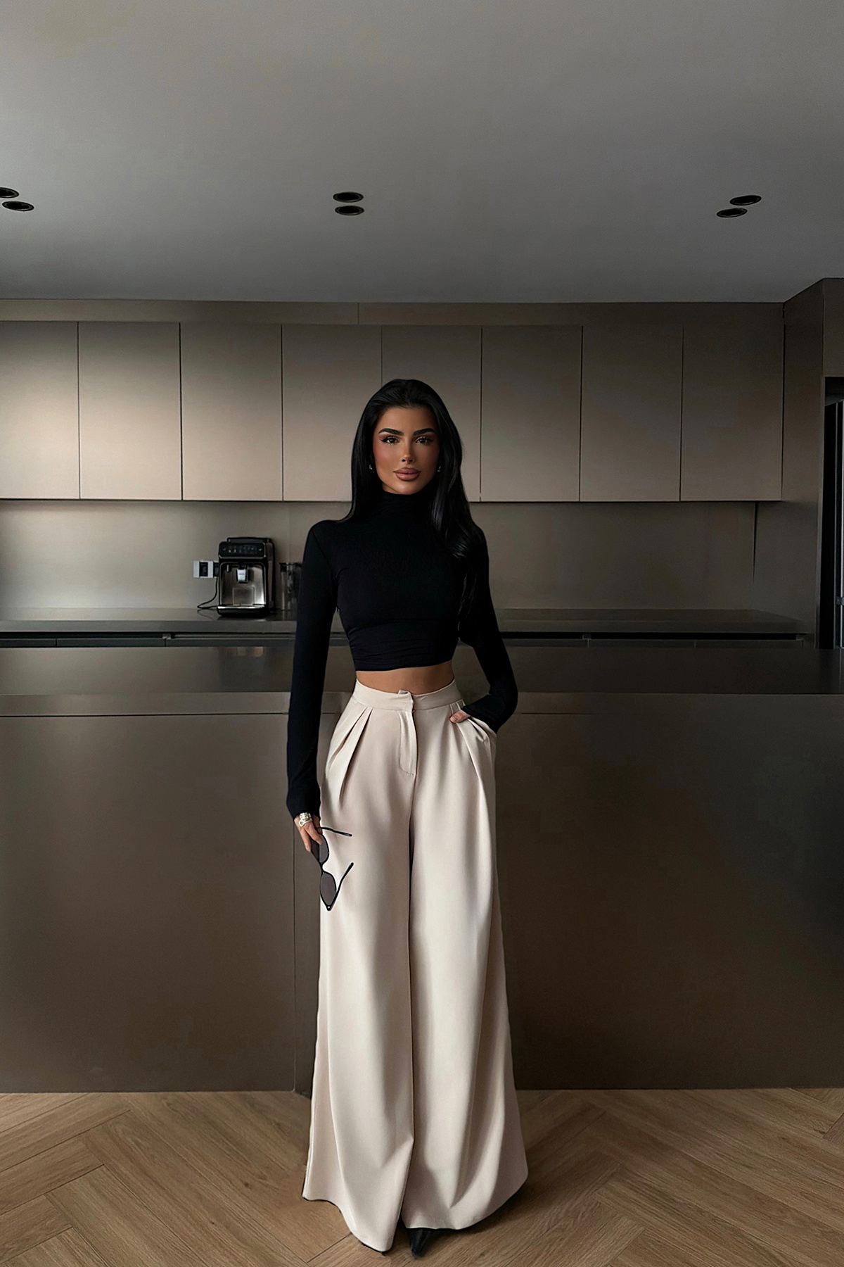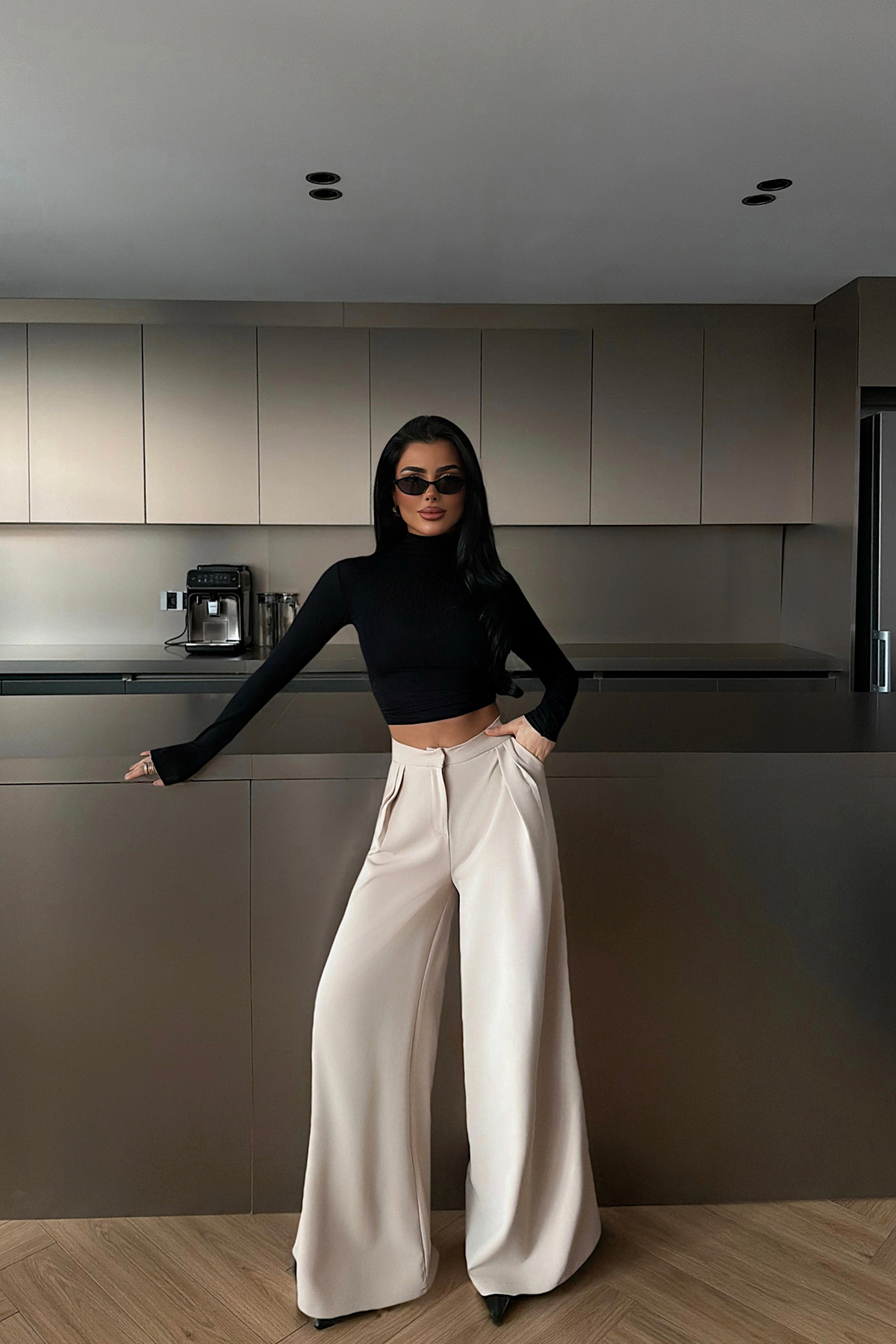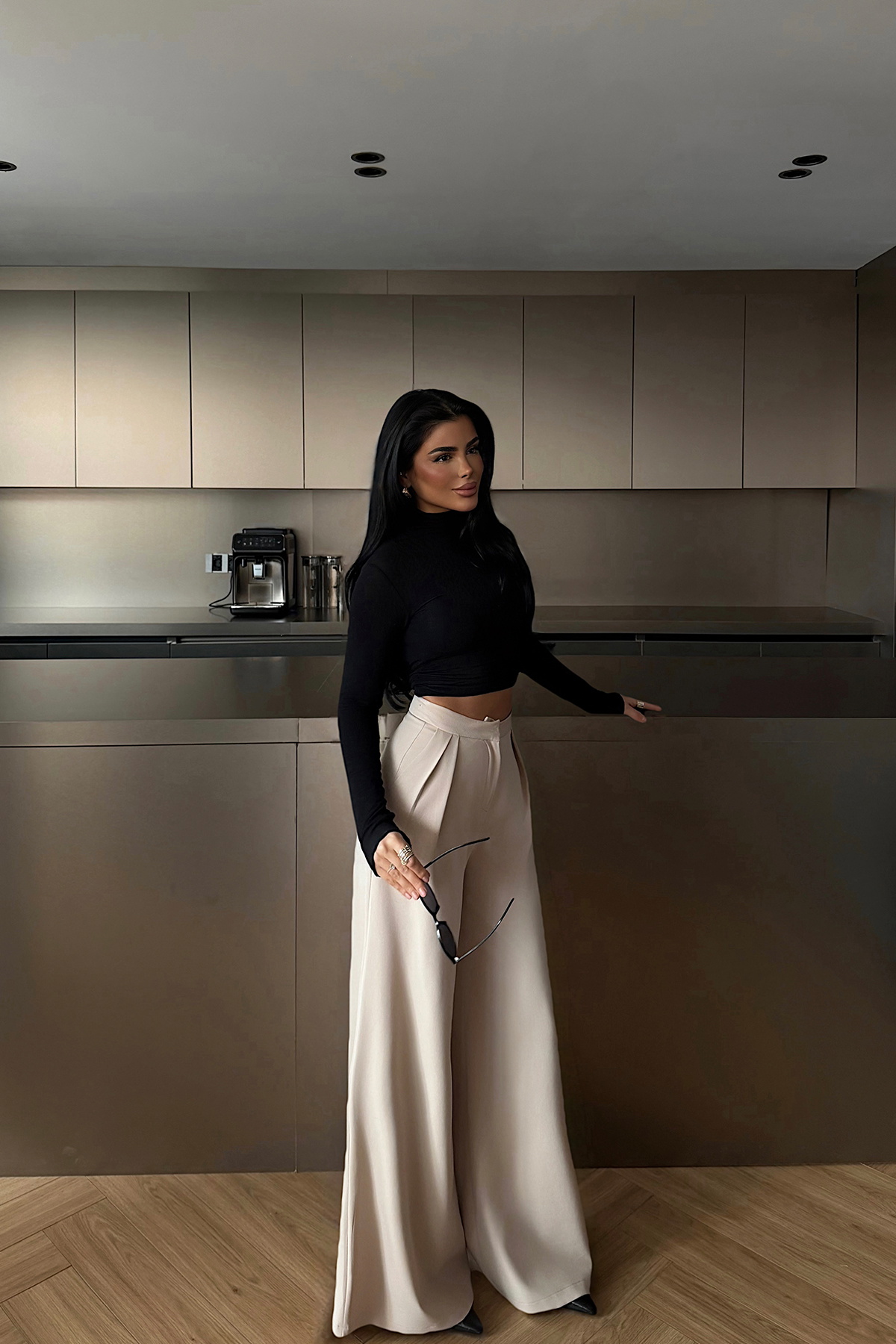 Yüksek bel formu ve bol paça kesimiyle öne çıkan palazzo pantolon, akıcı yapısı sayesinde uzun ve dengeli bir siluet sunar. Rahat kalıbı ve sade tasarımıyla günlük kombinlerden şık şehir stiline kadar çok yönlü kullanım sağlar.