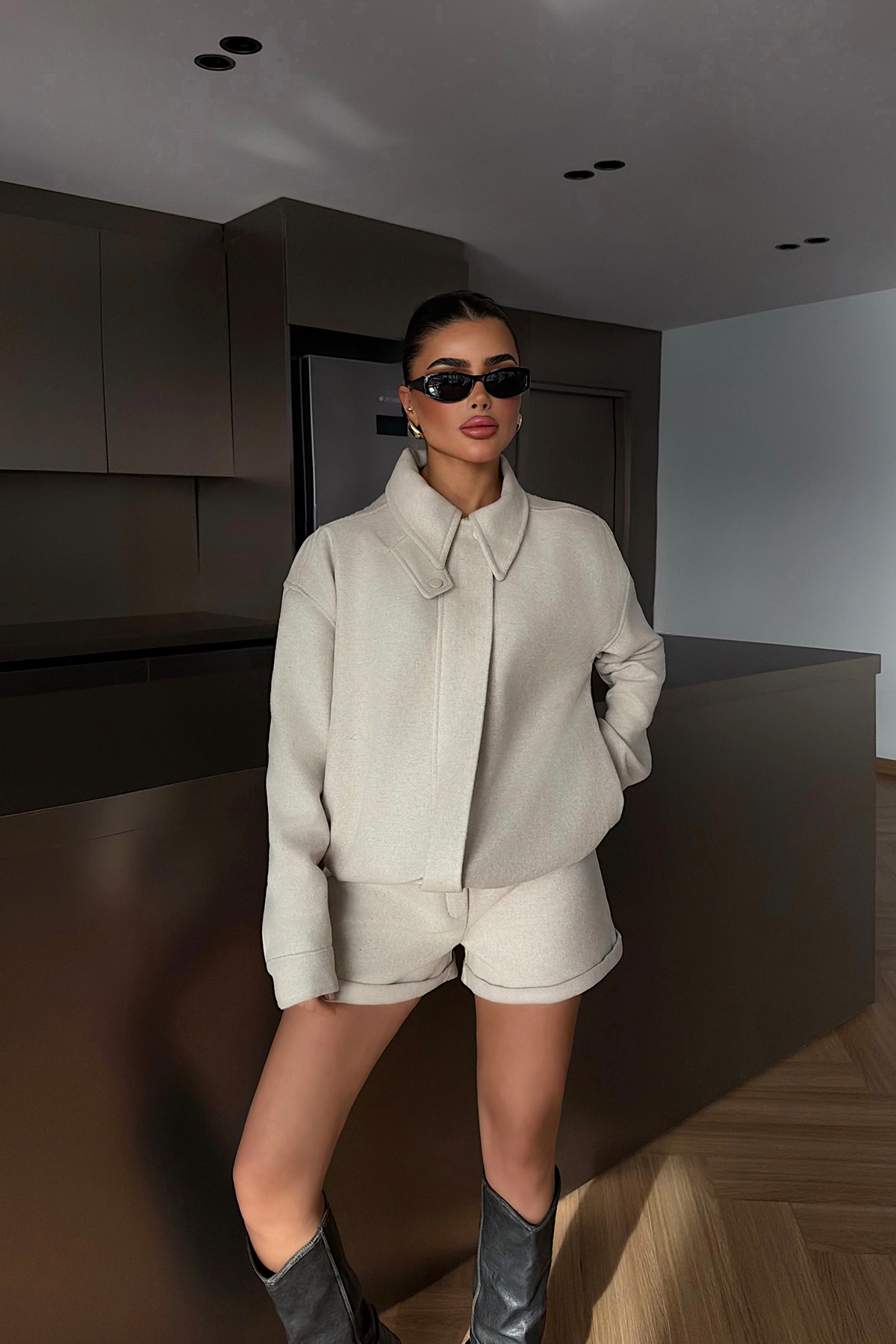 Tok ve dokulu kaşe kumaş yapısı ile öne çıkan ceket ve şort takımı, sade formu sayesinde modern ve dengeli bir siluet sunar. Cep detaylı üst parça tasarıma işlevsel bir vurgu katarken, uyumlu şort kesimi bütünlüklü ve güçlü bir görünüm sağlar. Mevsim geçişlerinde şehir stiline rahatlıkla uyum sağlar.