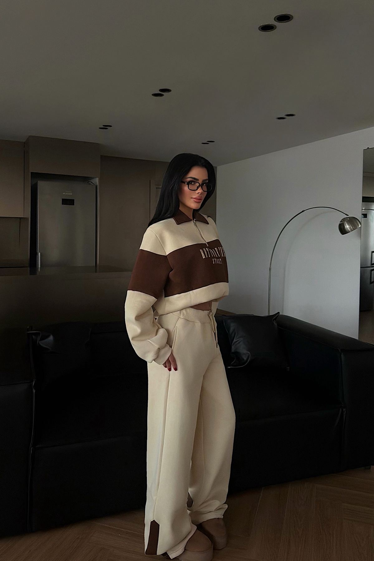 Krem Yaka Detaylı Eşofman Takım, modern kesimi ve kontrast yaka tasarımıyla dikkat çeker. Üst bölümdeki kahverengi yaka detayı, takıma şık bir görünüm kazandırırken minimal çizgiyi korur. Esnek ve yumuşak dokulu kumaşı sayesinde rahat bir duruş sunar.