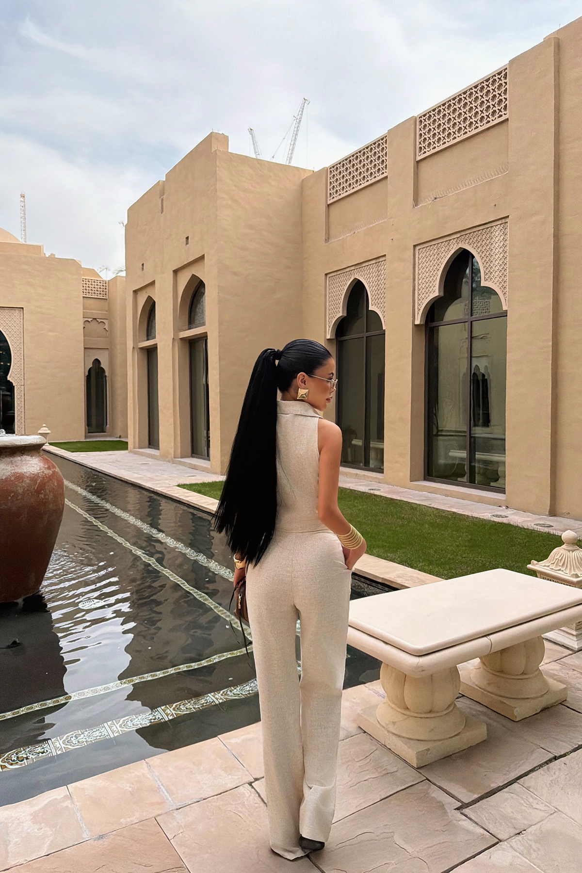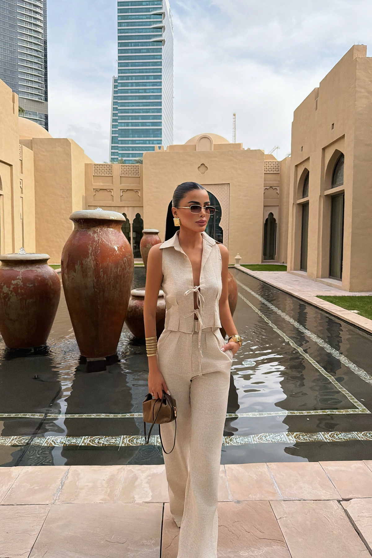 Minimal tasarımı ve zarif duruşuyla öne çıkan bu bej takım, modern ve sofistike bir stil sunar. Kolsuz yelek formundaki üst parça, ön kısmındaki bağlama detayıyla feminen bir görünüm kazandırırken; geniş paça pantolon rahat kalıbı sayesinde gün boyu konfor sağlar.