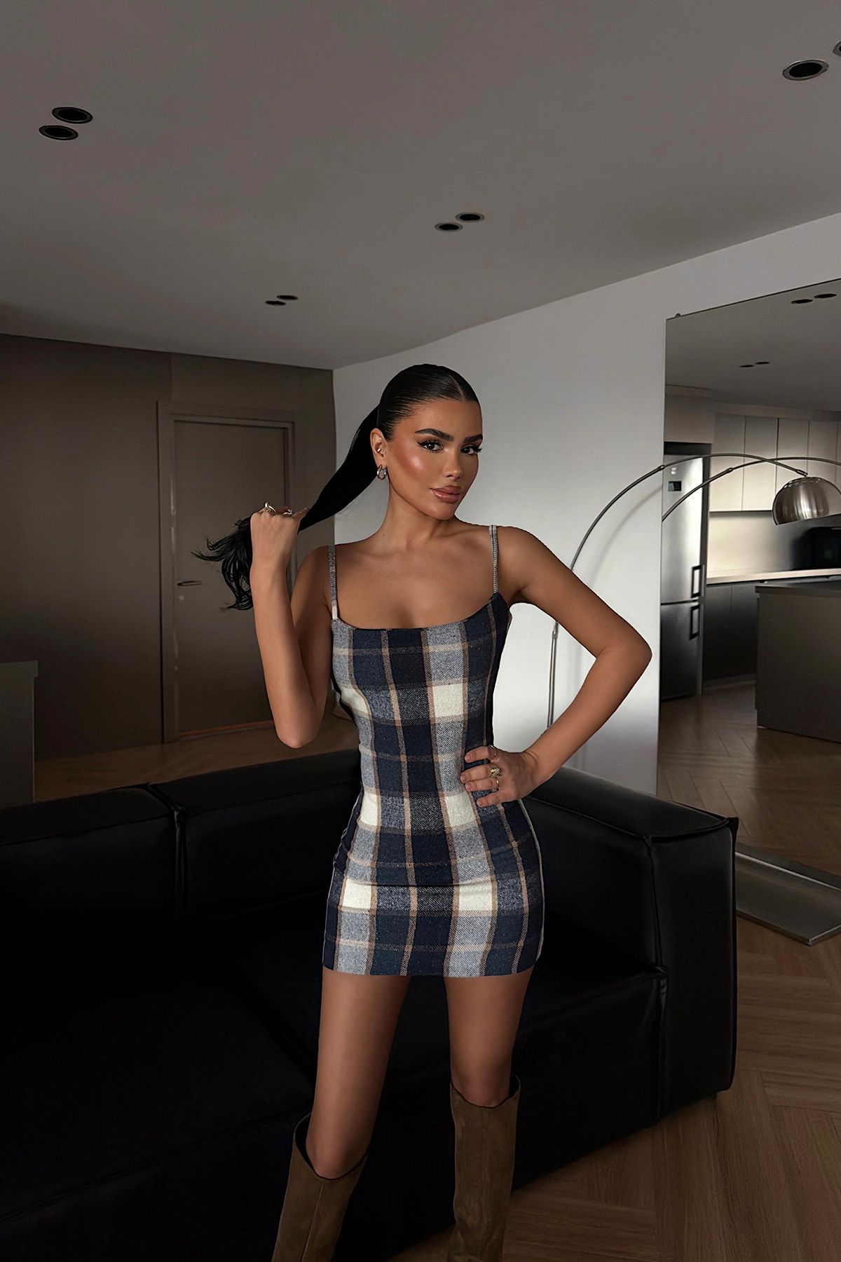 Askılı tasarımı ve vücuda oturan formuyla öne çıkan mini elbise, ekose deseniyle modern ve feminen bir siluet sunar. Kare yaka detayı üst bedeni dengeli şekilde vurgularken, sade ve net kesimi sayesinde günlük şehir kombinlerinden şık görünümlere kadar kolayca uyum sağlar.