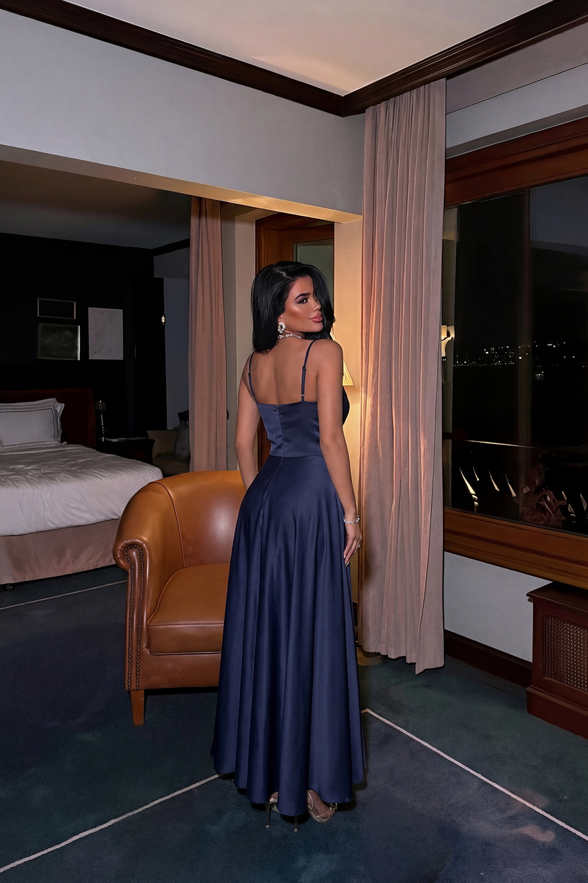 İnce askılı ve kalp yaka formuyla öne çıkan bu abiye elbise, belden oturan kesimi ve yere doğru akarak inen eteğiyle feminen bir siluet sunar. Hafif ve dökümlü kumaşı hareket halinde zarif bir akış sağlarken, sade tasarımı sayesinde şıklığı ön plana çıkarır. Davet, nişan ve özel geceler için zamansız ve iddialı bir seçenektir.