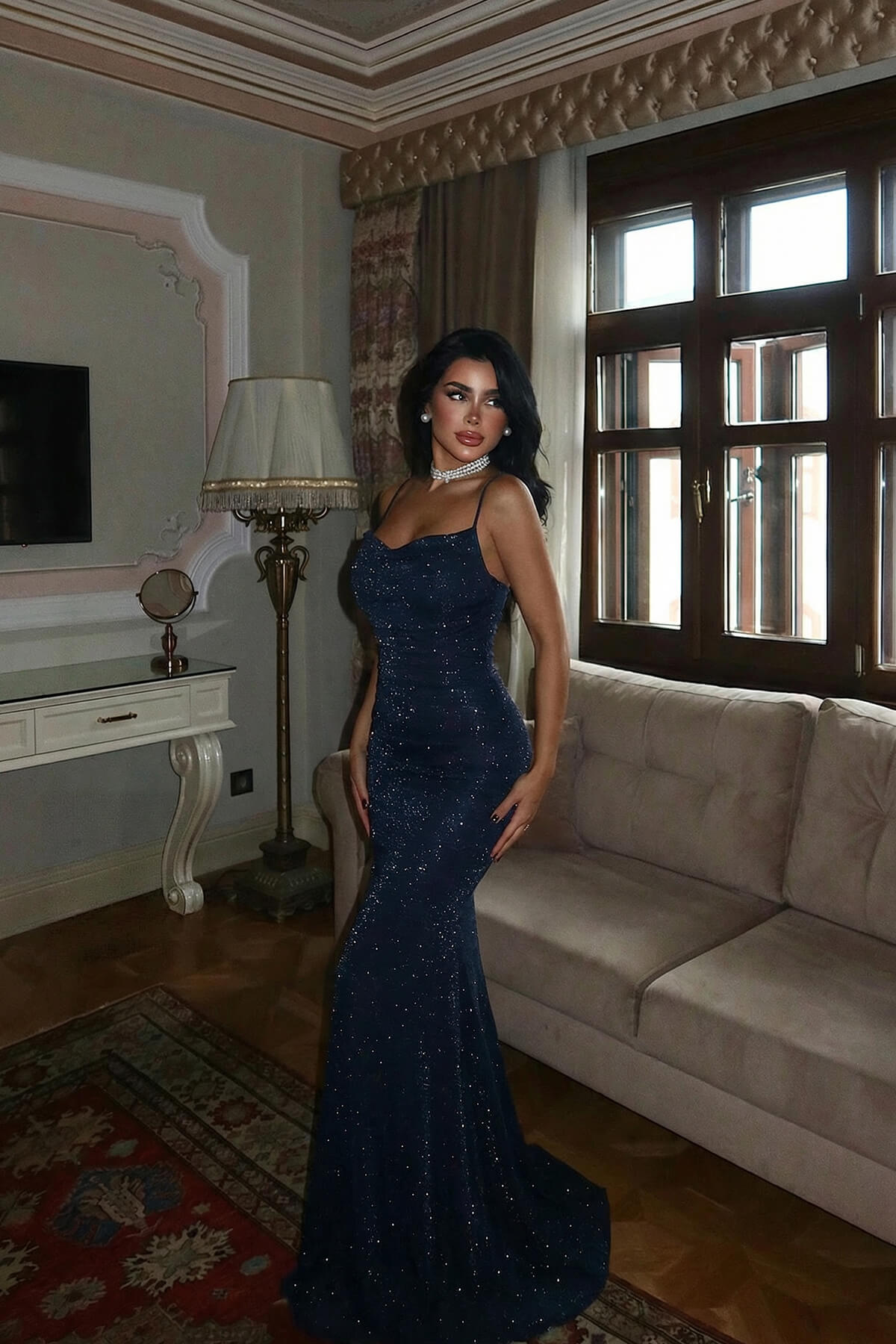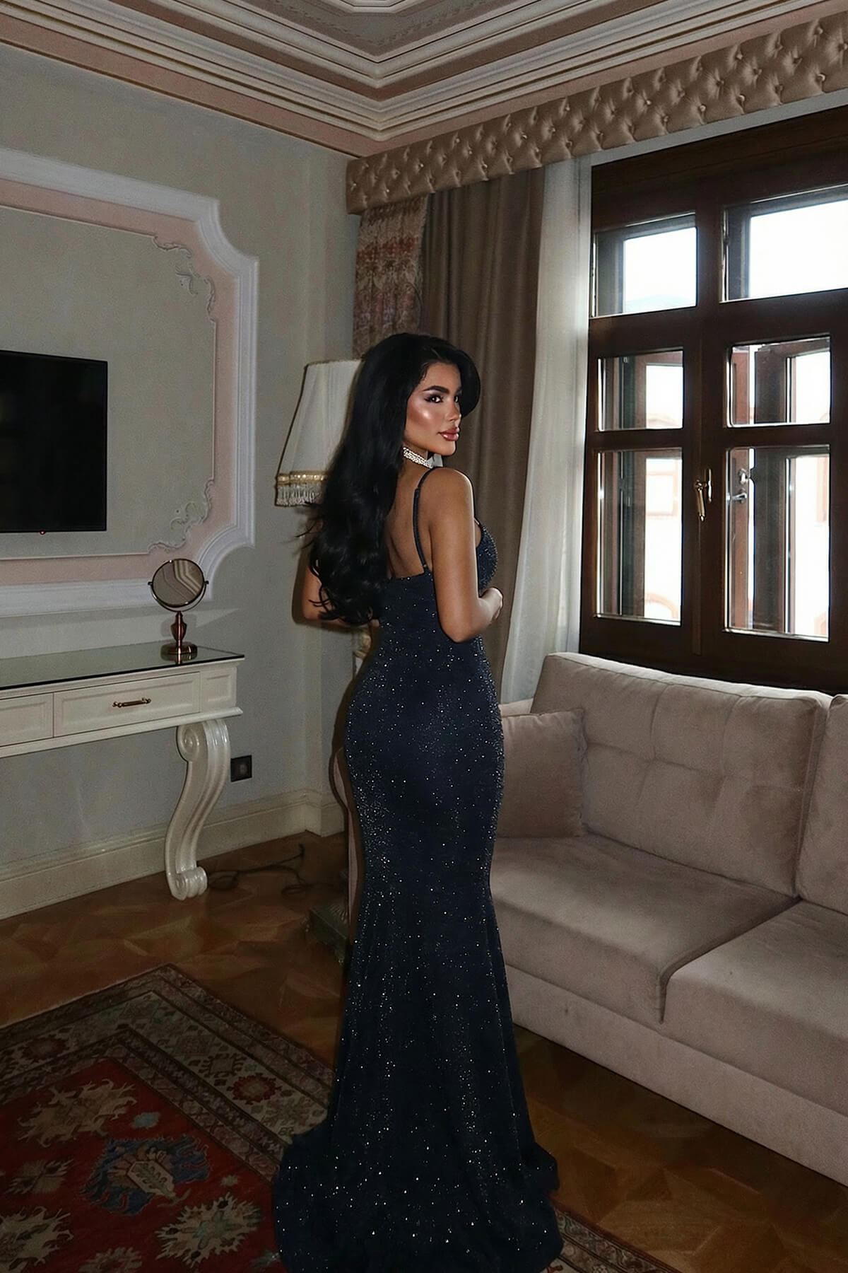 Askılı kesimi ve vücuda oturan formuyla zarif bir siluet sunan uzun abiye elbise, simli dokusuyla ışıltılı ve şık bir görünüm kazandırır. Üst kısmın sade ve feminen duruşu, etek bölümündeki akıcı form ile dengelenerek özel davetler ve gece organizasyonları için etkileyici bir stil oluşturur.