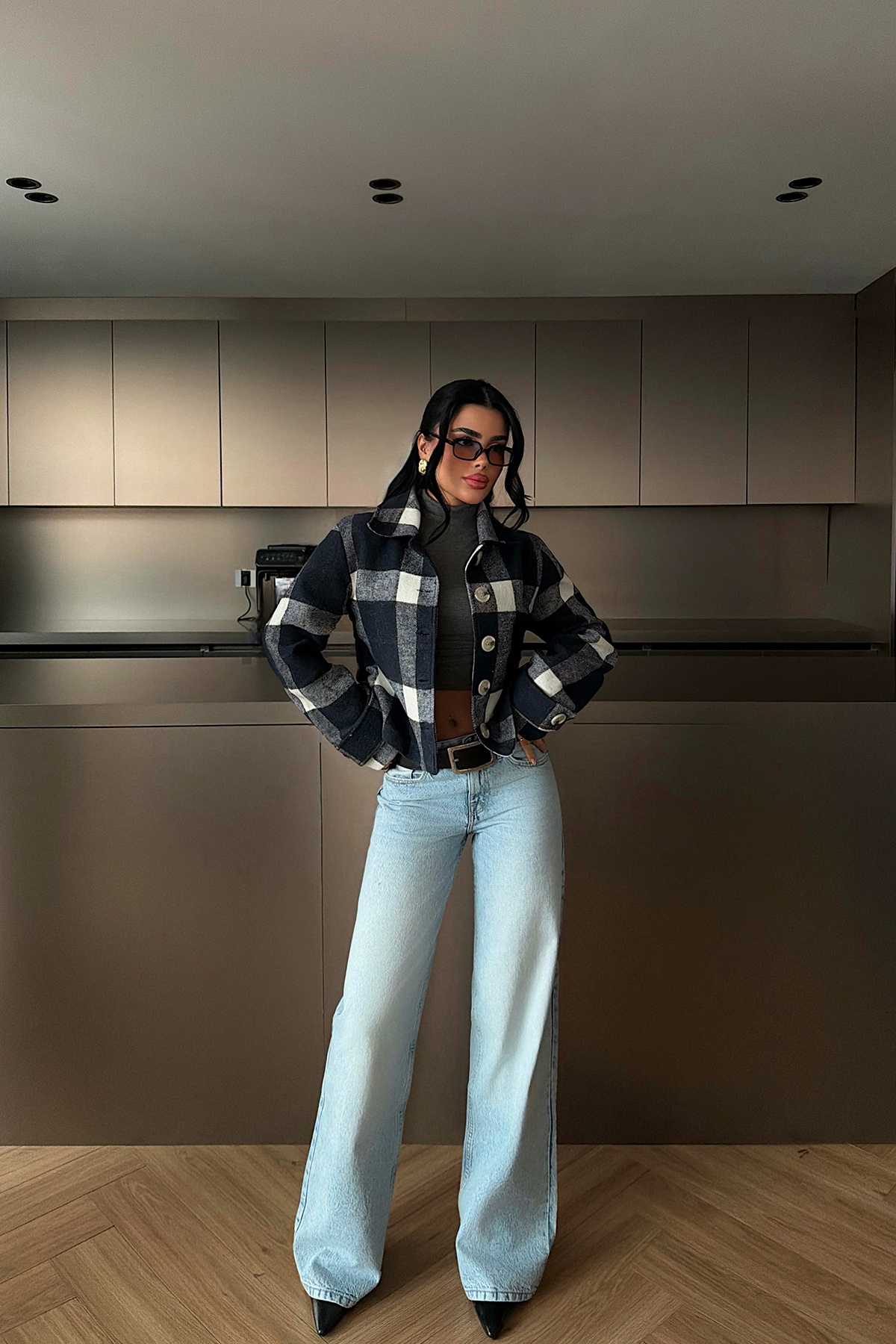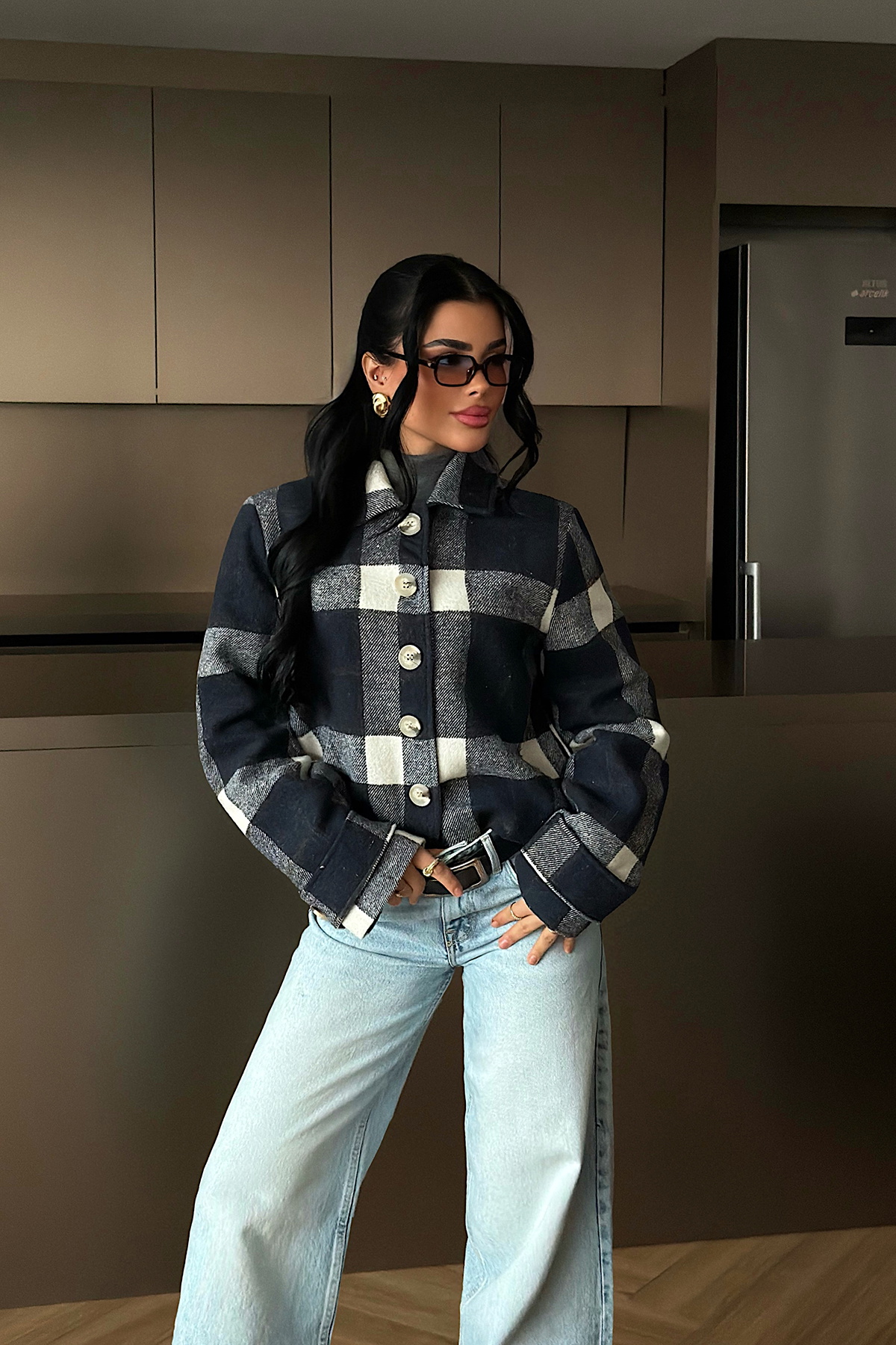 Ekose desenli yapısı ve kısa kesimiyle öne çıkan ceket, tok duruşu sayesinde modern ve net bir siluet sunar. Düğmeli tasarımı ve rahat kalıbı ile günlük şehir kombinlerinden şık stillere kadar çok yönlü kullanım sağlar.