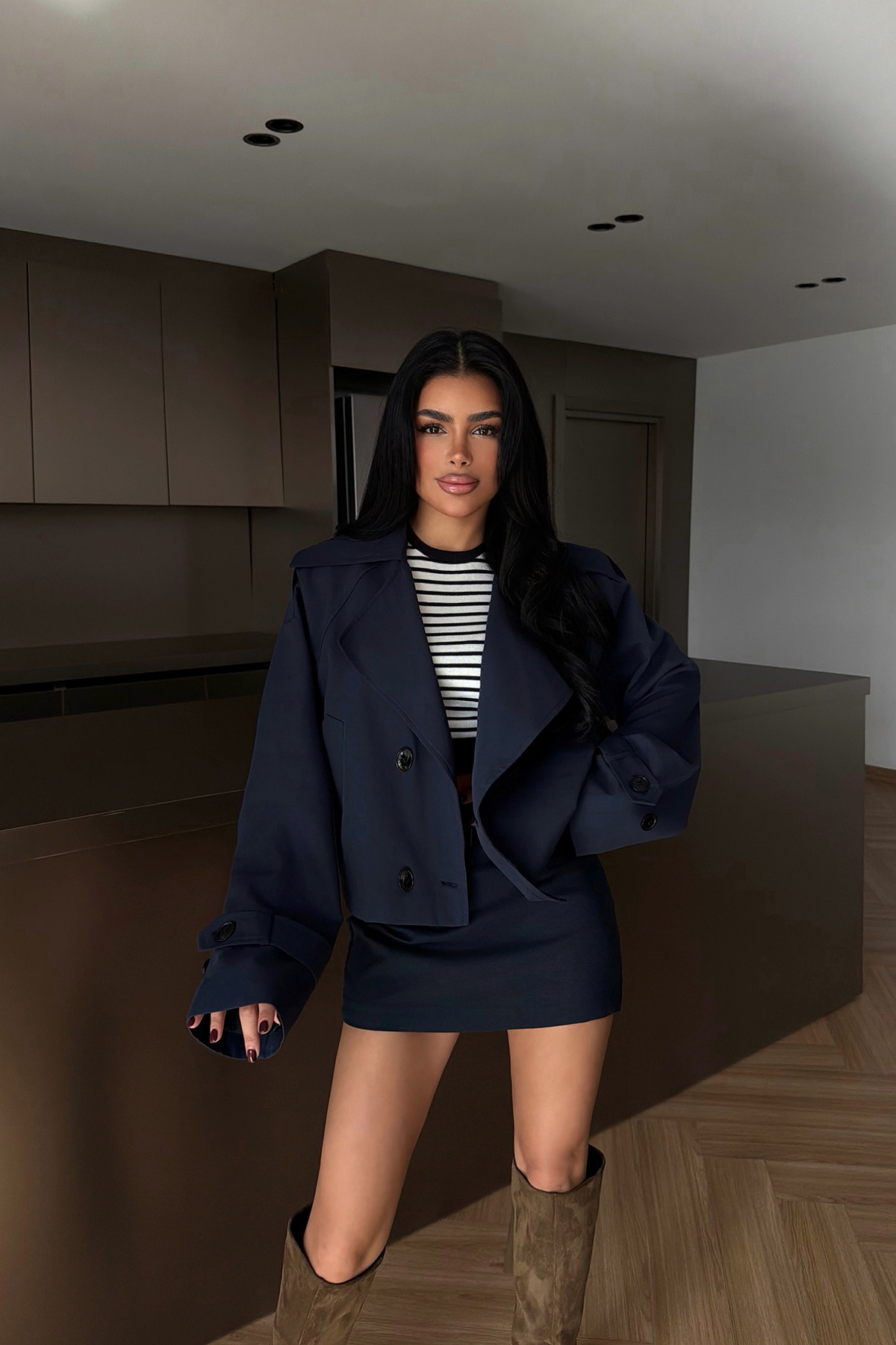 Derin lacivert rengindeki bu kısa ceket, klasik duruşuyla modern stilin buluştuğu noktada duruyor. Hem formel hem casual kombinlere uyum sağlarken, tek parça ile şık ve etkili bir görünüm oluşturabilirsiniz.