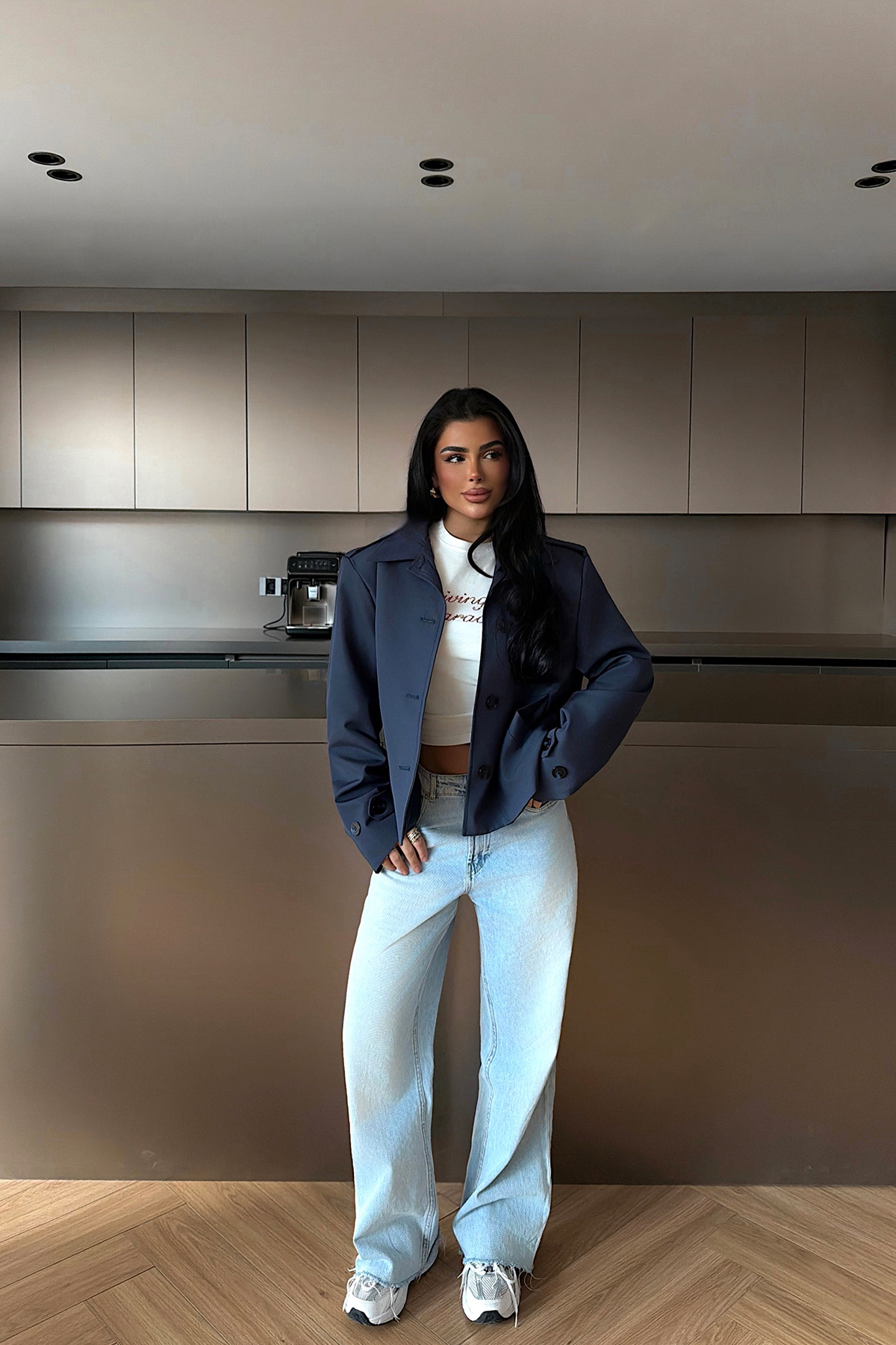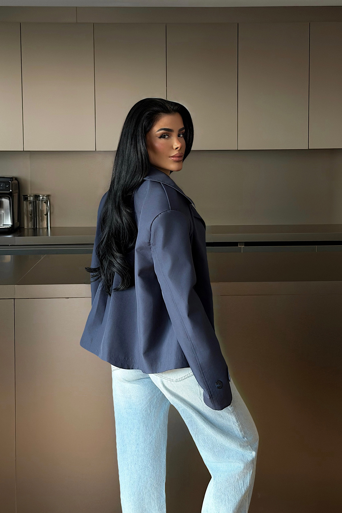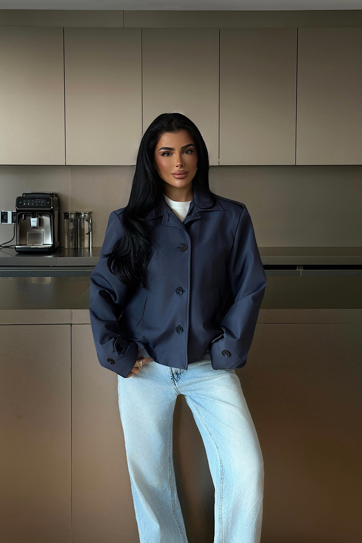 Düğmeli tasarımı ve kısa kesimiyle öne çıkan trençkot, tok dokulu yapısı sayesinde modern ve net bir siluet sunar. Geniş yaka formu ve rahat kalıbı şehir stilinde hem günlük hem de şık kombinlerle kolayca uyum sağlar.