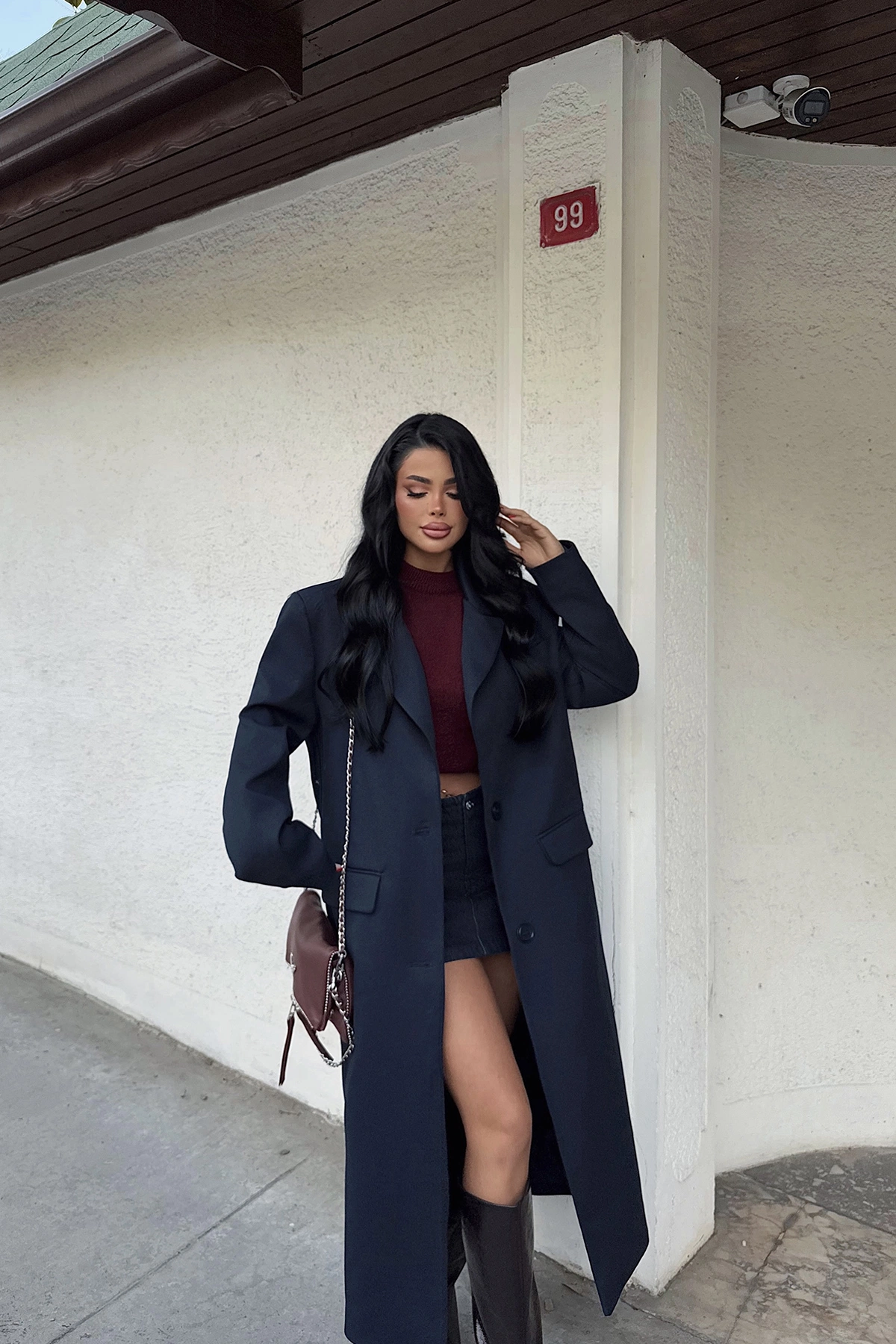 Lacivert Önü Düğmeli Cep Detay Kaban