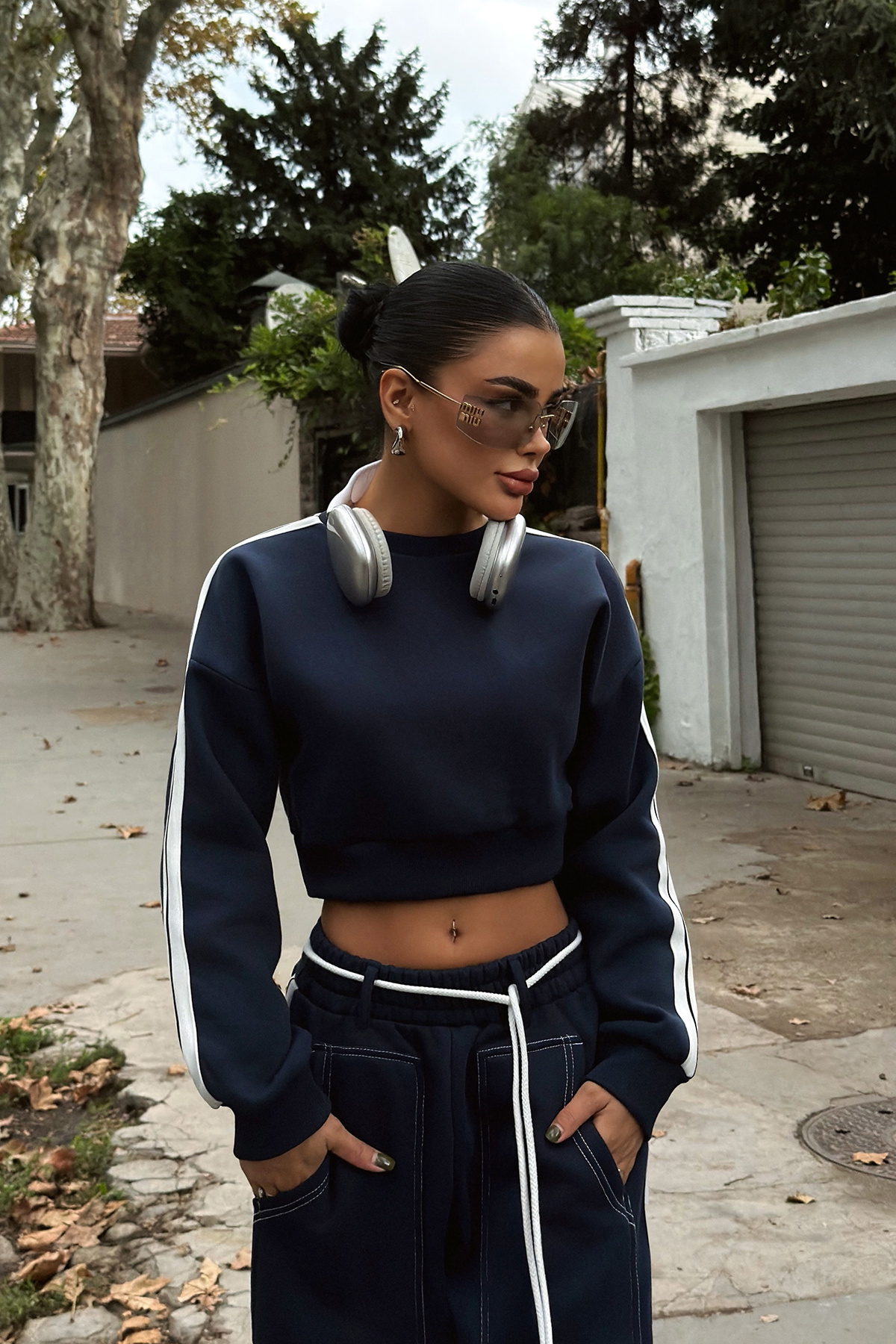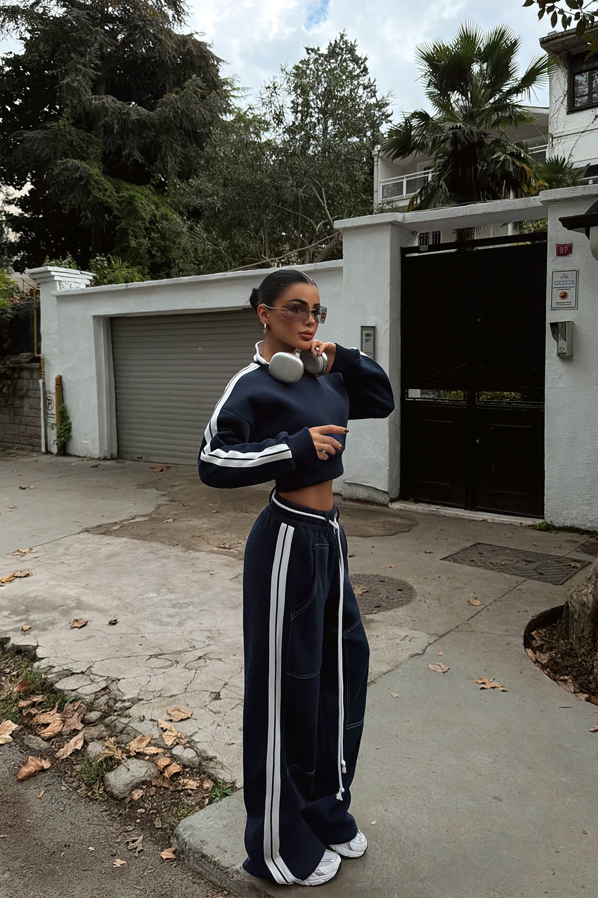 Minimal çizgilerle modern bir duruş yakalamak isteyenler için tasarlanan Lacivert Pantolonlu Takım, hem konforlu hem trend bir görünüm sunuyor. Esnek kumaş dokusu ve rahat kalıbı sayesinde gün boyu hareket özgürlüğü sağlarken, beyaz şerit detayları ile sportif enerjiyi vurguluyor.