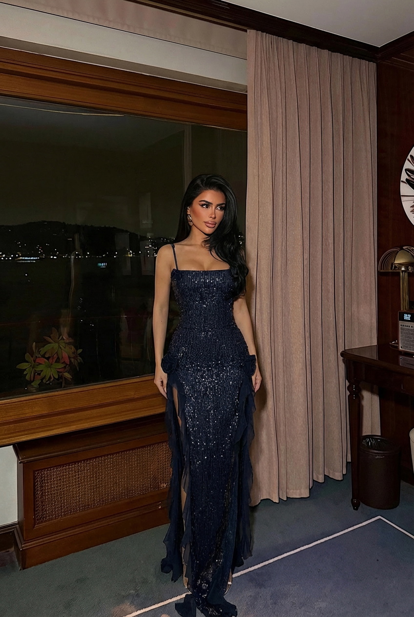 Lacivert Paxton Payetli Uzun Yırtmaçlı Elbise