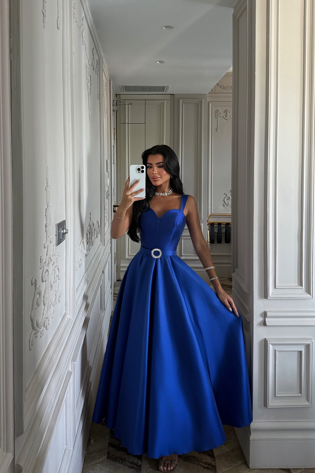 Lacivertin canlılığını taş toka detaylarıyla taçlandıran Lindsay Abiye Elbise, her davetin gözdesi olmaya adaydır. İnce askıları, vücuda oturan kesimi ve taş toka süslemeleri ile feminen bir siluet sunar. Işıltılı tokalar, elbiseye zarif bir dokunuş katarken dikkatleri üzerinize çeker.