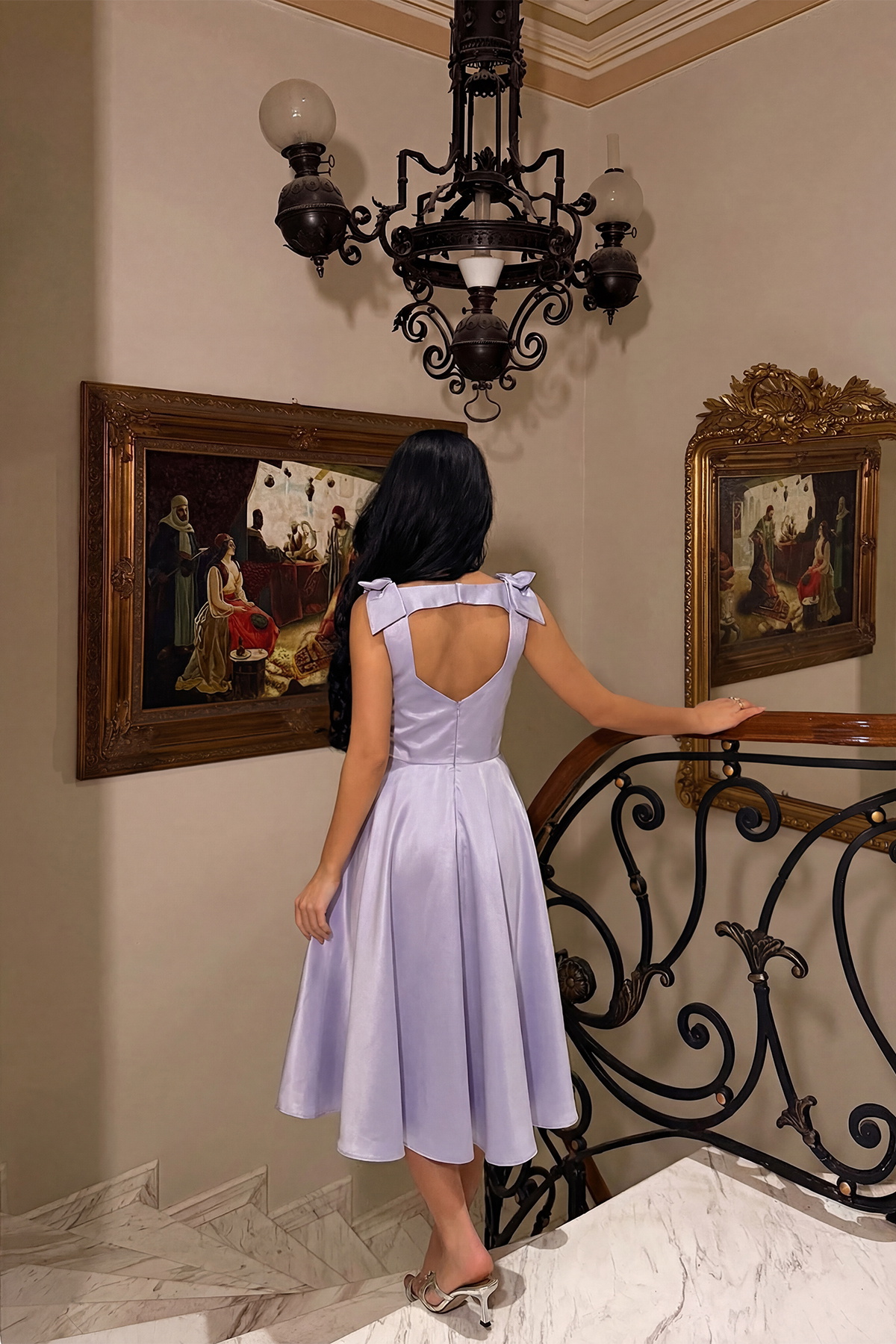 Omuz kısmındaki fiyonk detayıyla öne çıkan bu abiye elbise, belden oturan kalıbı ve diz altına doğru dökülen eteğiyle feminen bir siluet sunar. Akıcı saten dokulu kumaşı, ışıkta zarif bir parlaklık kazandırırken hareket halinde yumuşak bir akış sağlar.