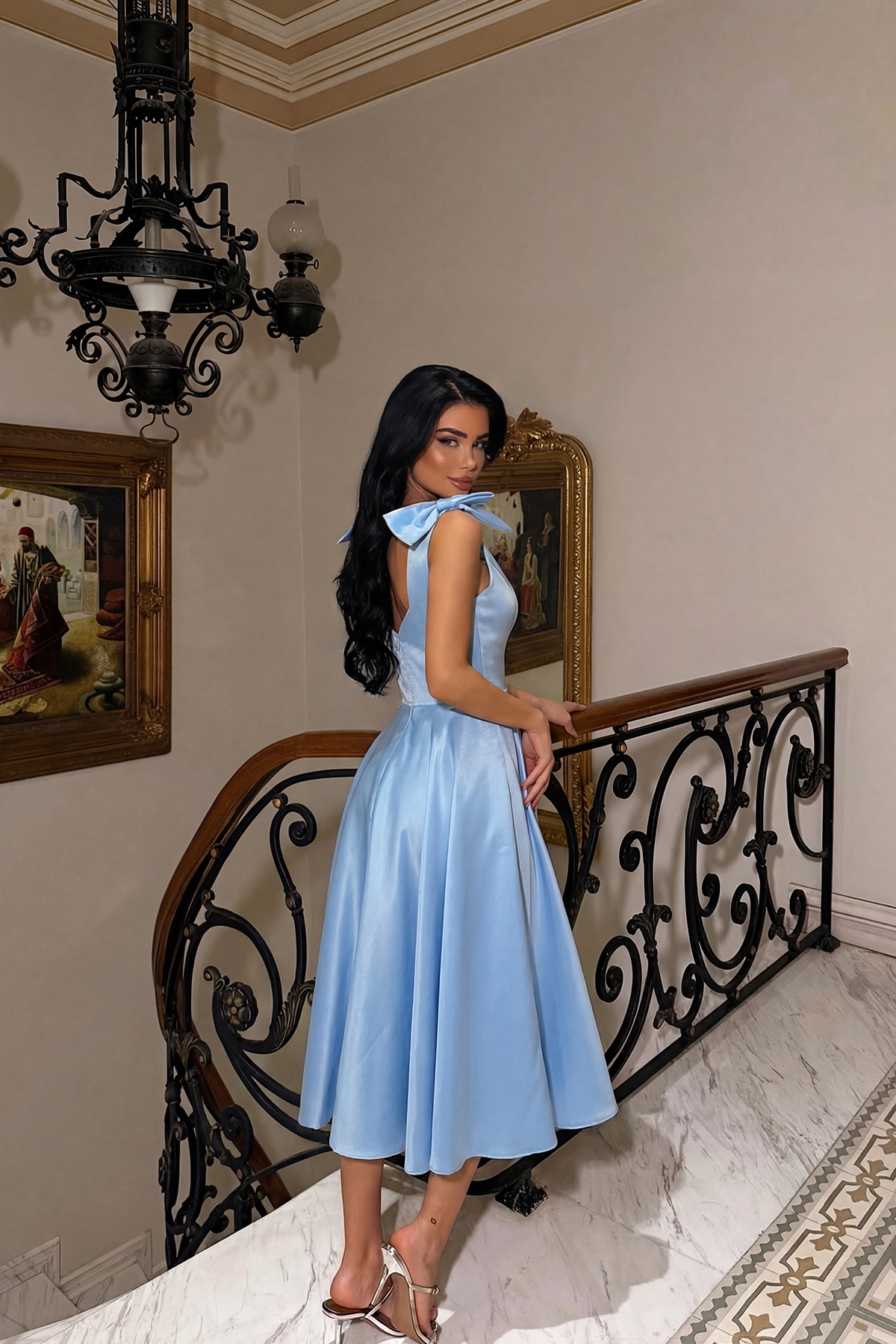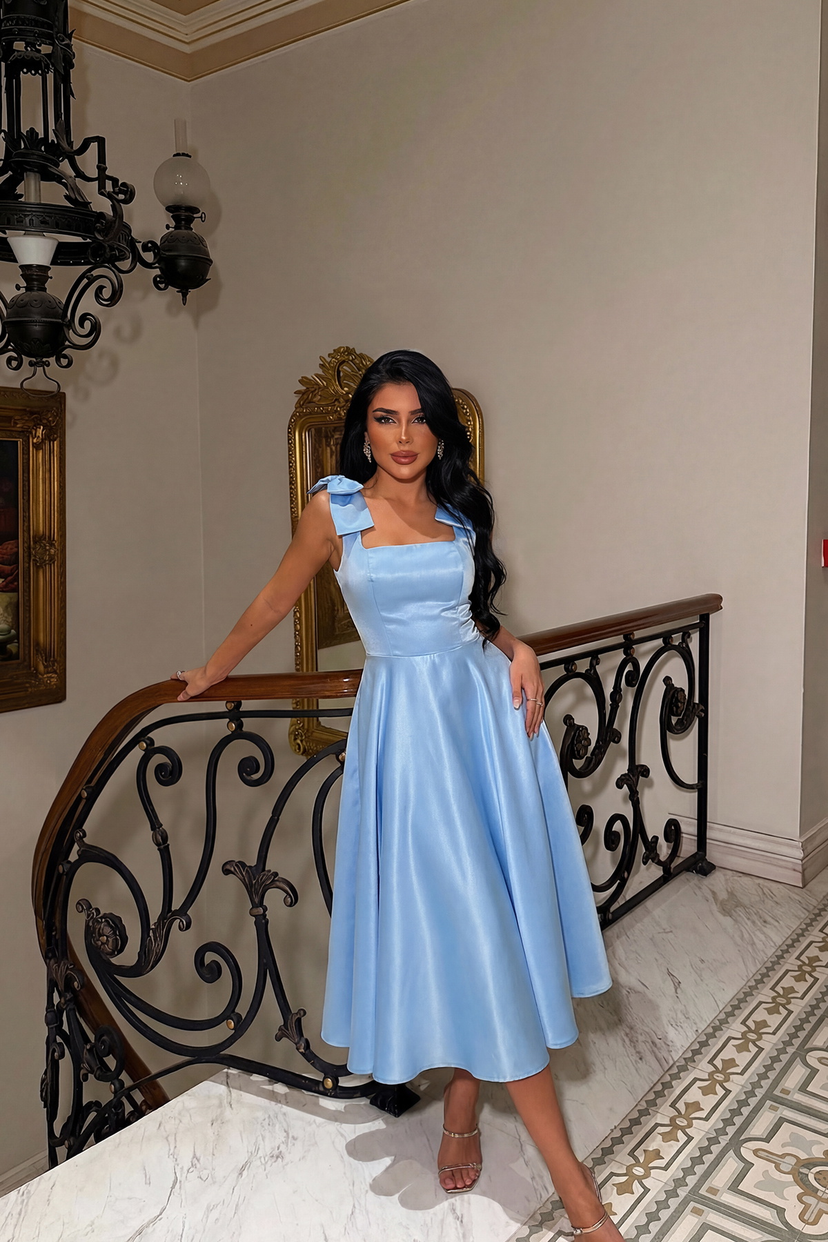 Omuz kısmındaki fiyonk detayıyla öne çıkan bu abiye elbise, belden oturan kalıbı ve diz altına doğru dökülen eteğiyle feminen bir siluet sunar. Akıcı saten dokulu kumaşı, ışıkta zarif bir parlaklık kazandırırken hareket halinde yumuşak bir akış sağlar.