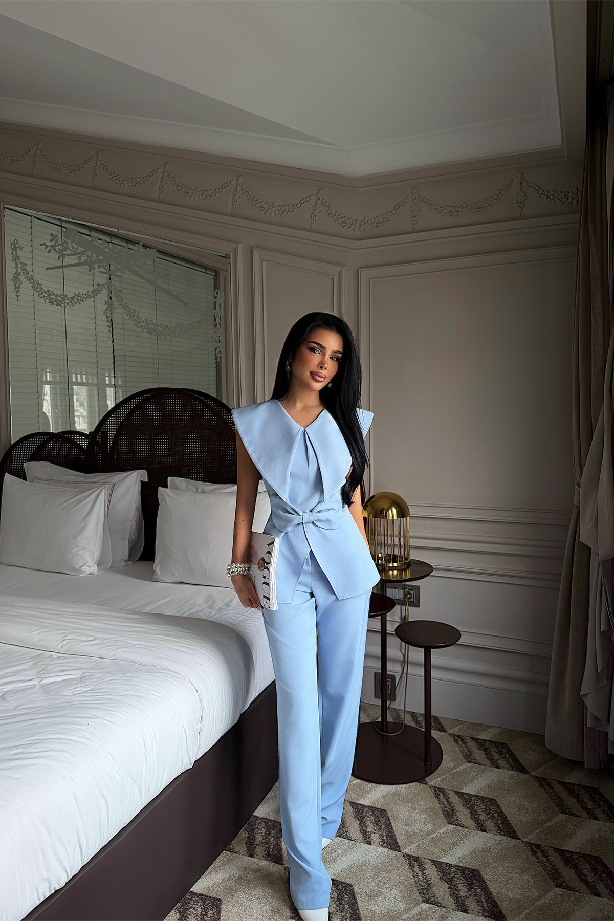 Tok ve formunu koruyan kumaşıyla öne çıkan bu takım, üst ve alt parçadan oluşur. Üst parçada yer alan fiyonk detayı tasarıma feminen bir vurgu katarken, keskin omuz hattı ve düz düşen form daha güçlü bir görünüm sağlar. Ön kısmındaki katlı yapı hareket kazandırırken, sade ve net bir duruş sunar.