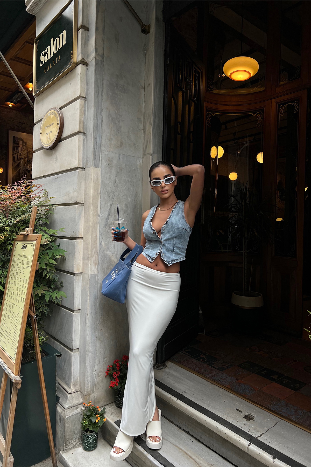 Blue Jean Buttoned Waistcoat  in this photo is S size.
