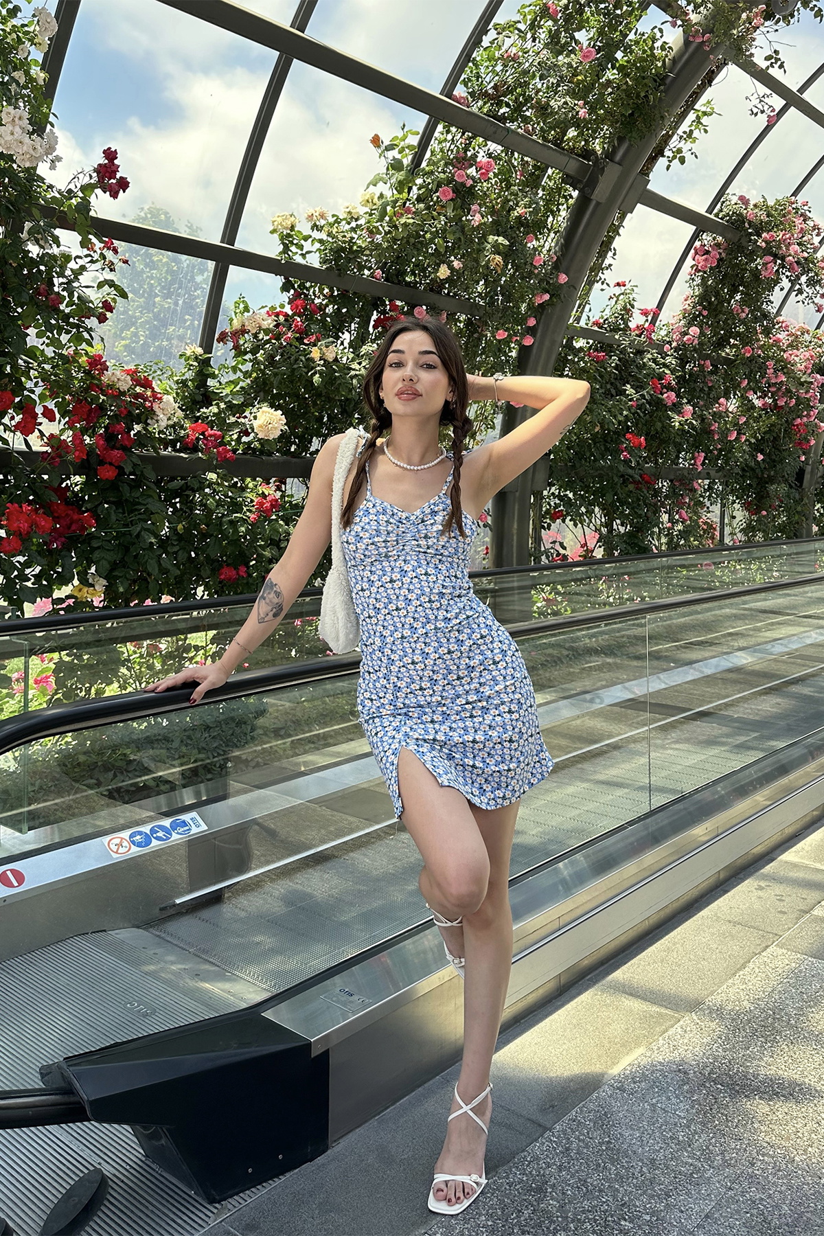 Mavi Yırtmaç Detay Çiçekli Elbise