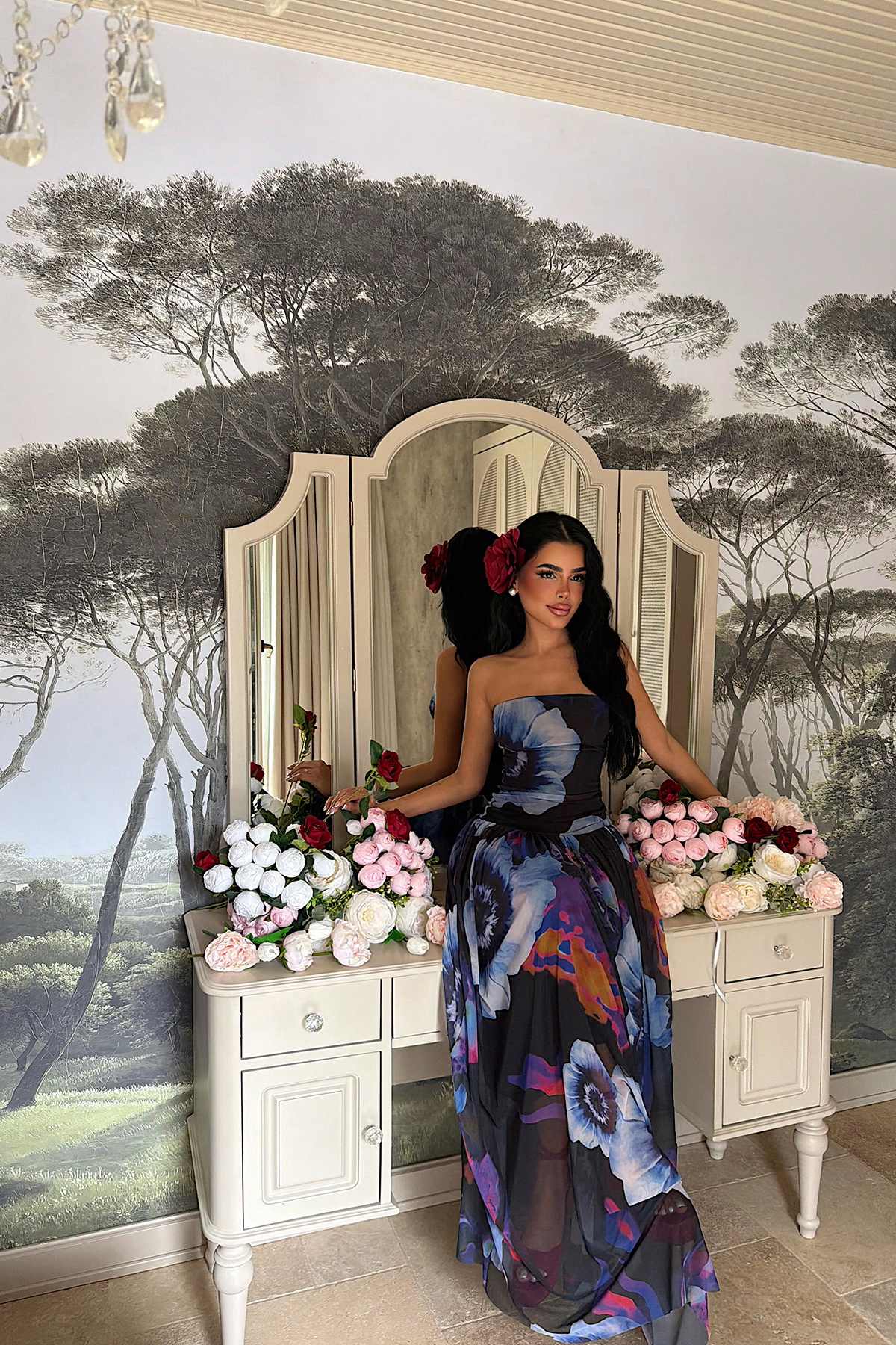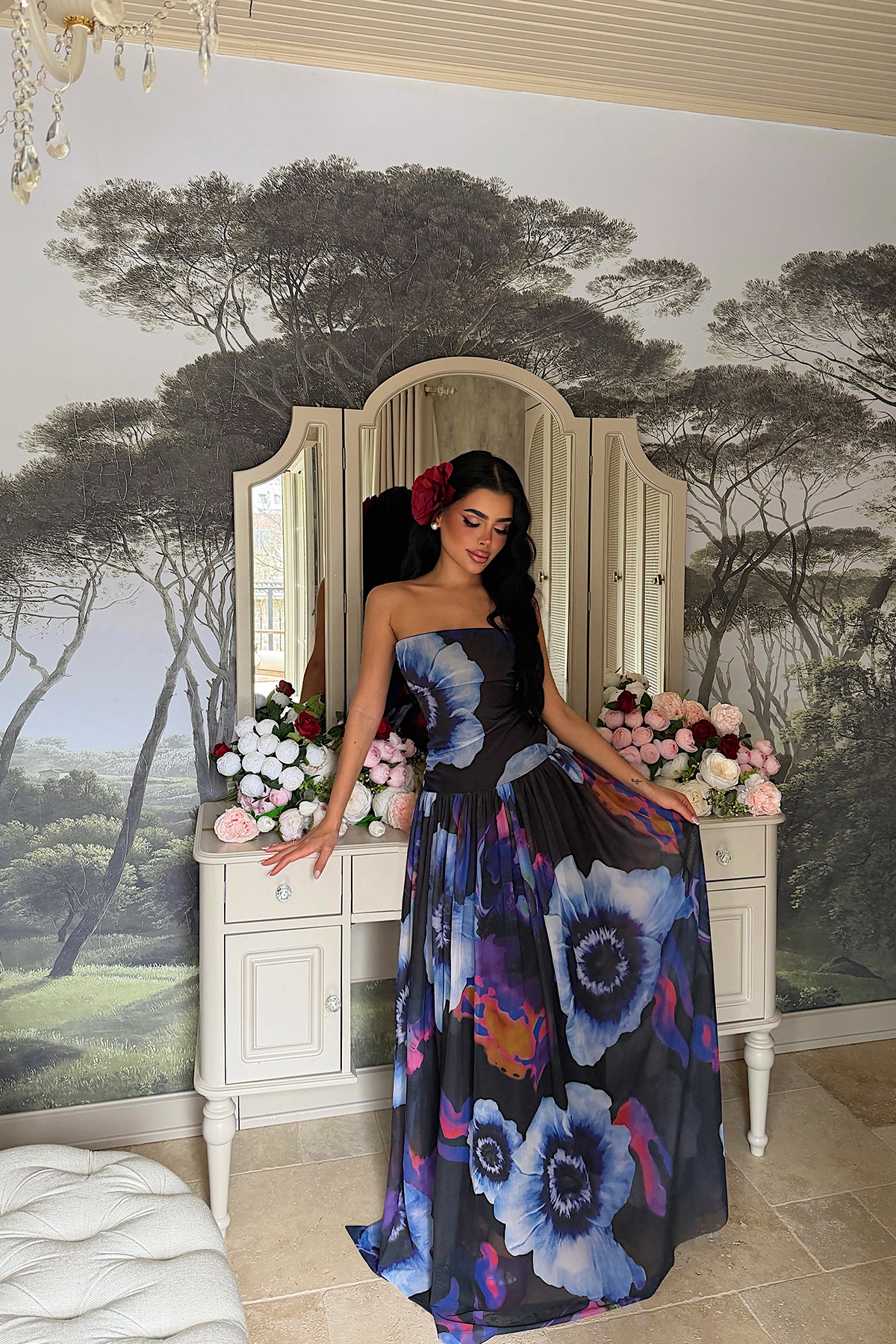 Canlı ve dikkat çekici deseniyle öne çıkan bu straplez uzun elbise, modern ve zarif bir siluet sunar. Omuzları açıkta bırakan straplez form, üst bedeni ön plana çıkarırken; vücuda oturan üst kısmı beli dengeli şekilde vurgular. Belden aşağı doğru genişleyen etek kesimi ise elbiseye akıcı ve hareketli bir görünüm kazandırır.