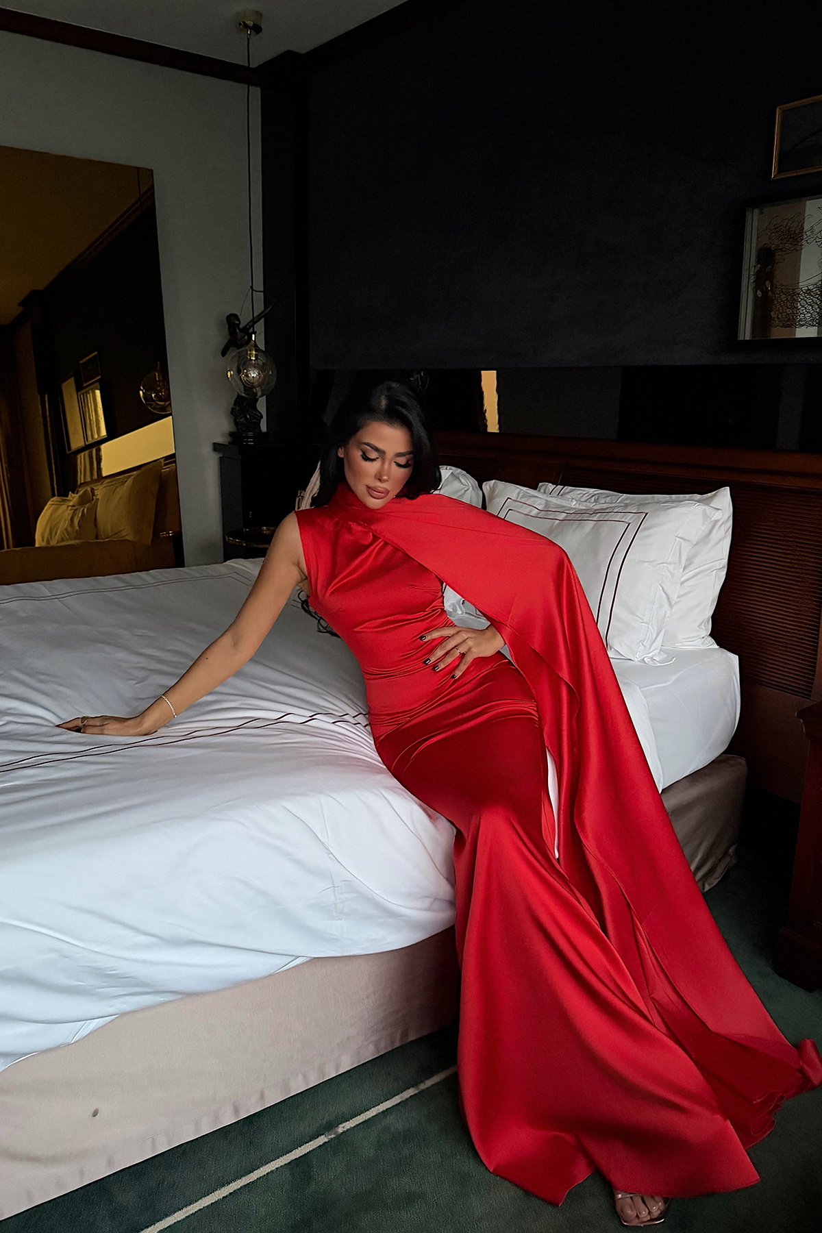 Nar çiçeği tonunda, kuşak detaylı uzun elbise, zarif ve feminen bir siluet sunar. Bel bölgesinde yer alan kuşak, elbiseye hem şekil kazandırır hem de nar çiçeği renginin romantik vurgusunu öne çıkarır.