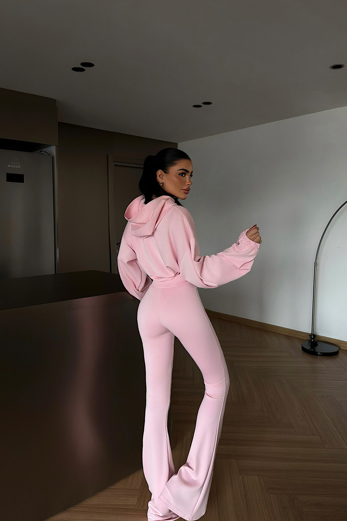 Üst parça kısa formda ve kapüşonlu tasarıma sahip olup uzun kollu, dökümlü yapısıyla dengeli bir görünüm oluşturur. Alt parça yüksek bel ve hafif geniş paça kesimiyle vücut formunu uzatan bir duruş sağlar. Kumaşı esnek ve yumuşak dokulu; dikişleri temiz, kalıbı rahattır.